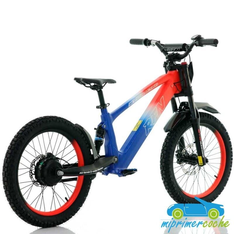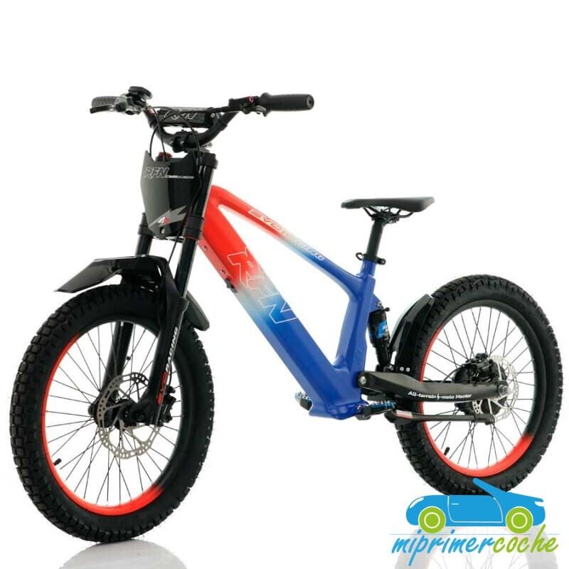 Bicicleta eléctrica para niños RFN EVO 20 pulgadas 36V 750W, con velocidad máxima de 35 km/h, limitador de velocidad, batería de litio extraíble, asiento ajustable y frenos de discos. Ideal para diversión segura y controlada.
