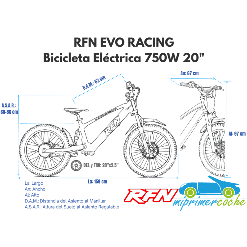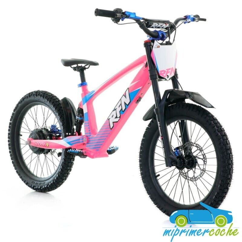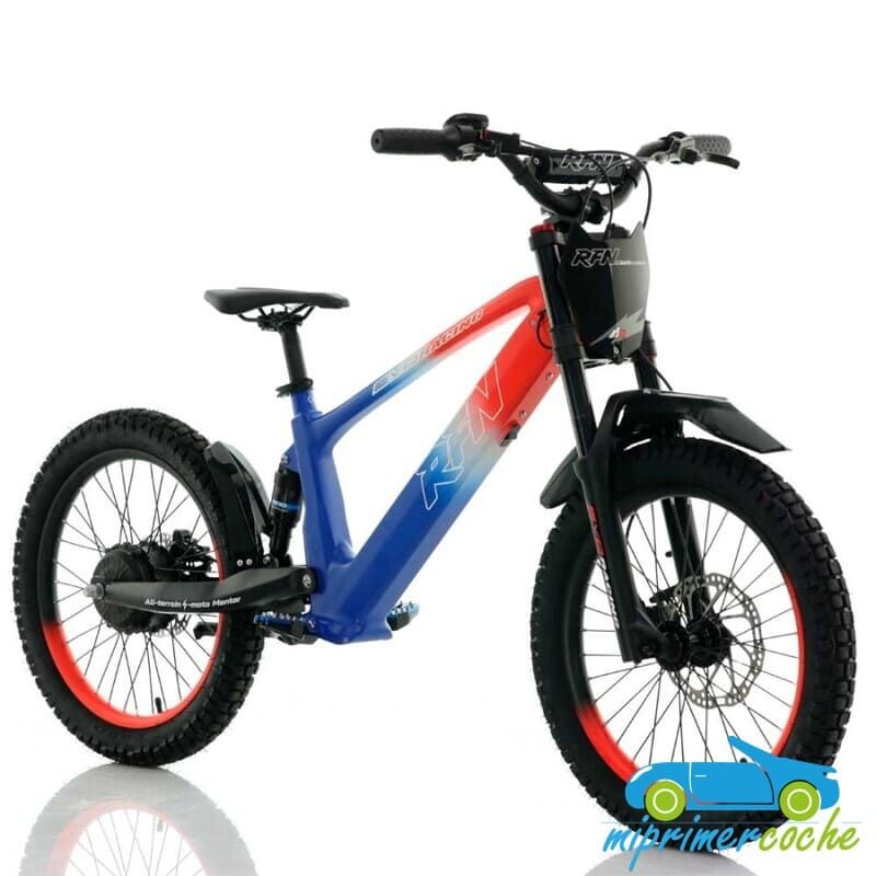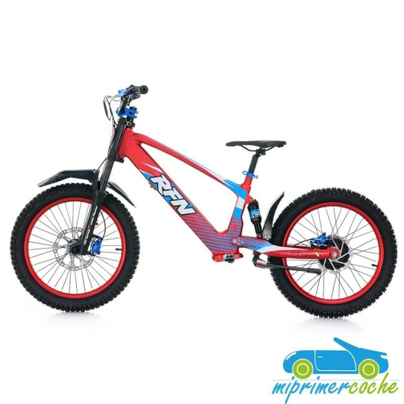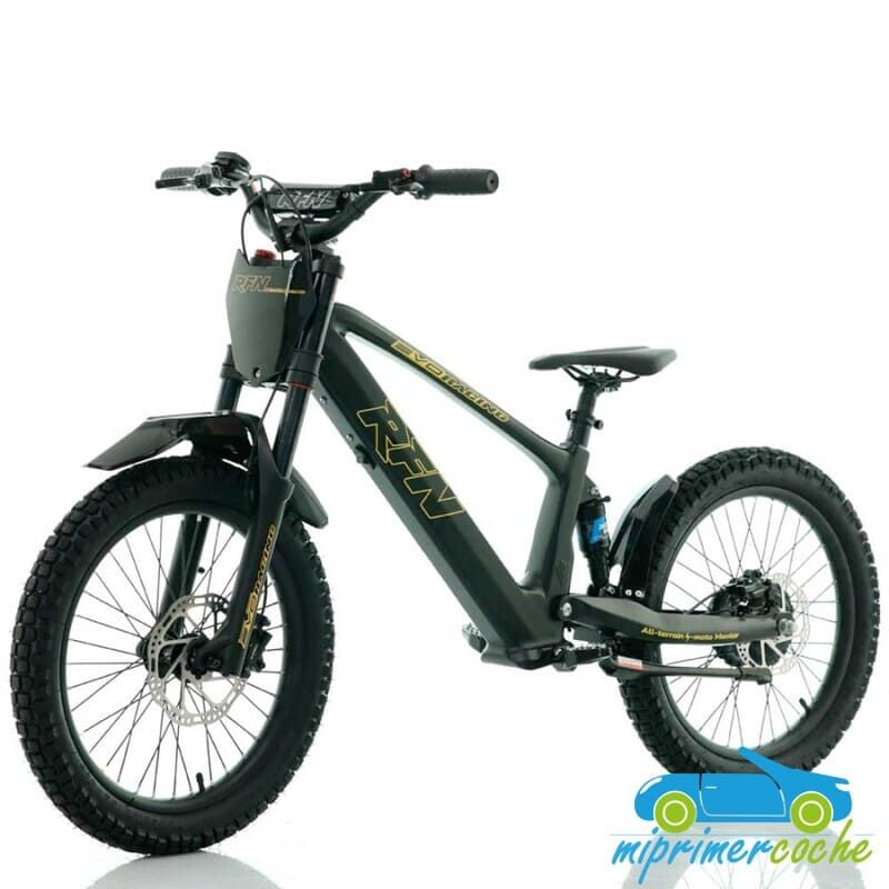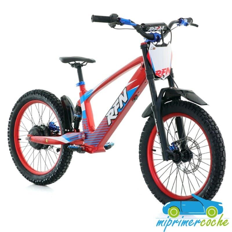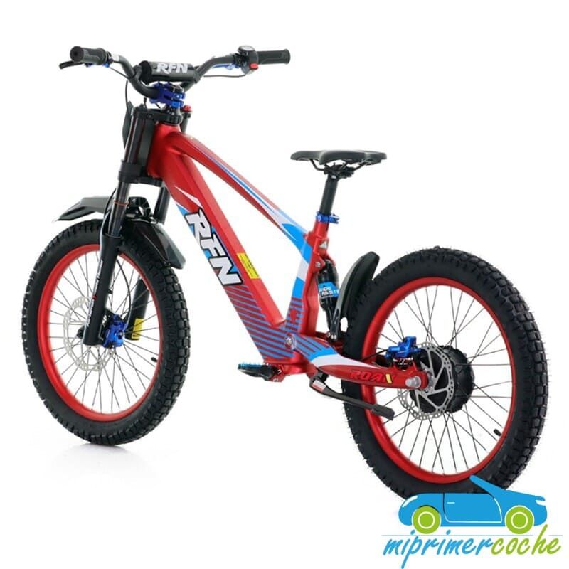 Bicicleta eléctrica para niños RFN EVO 20 pulgadas 36V 750W, con velocidad máxima de 35 km/h, limitador de velocidad, batería de litio extraíble, asiento ajustable y frenos de discos. Ideal para diversión segura y controlada.