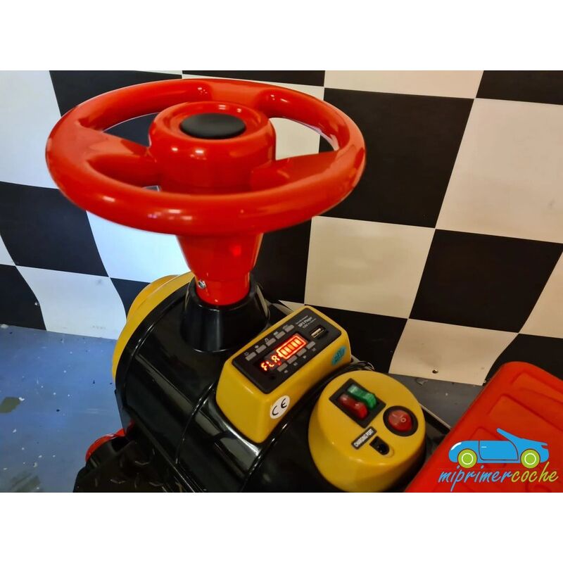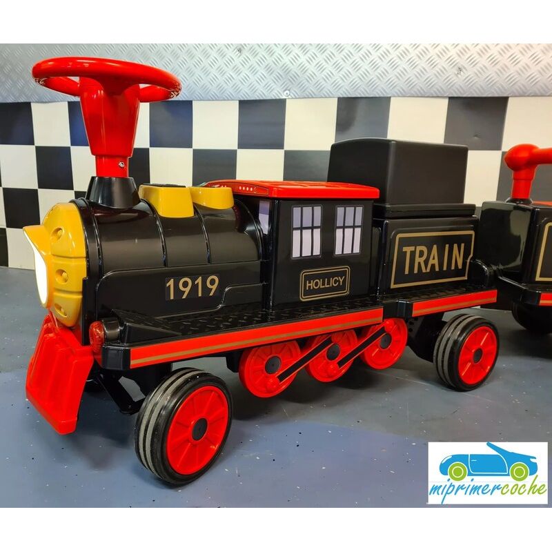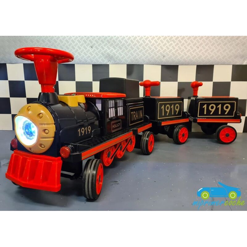 Tren electrico infantil con 3 plazas y 2 vagones desmontables. Equipado con 4 motores (180W), batería 12V de hasta 90 min de juego, luces delanteras y sonido real de locomotora. Incluye conexión MP3, USB y SD. Seguro y resistente (hasta 100 kg), recomendado para niños desde 3 años.