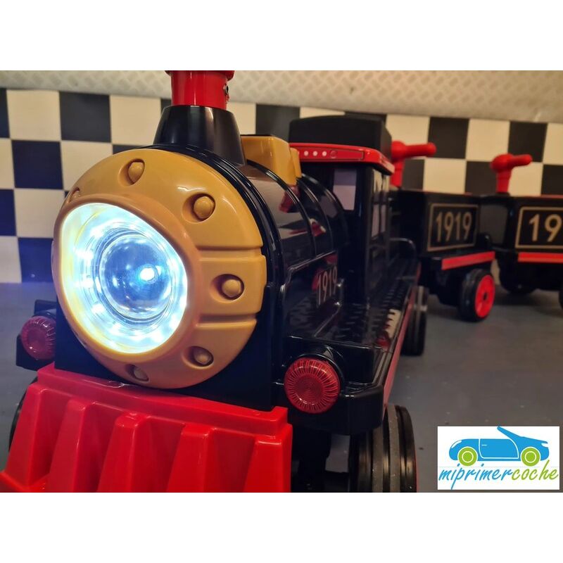 Tren electrico infantil con 4 plazas y 2 vagones desmontables. Equipado con 4 motores (180W), batería 12V de hasta 90 min de juego, luces delanteras y sonido real de locomotora. Incluye conexión MP3, USB y SD. Seguro y resistente (hasta 100 kg), recomendado para niños desde 3 años.