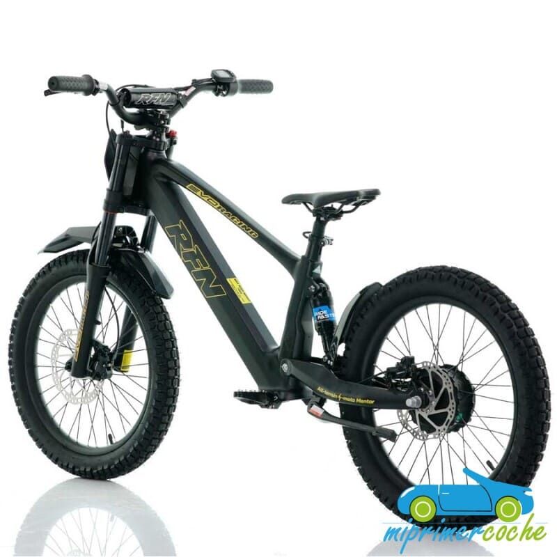 Bicicleta eléctrica para niños RFN EVO 20 pulgadas 36V 750W, con velocidad máxima de 35 km/h, limitador de velocidad, batería de litio extraíble, asiento ajustable y frenos de discos. Ideal para diversión segura y controlada.