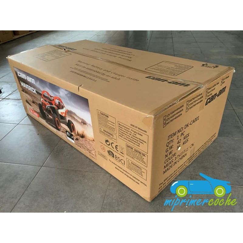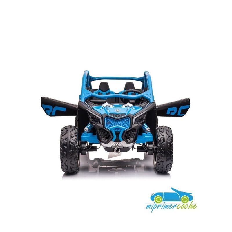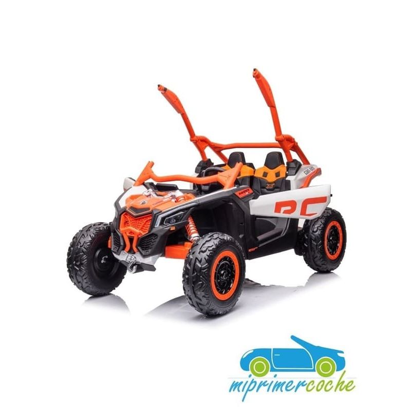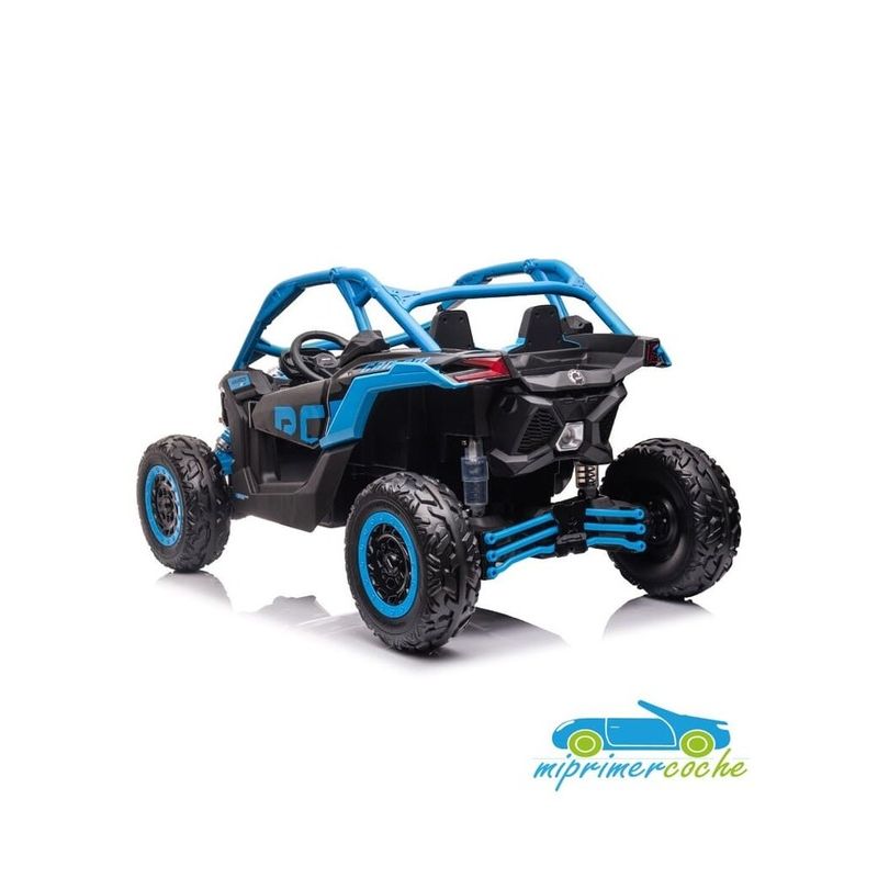 El coche eléctrico para niños TODOTERRENO ELÉCTRICO BUGGY CAN-AM 24V 2 PLAZAS es un coche potente con 4 motores 24V200W por cada unidad, dando la posibilidad para alcanzar la velocidad de 10 km/h. Está equipado con mando distancia 2.4G, ruedas de caucho, 2 asientos de piel, suspensión en cada rueda, equipo de música, luces LED, pantalla video mp4 para reproducir videos.