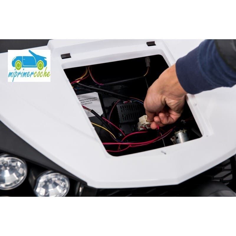 · 2 baterías 12 V7Ah ( 24v)· tiempo de carga : una vez montado y comprobar que el coche funciona , debe conectarse a la corriente eléctrica con su cargador y la primera carga tiene que ser de 4-5 horas , las demás cargas de 8 a 10 horas para una carga completa . Nunca no debe pasar mas de 12 horas en carga y nunca no agotar la batería al máximo .