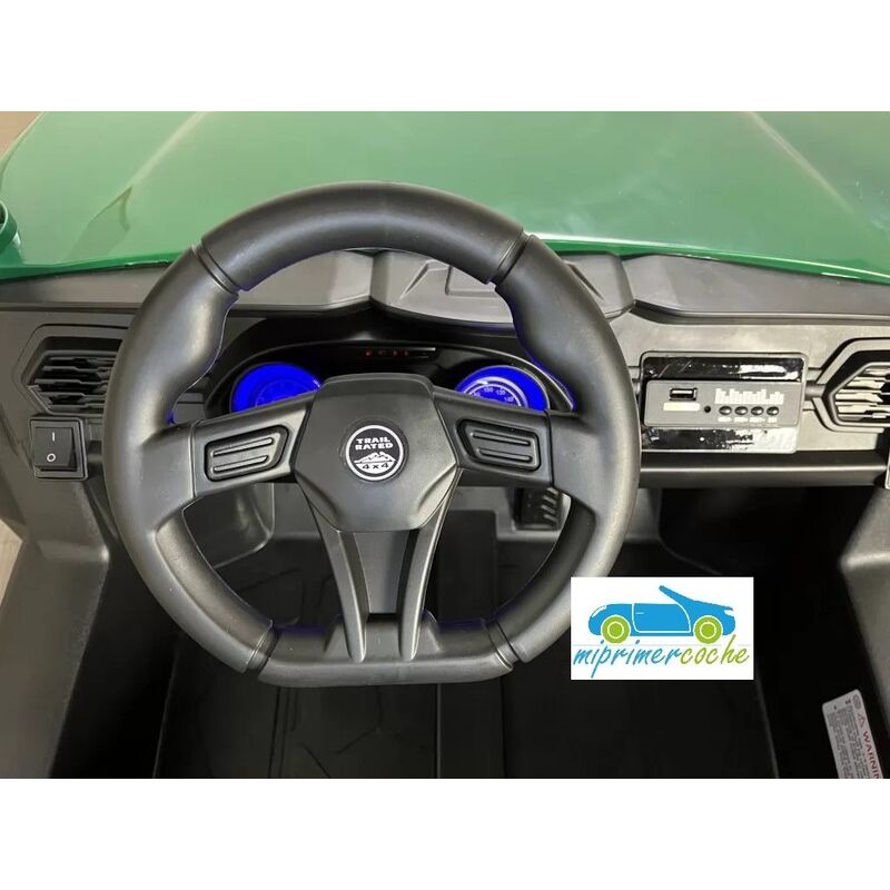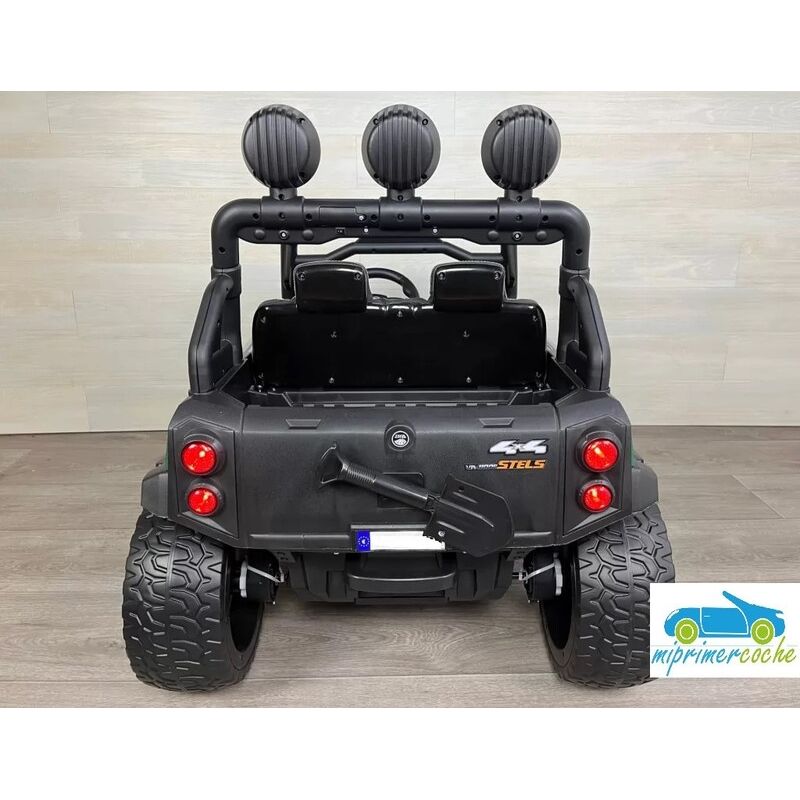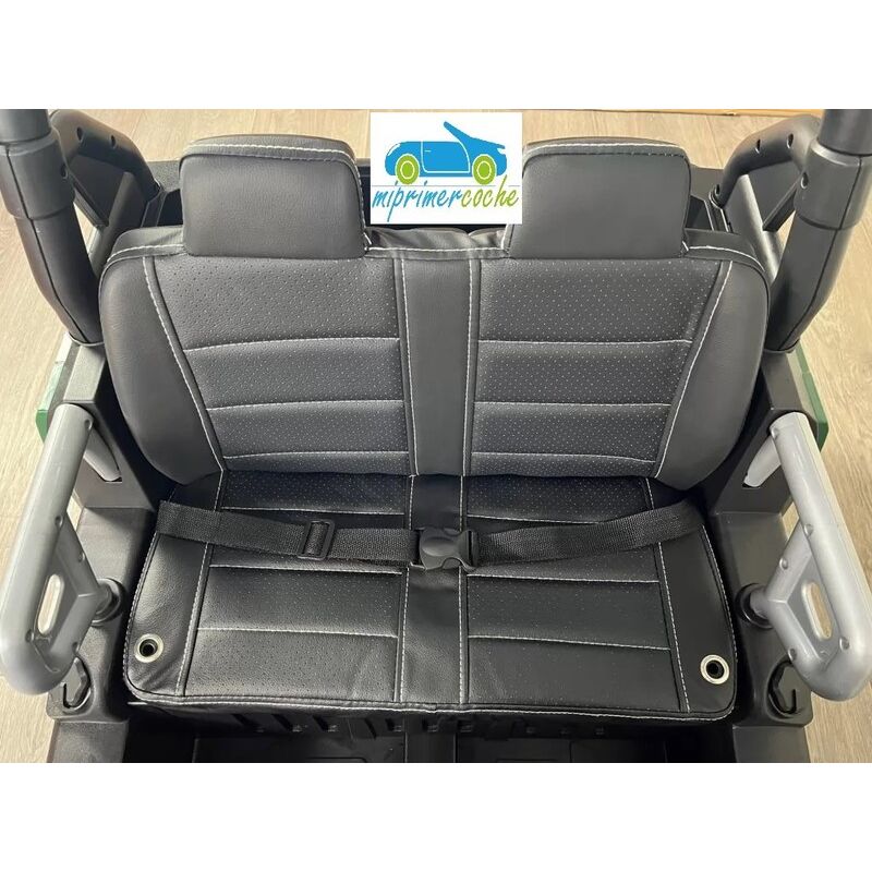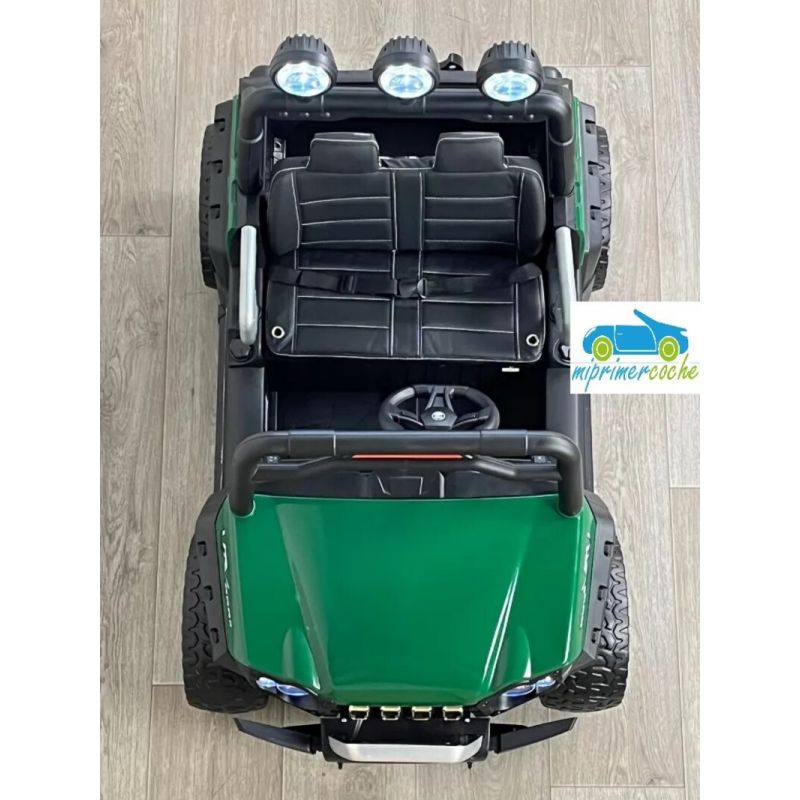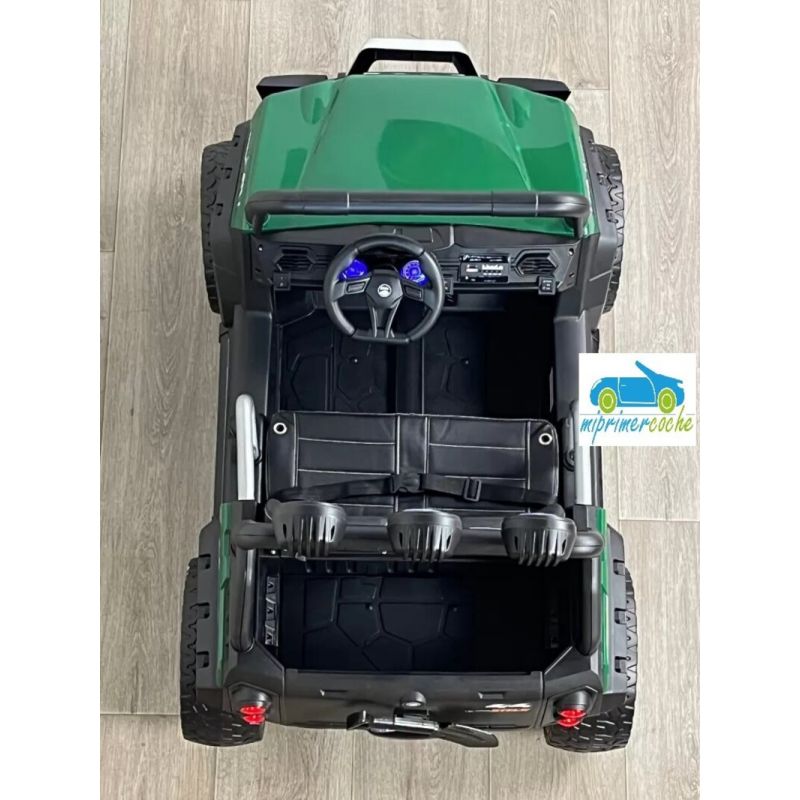 Un coche eléctrico para niños con 2 plazas , 4 motores de 12v, ruedas de caucho , asiento en polipiel , asa para el transporte y lo más destacado el sistema balancín que hace que el coche se mueva hacia adelante y hacia atrás .