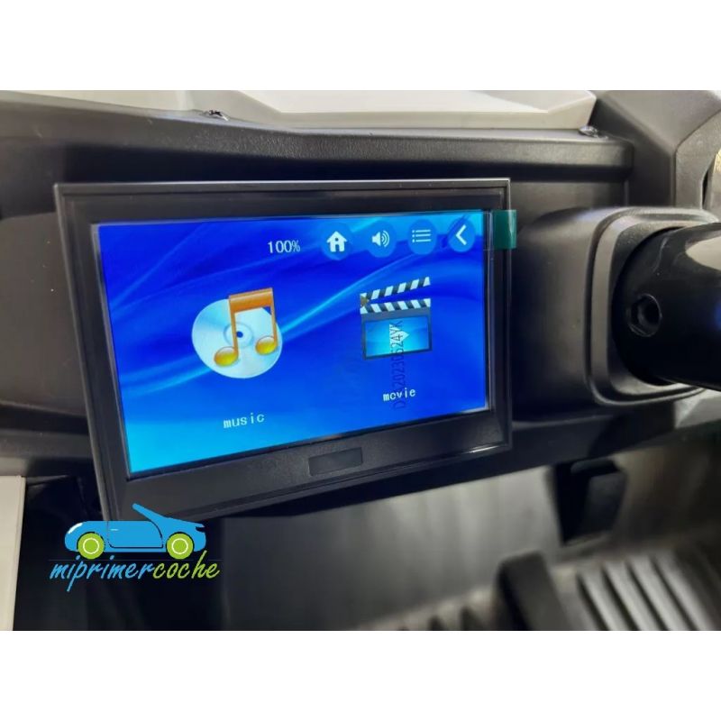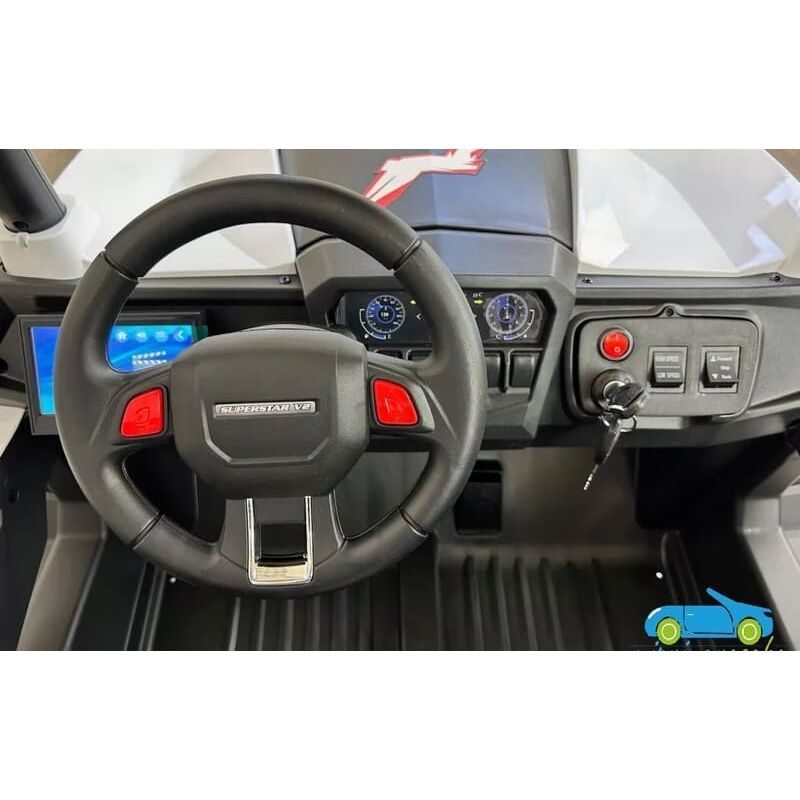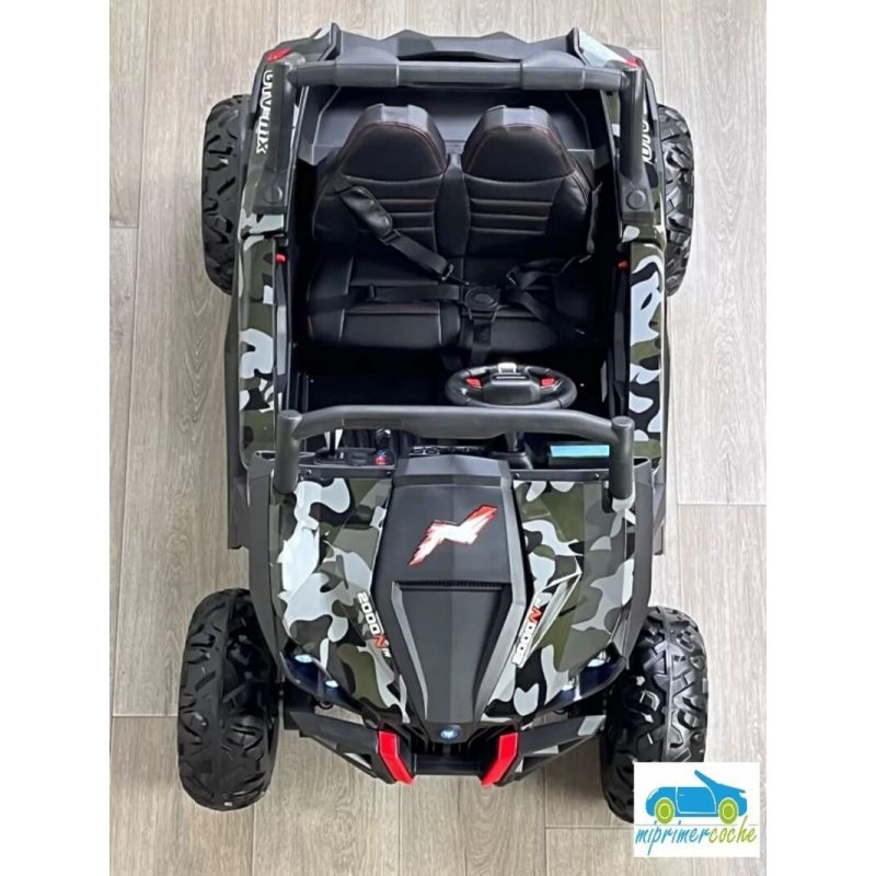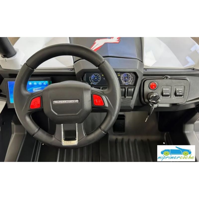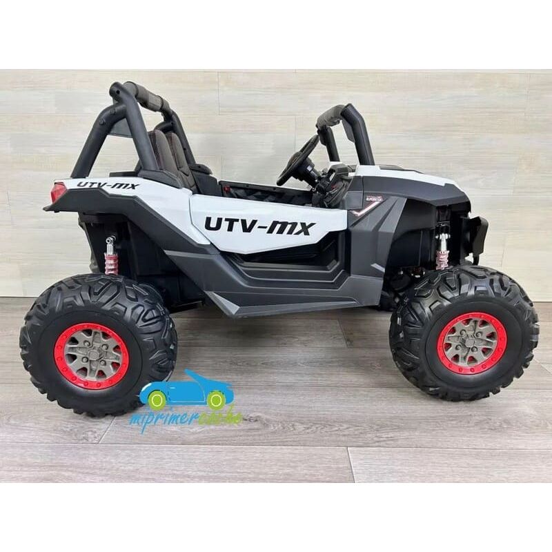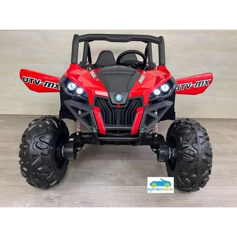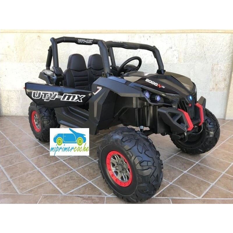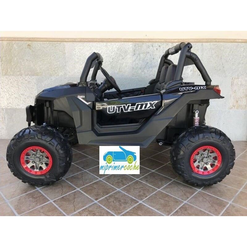 El coche eléctrico para niños TODOTERRENO ELÉCTRICO BUGGY UTV 24V 2 PLAZAS es un coche potente con 2 motores 24v que le otorga tracción a las 2 ruedas traseras . Está equipado con mando distancia 2.4G , ruedas de caucho , 2 asientos de piel , suspensión en cada rueda , equipo de música ,pantalla video mp4, luces LED , asa para transportar el coche .