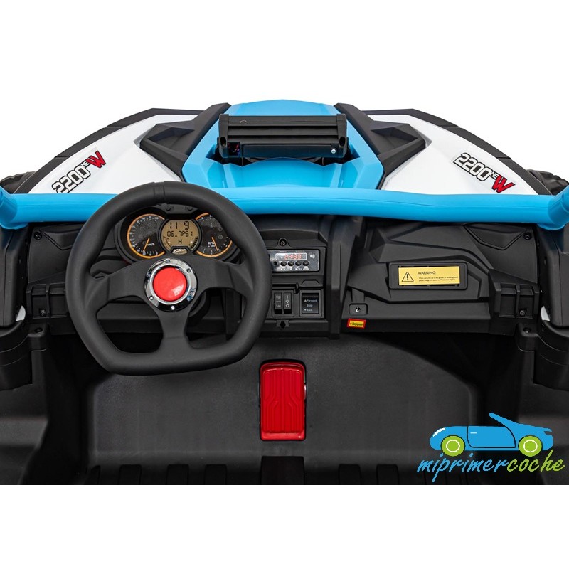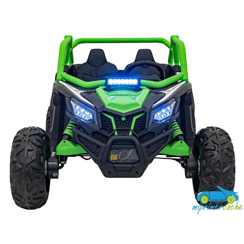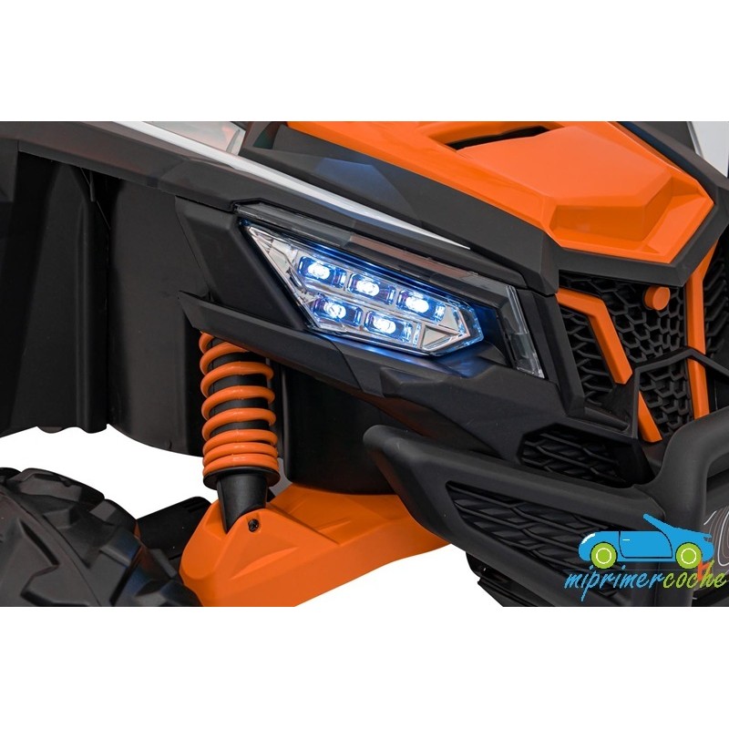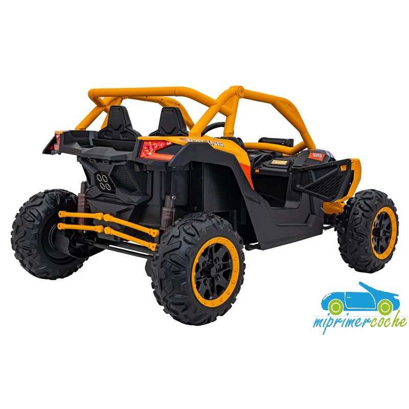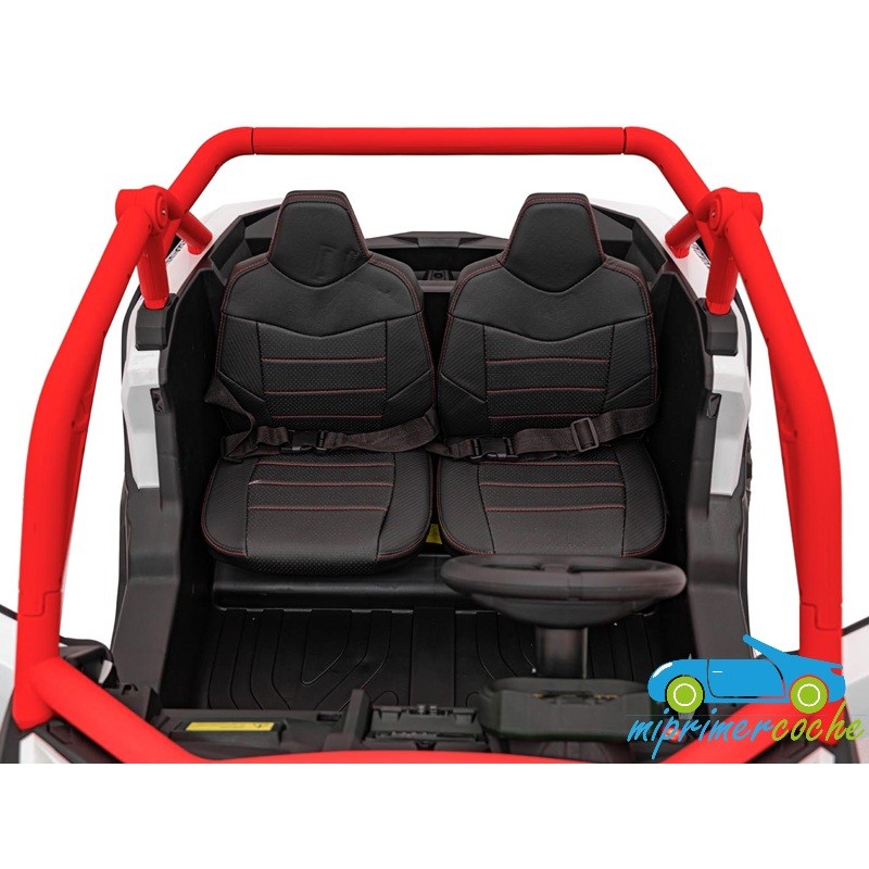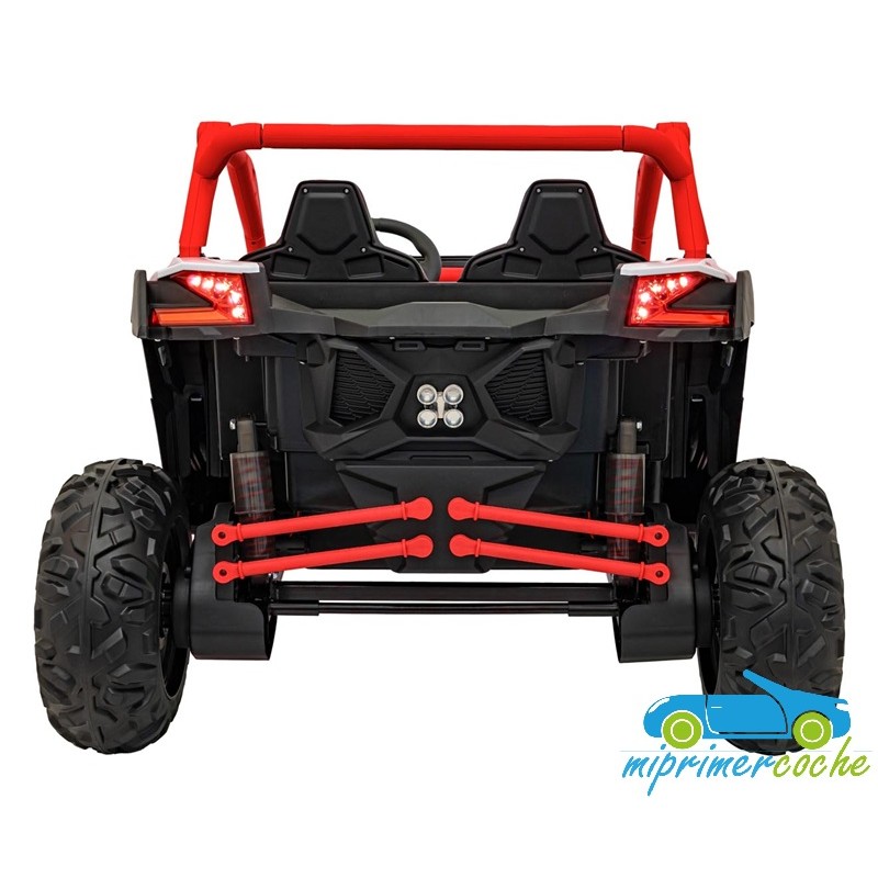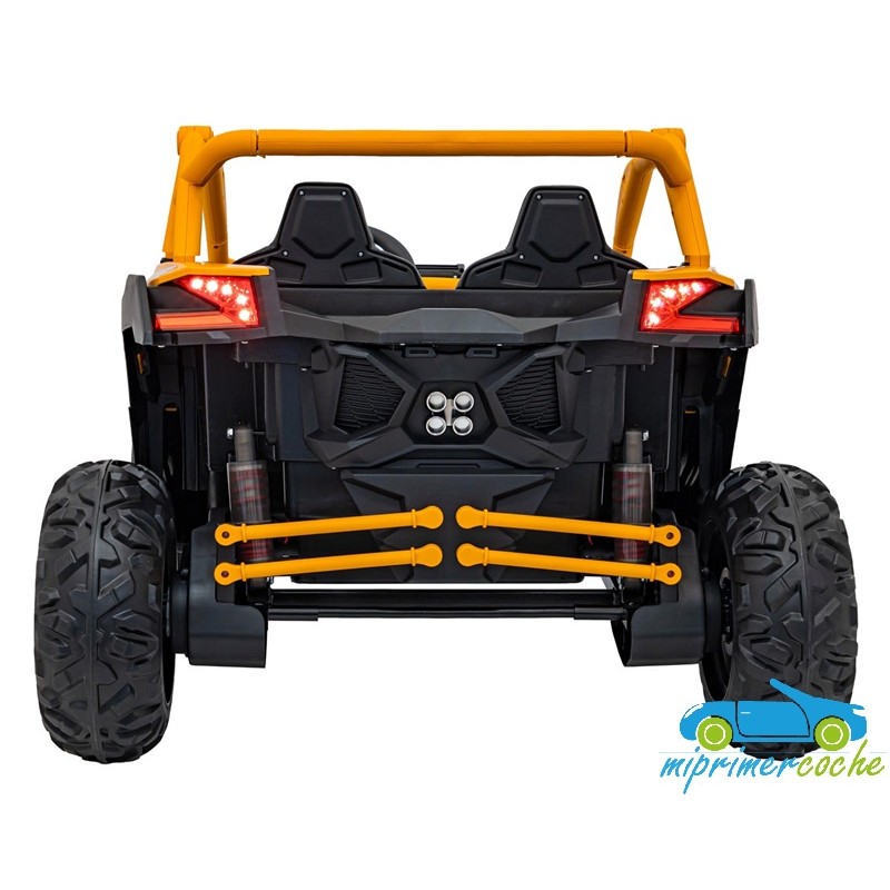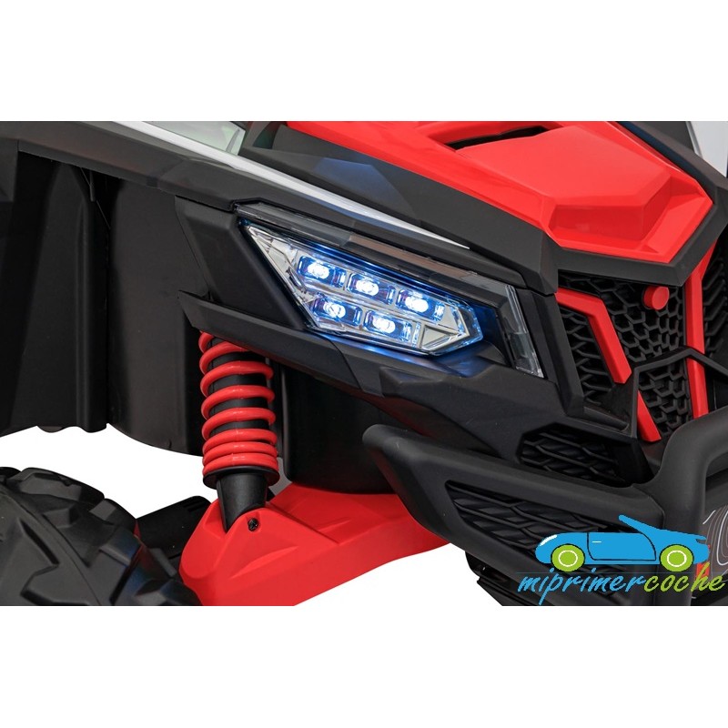 El coche eléctrico para niños TODOTERRENO ELÉCTRICO BUGGY CAN-AM 4X4 24V 2 PLAZAS es un coche potente con 4 motores 12v75W que le otorga tracción a las 4 ruedas . Está equipado con mando distancia 2.4G , ruedas de caucho , 2 asientos de piel , suspensión en cada rueda , equipo de música , luces LED .
