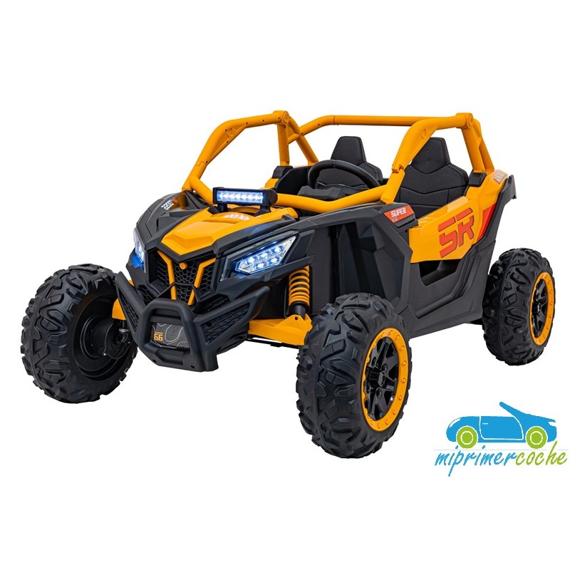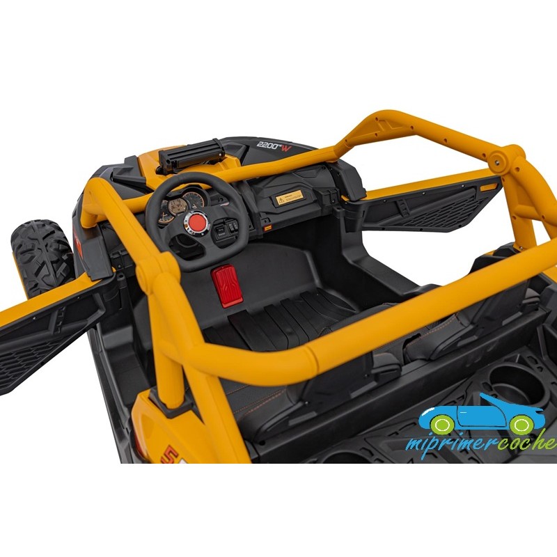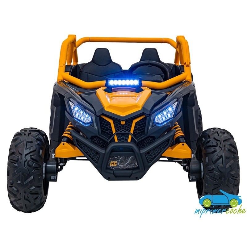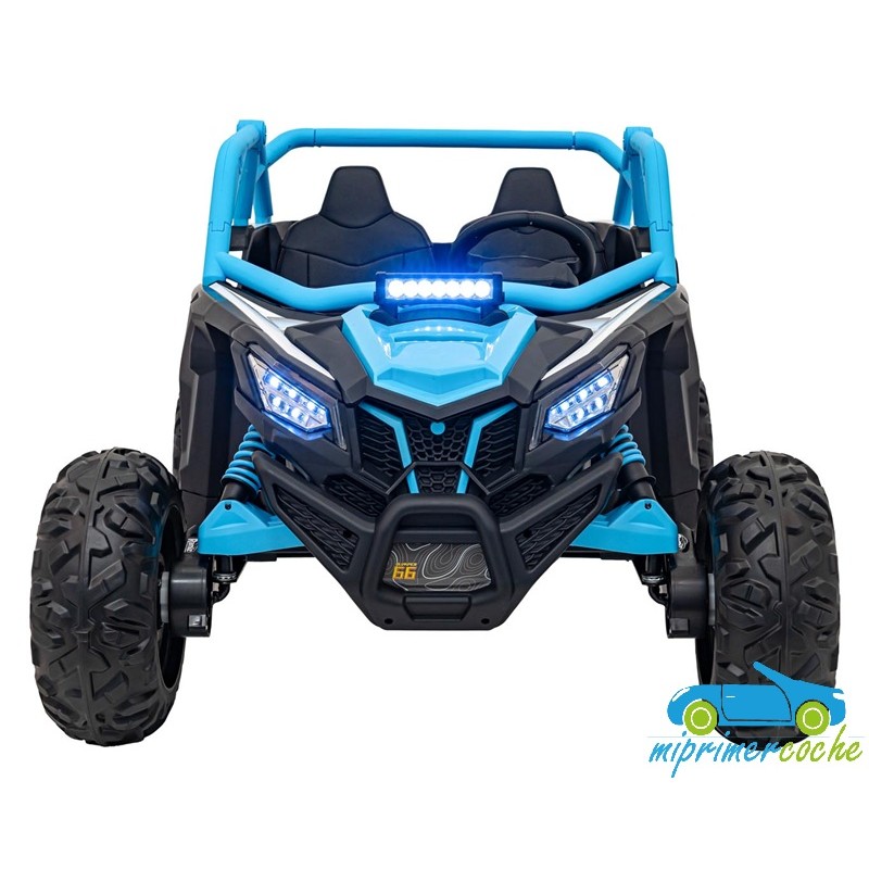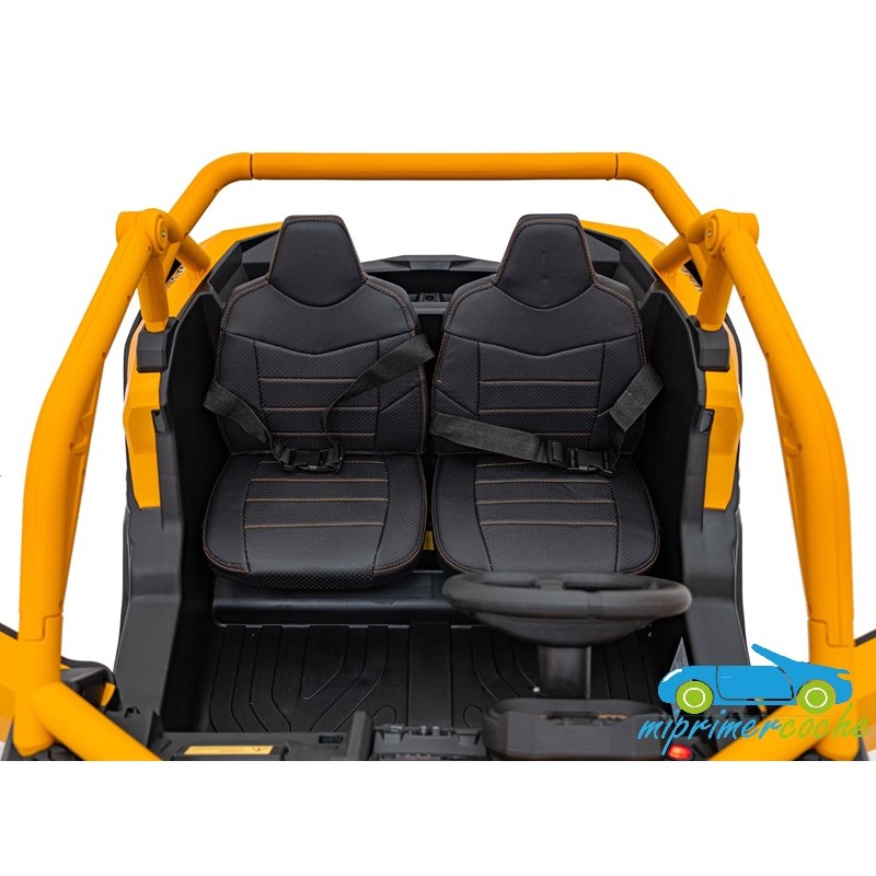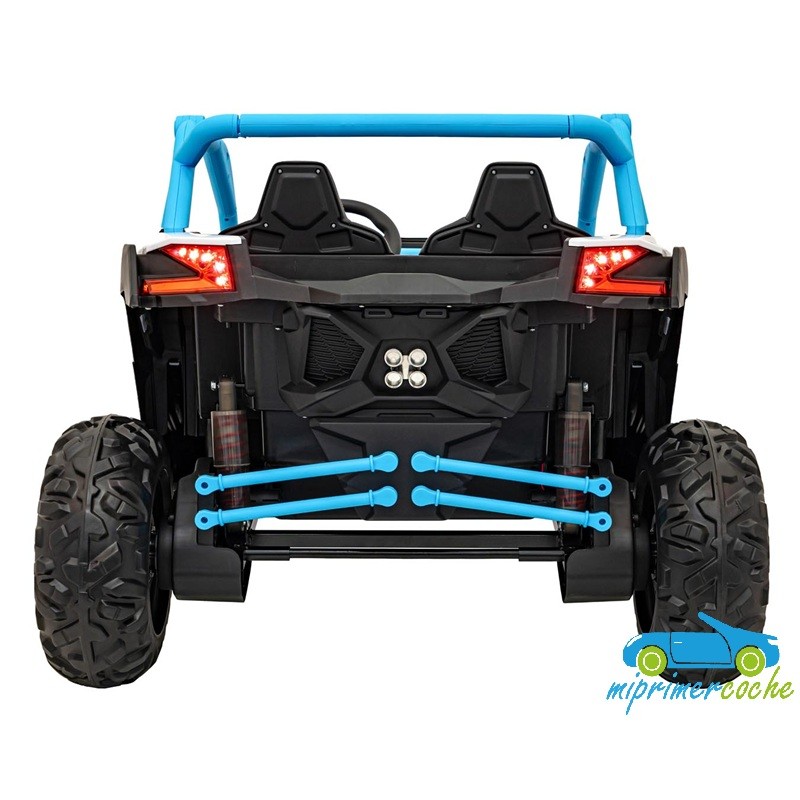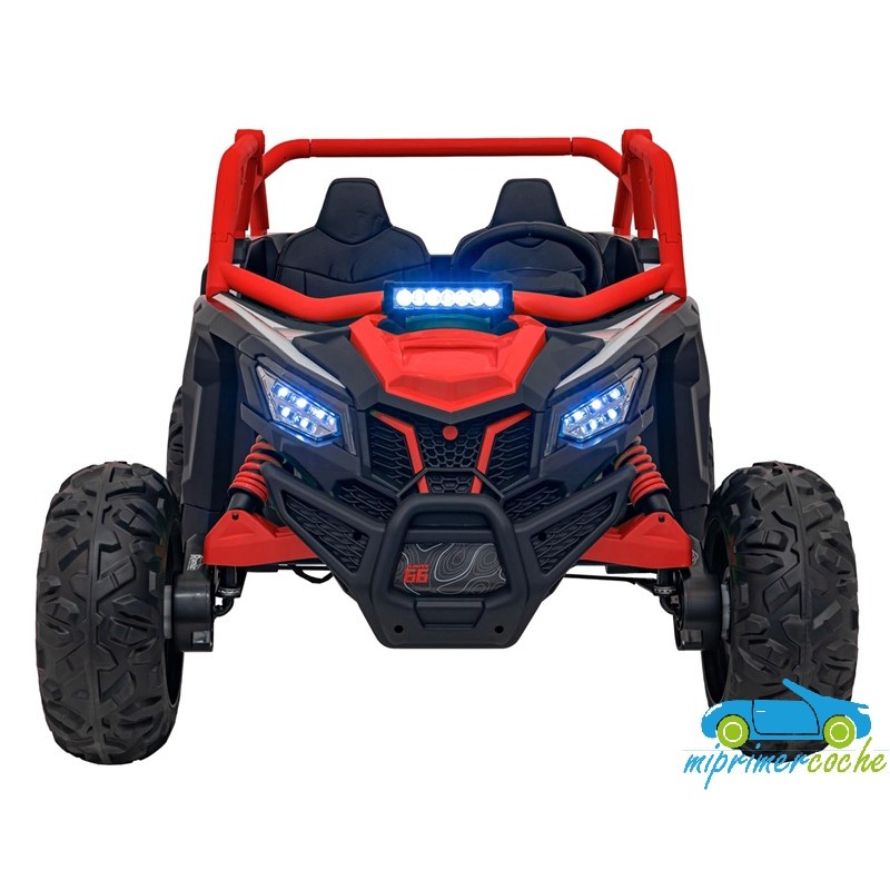 El coche eléctrico para niños TODOTERRENO ELÉCTRICO BUGGY CAN-AM 4X4 24V 2 PLAZAS es un coche potente con 4 motores 12v75W que le otorga tracción a las 4 ruedas . Está equipado con mando distancia 2.4G , ruedas de caucho , 2 asientos de piel , suspensión en cada rueda , equipo de música , luces LED .