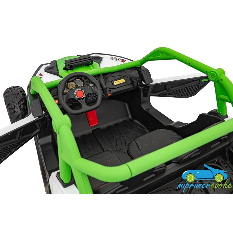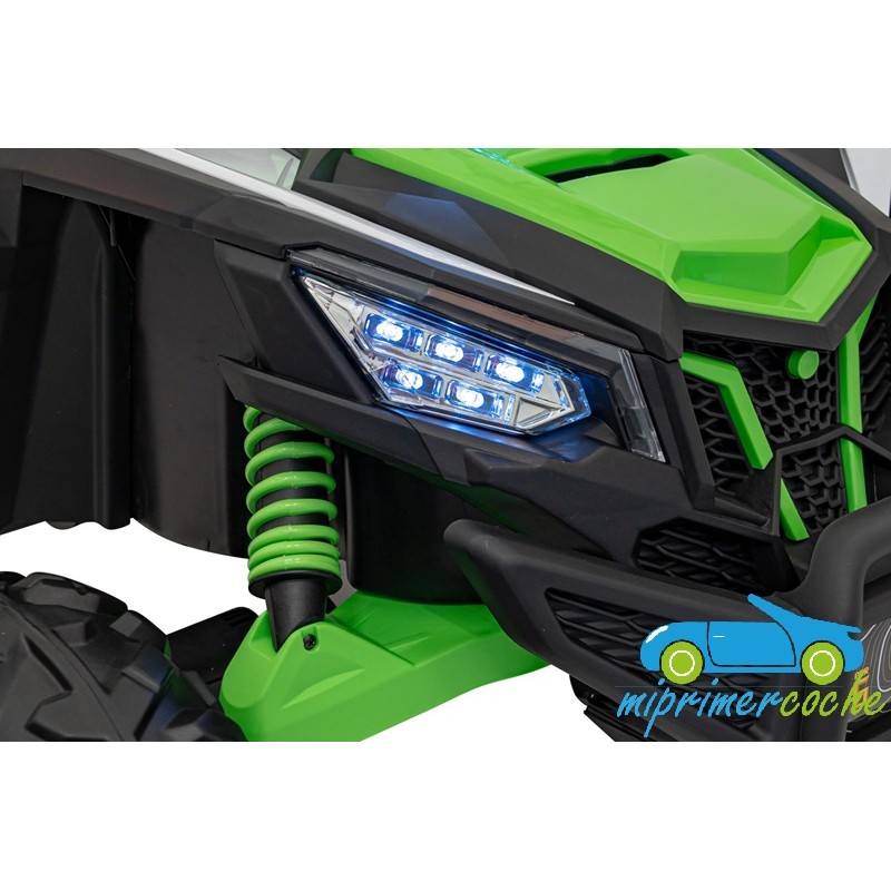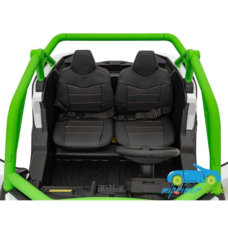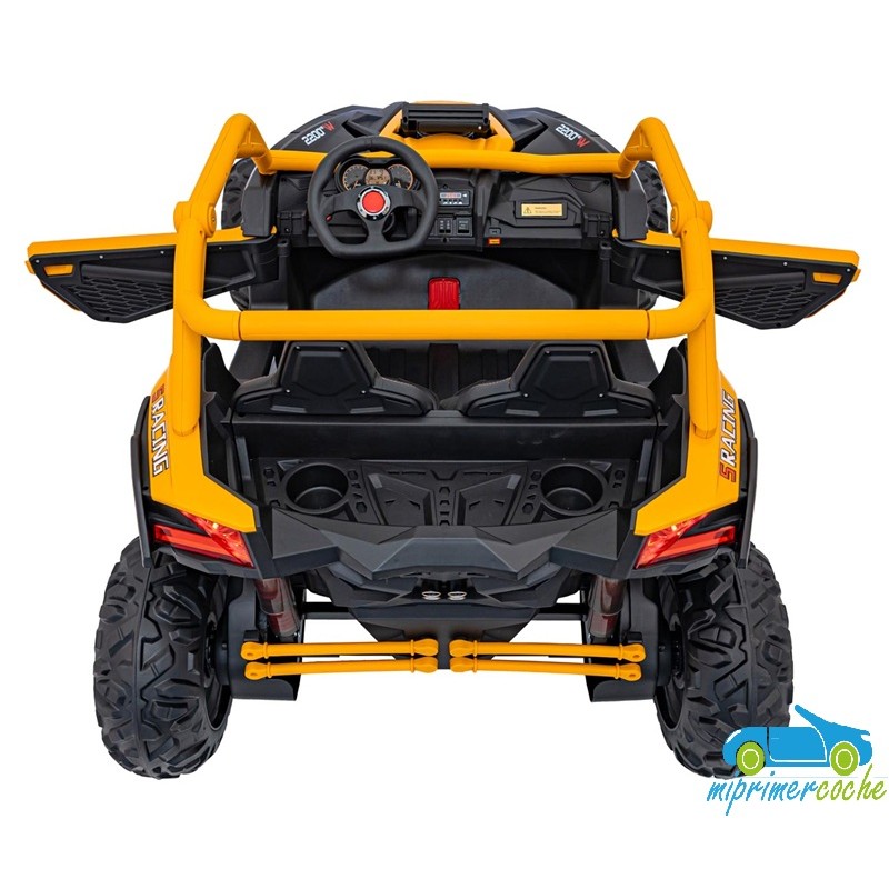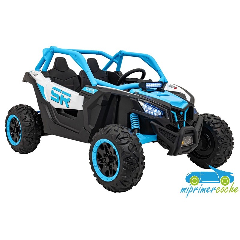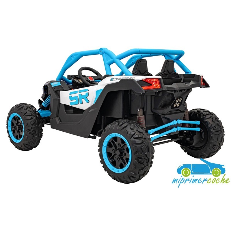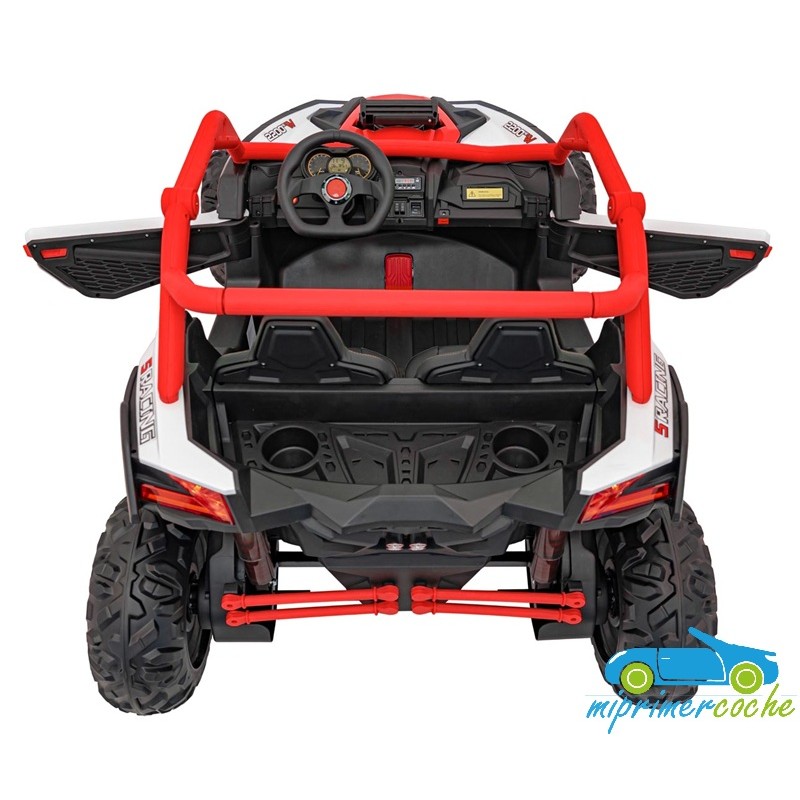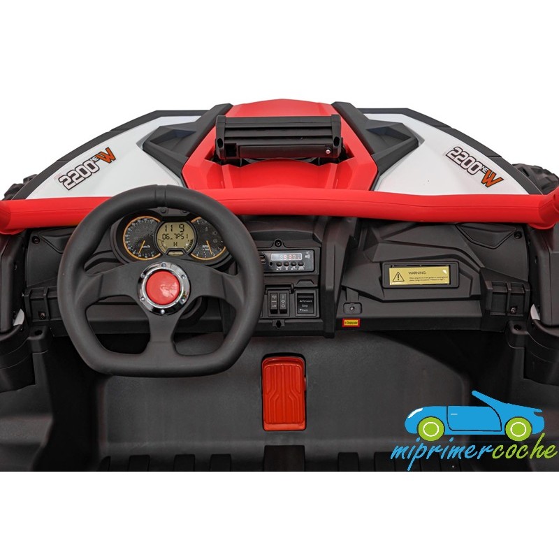 El coche eléctrico para niños TODOTERRENO ELÉCTRICO BUGGY CAN-AM 4X4 24V 2 PLAZAS es un coche potente con 4 motores 12v75W que le otorga tracción a las 4 ruedas . Está equipado con mando distancia 2.4G , ruedas de caucho , 2 asientos de piel , suspensión en cada rueda , equipo de música , luces LED .