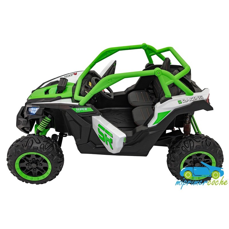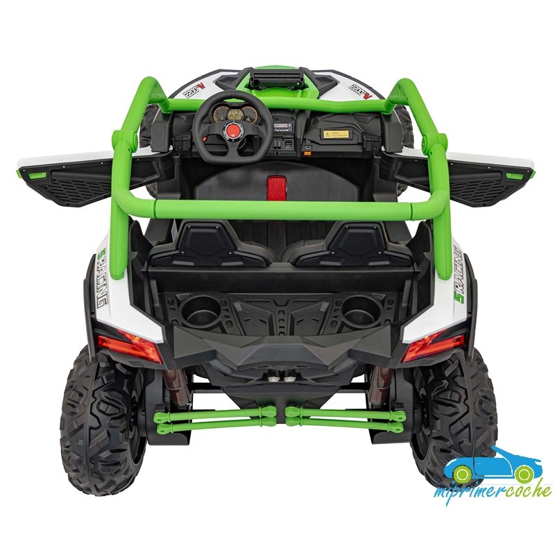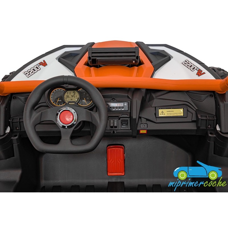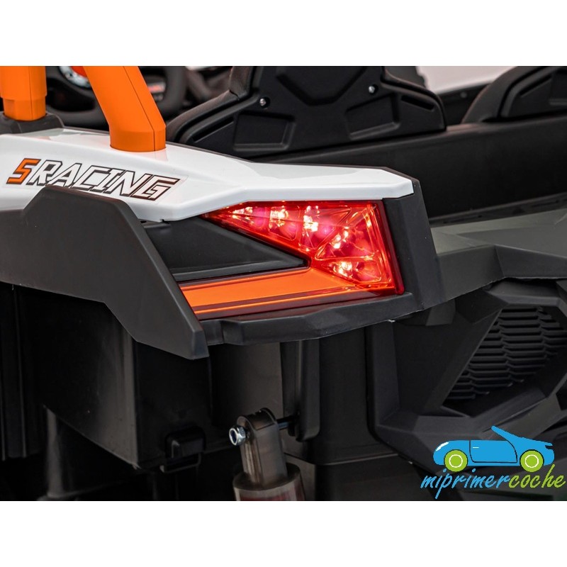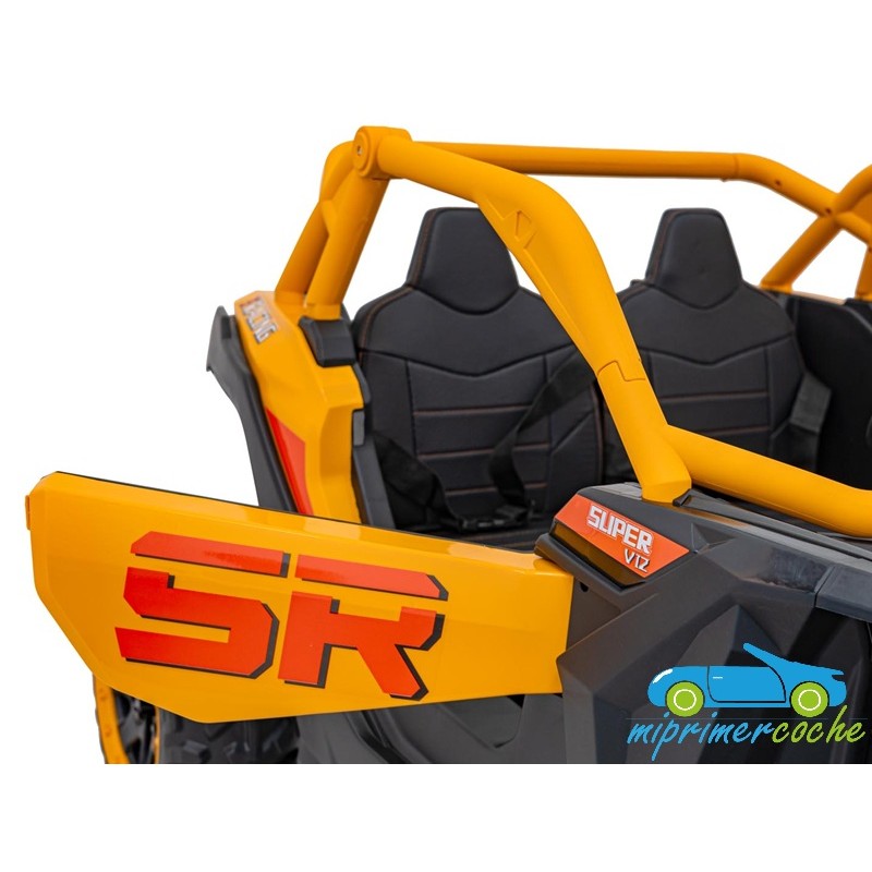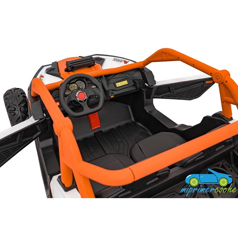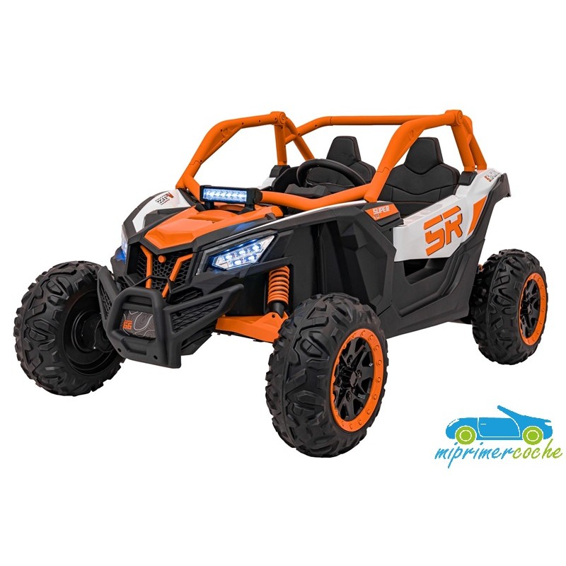 El coche eléctrico para niños TODOTERRENO ELÉCTRICO BUGGY CAN-AM 4X4 24V 2 PLAZAS es un coche potente con 4 motores 12v75W que le otorga tracción a las 4 ruedas . Está equipado con mando distancia 2.4G , ruedas de caucho , 2 asientos de piel , suspensión en cada rueda , equipo de música , luces LED .