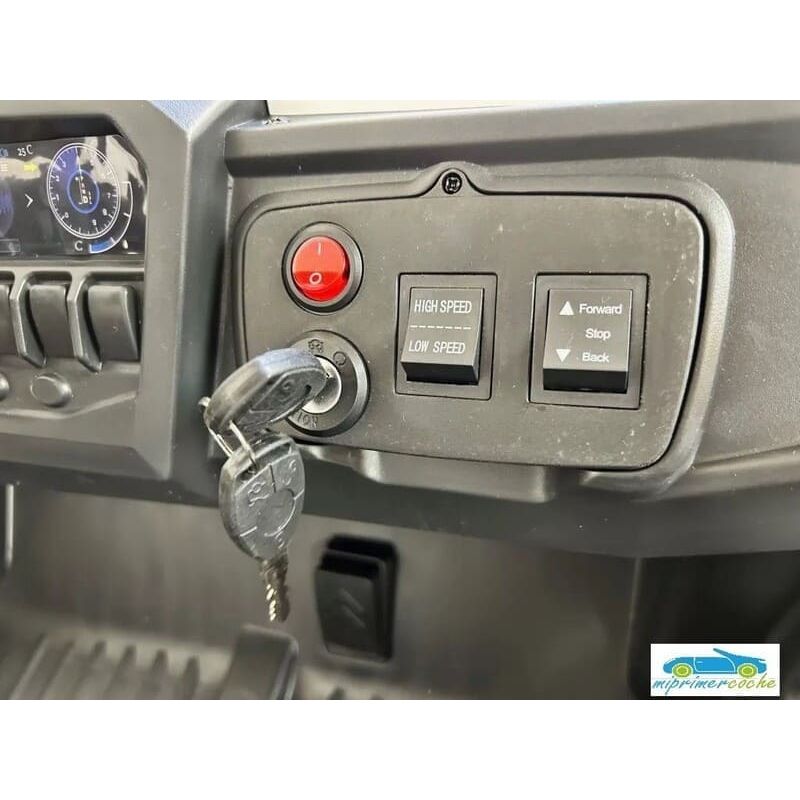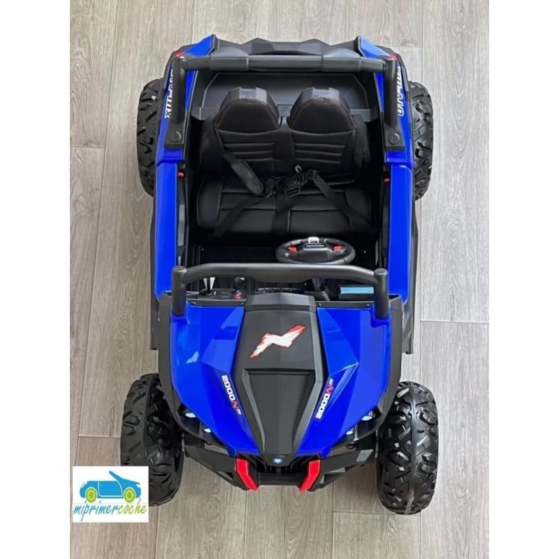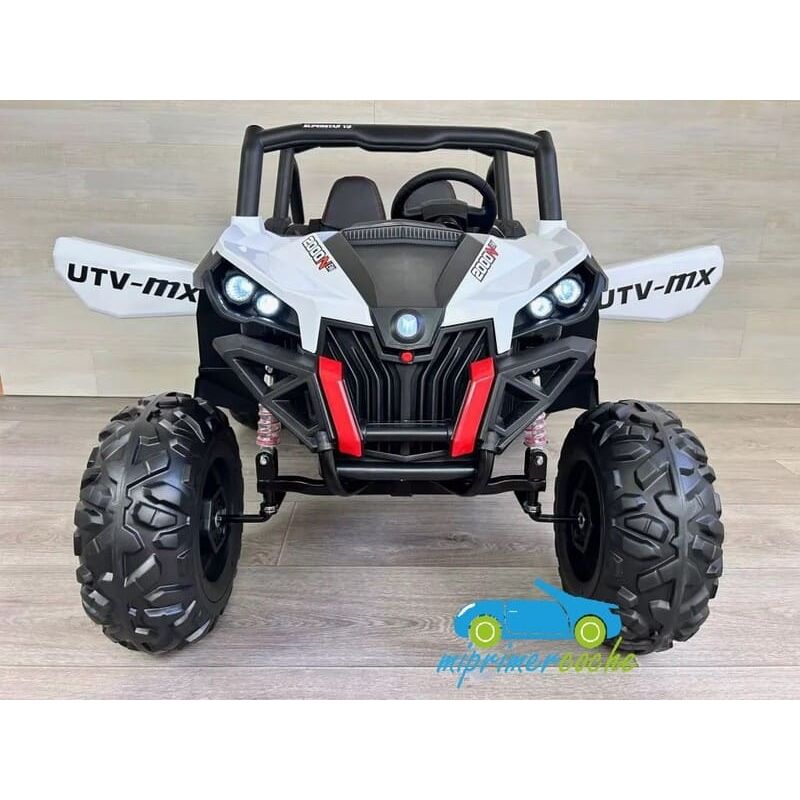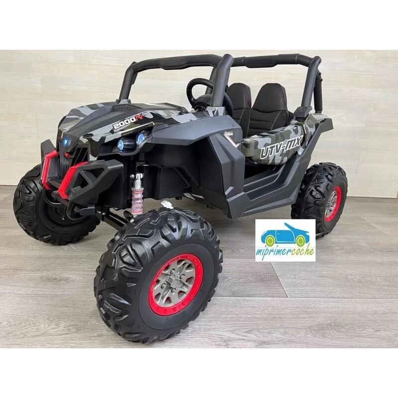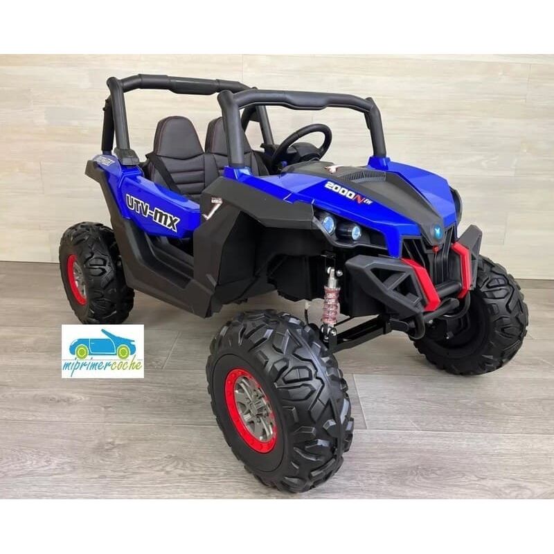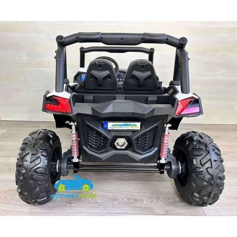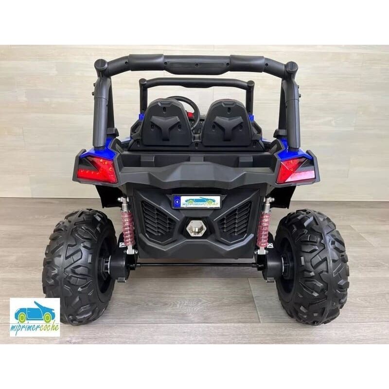 El coche eléctrico para niños TODOTERRENO ELÉCTRICO BUGGY UTV 24V 2 PLAZAS es un coche potente con 2 motores 24v que le otorga tracción a las 2 ruedas traseras . Está equipado con mando distancia 2.4G , ruedas de caucho , 2 asientos de piel , suspensión en cada rueda , equipo de música ,pantalla video mp4, luces LED , asa para transportar el coche .