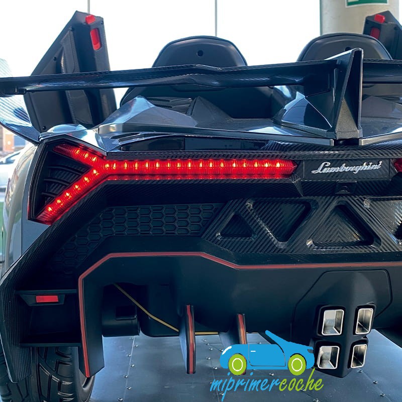 Mi Primer Coche presenta el coche eléctrico para niños LAMBORGHINI VENENO con 2 plazas , una replica con la LICENCIA OFICIAL de la marca . Es un coche con un acabado excelente con la calidad que se puede esperar de un coche licenciado por una marca tan lujosa , un diseño con trazos deportivos , una línea cuidada , que destaca por la apertura de las puertas en forma de gaviota , permitiendo dejar las puertas en lo mas alto , con total seguridad , gracias a los amortiguadores . Con una apariencia robusta y un interior deportivo , con asiento en piel , ruedas de caucho , equipo completo de música , 4 potentes motores de 12v 45w ...este modelo es una gran elección de compra .
