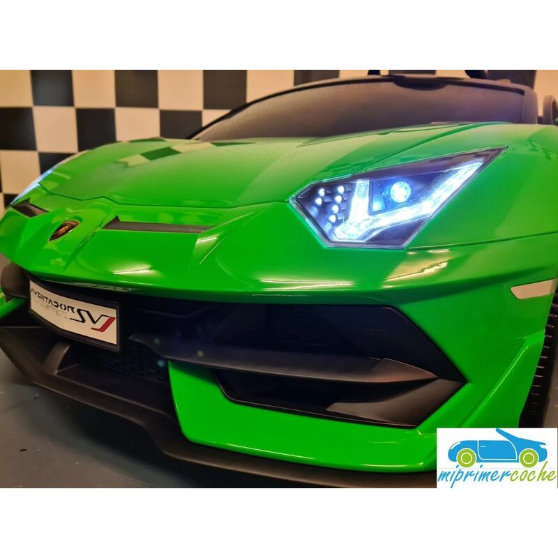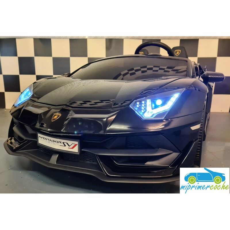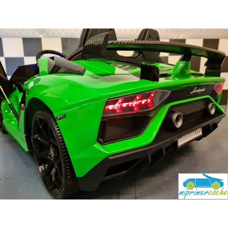 Coche eléctrico para niños LAMBORGHINI AVENTADOR SVJ 12V con mando parental 2.4G ,pintura metalizada, ruedas de caucho , 2 motores 45w , asa y ruedines para el transporte .