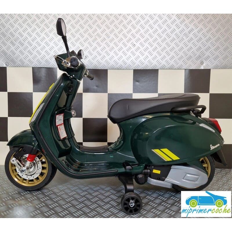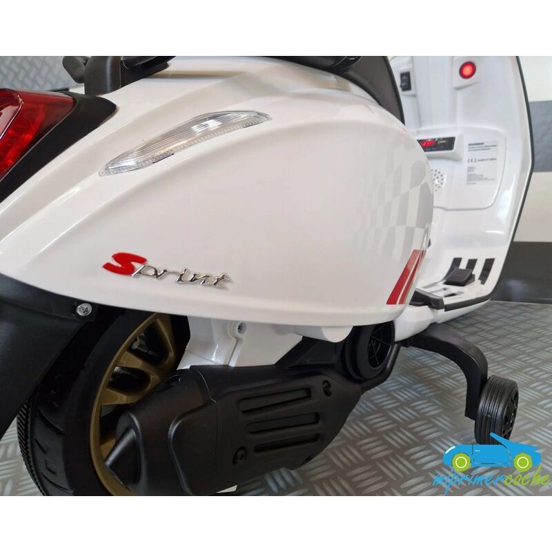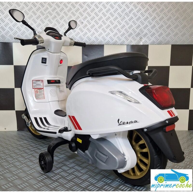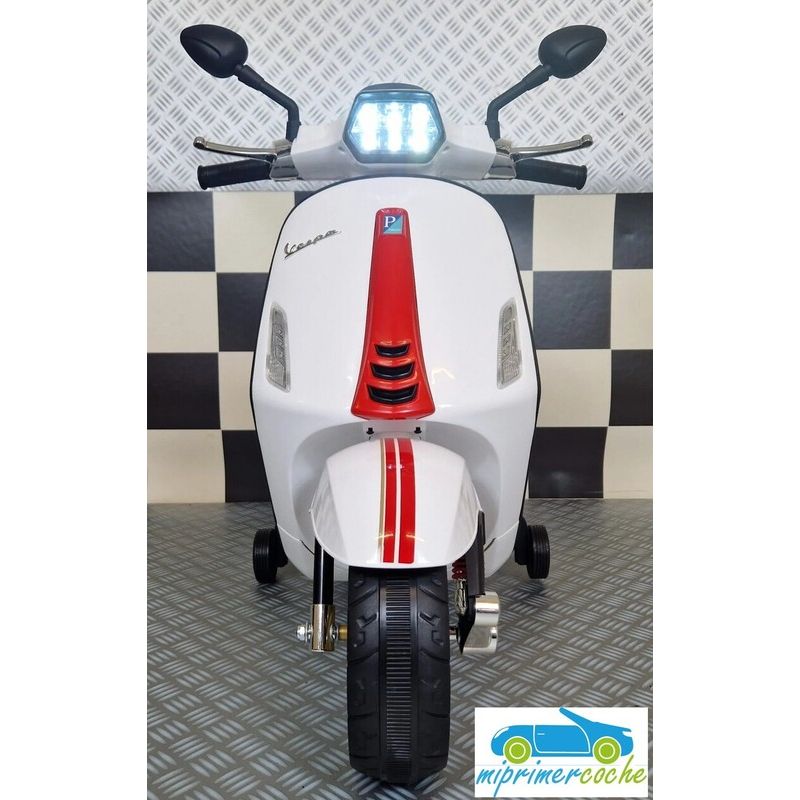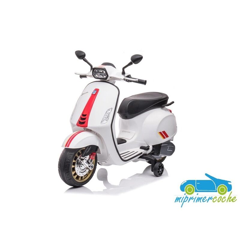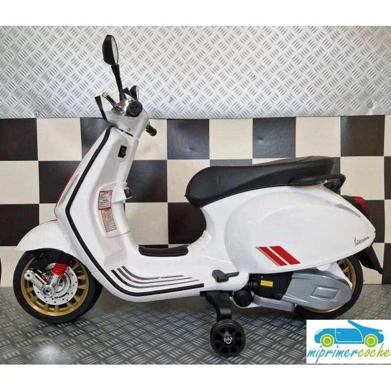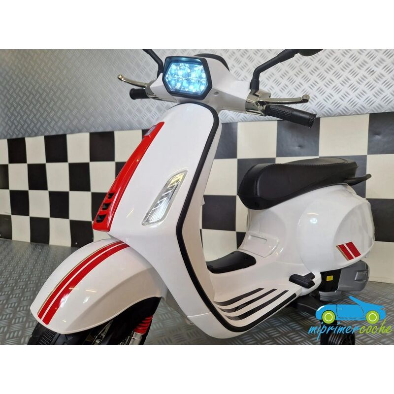 Mi Primer Coche te presenta una nueva Moto Eléctrica para niños VESPA PIAGGIO SPRINT 12v , con 2 motores , iluminación led , equipo de sonido completo . También destacamos que es una moto con LICENCIA OFICIAL PIAGGIO , con ruedines regulables que pueden ser quitados cuando el niño o la niña gana en confianza .