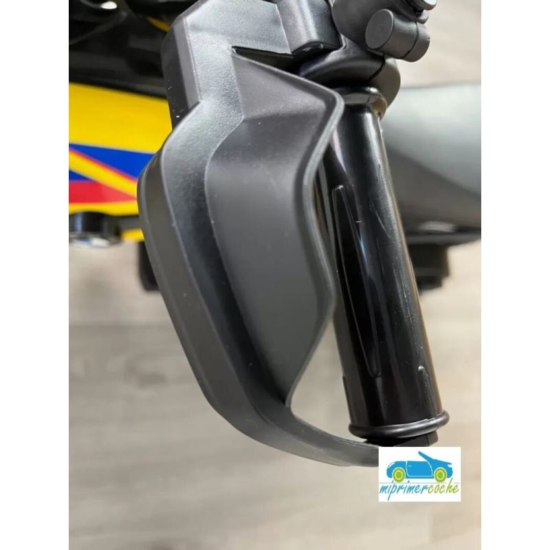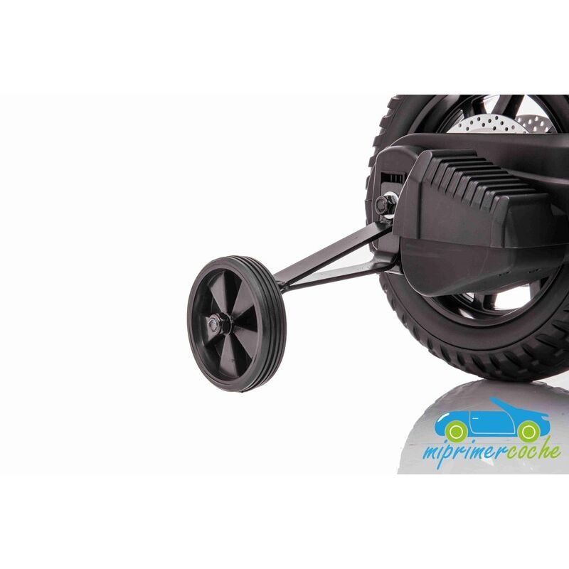 - el niño puede conducir la moto utilizando los controles que están en el interior del coche , con el pedal acelerador hacia adelante / atrás y girar con el volante . Cuando el niño levanta el pie del acelerador , aparece el freno eléctrico con función de parar la moto .