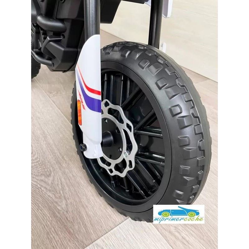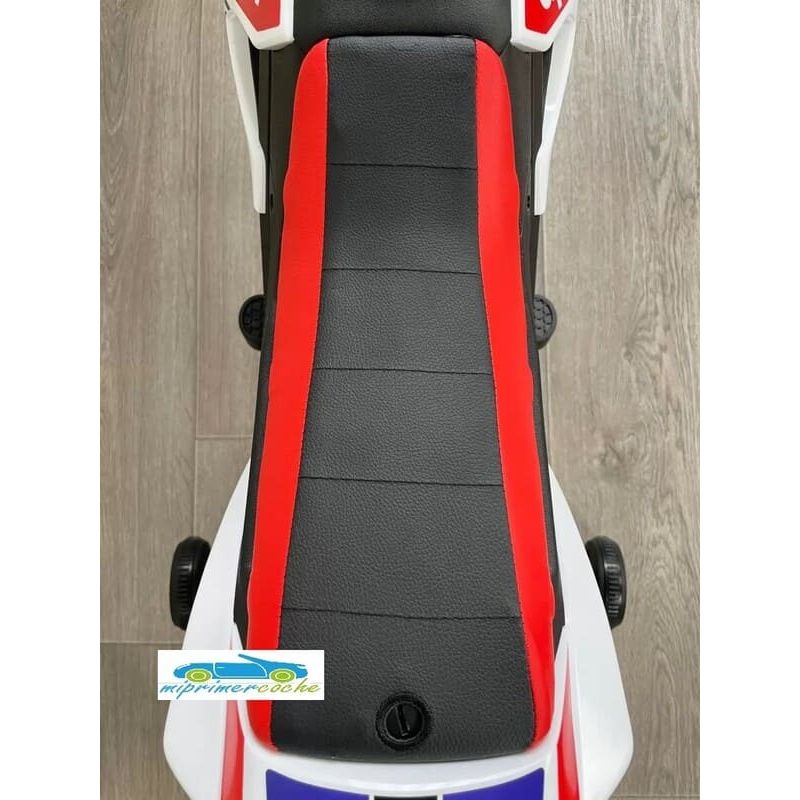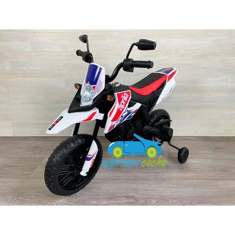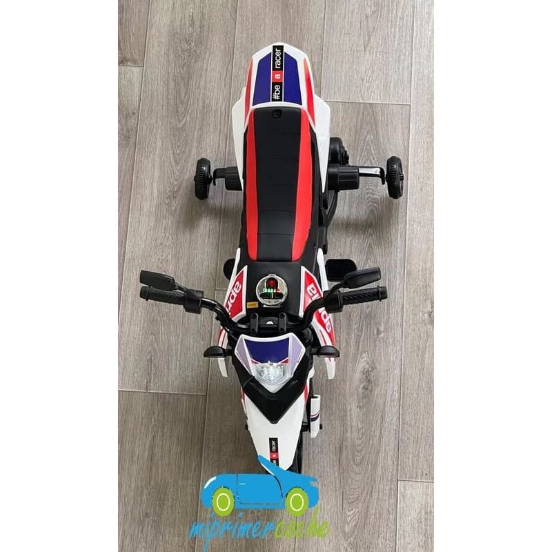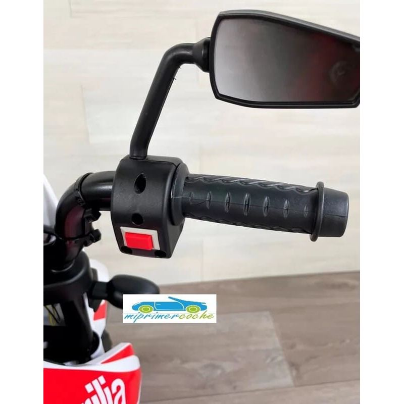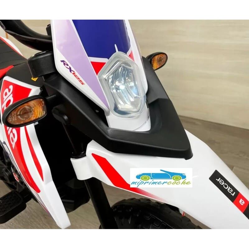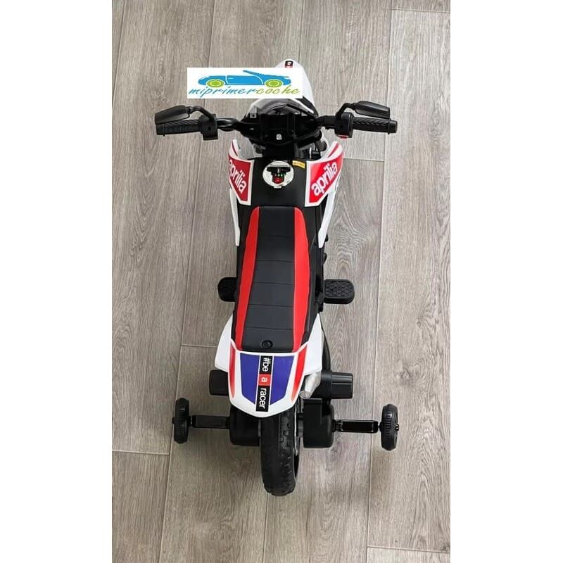 La Moto Eléctrica para Niños Aprilia RX 125 12V es una réplica oficial con dos motores, ruedas de caucho, asiento acolchado y ruedines auxiliares. Con acelerador en el manillar, arranque por botón y música integrada, alcanza hasta 6 km/h.