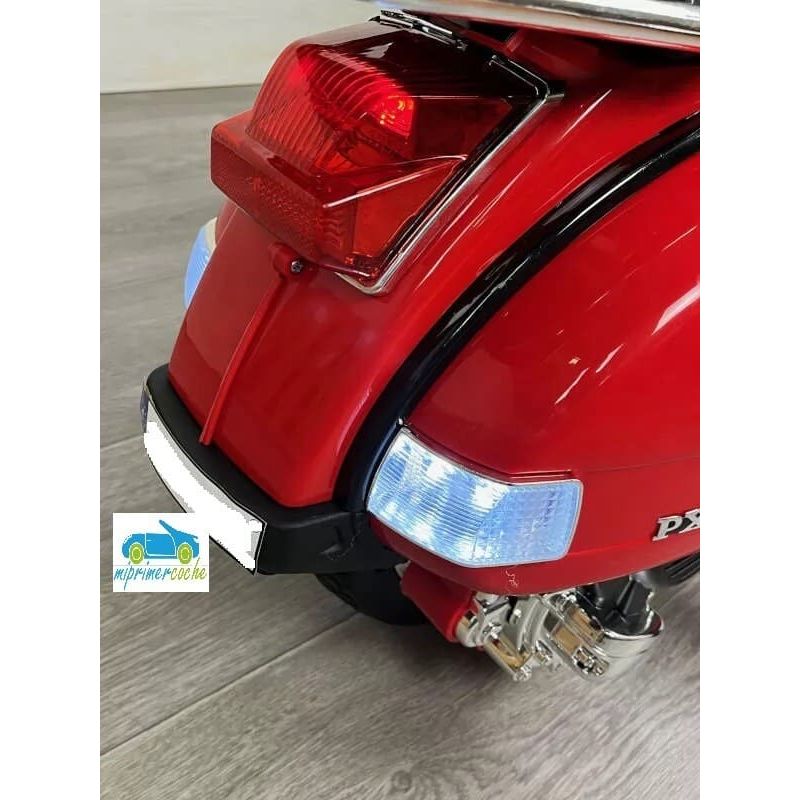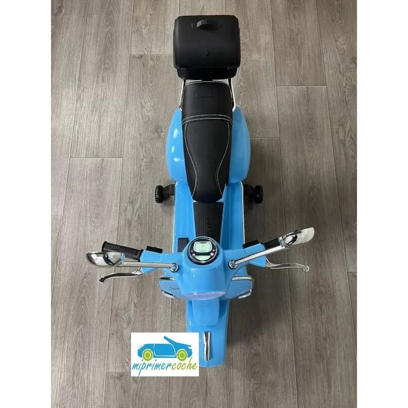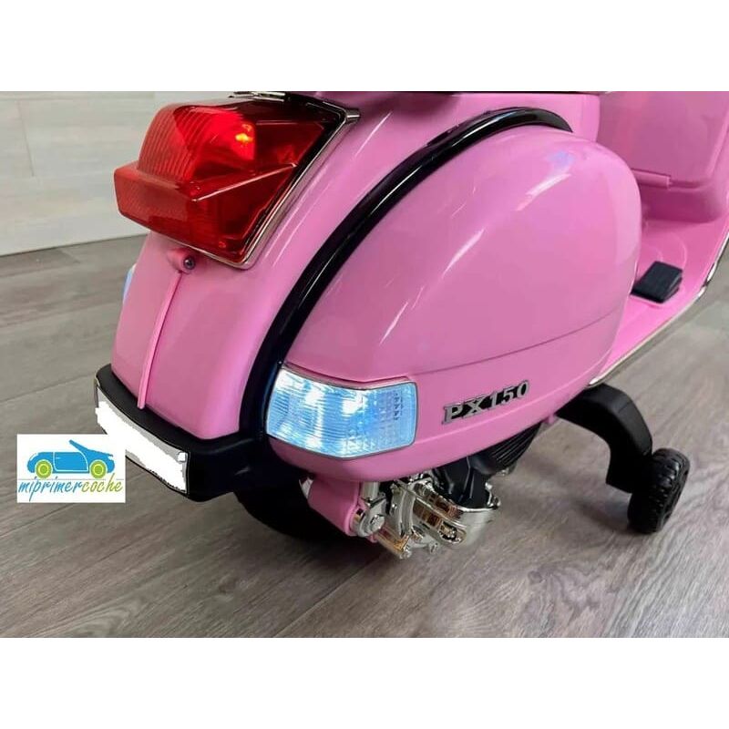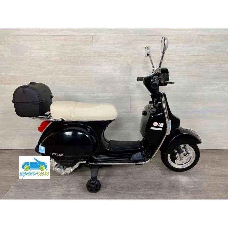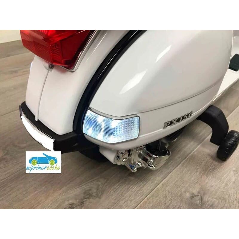 Moto Eléctrica para niños VESPA PIAGGIO CLÁSICA PX-150 12V con dos motores, ruedas de caucho, asiento en piel sintética, luces, equipo de sonido, baúl trasero.