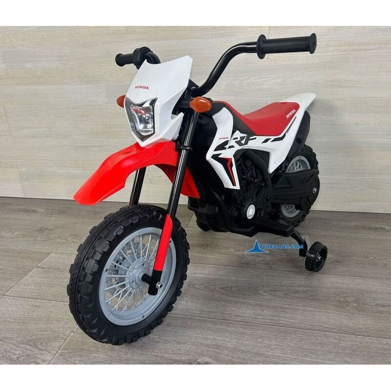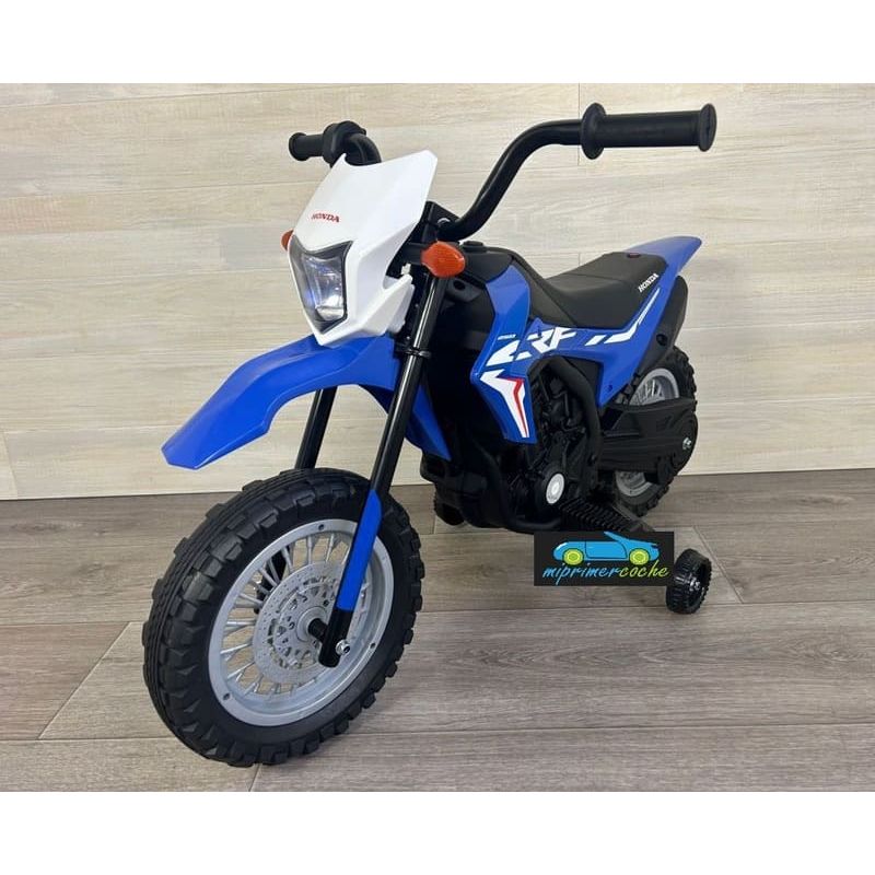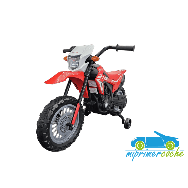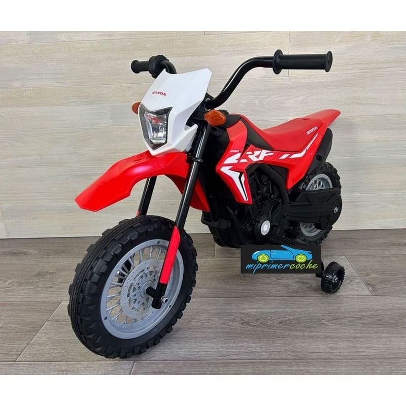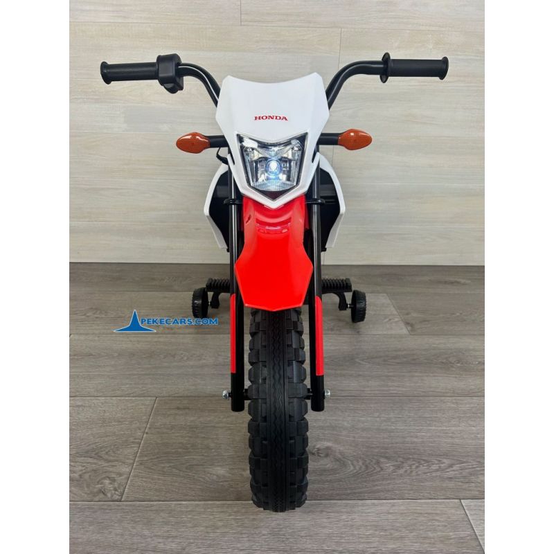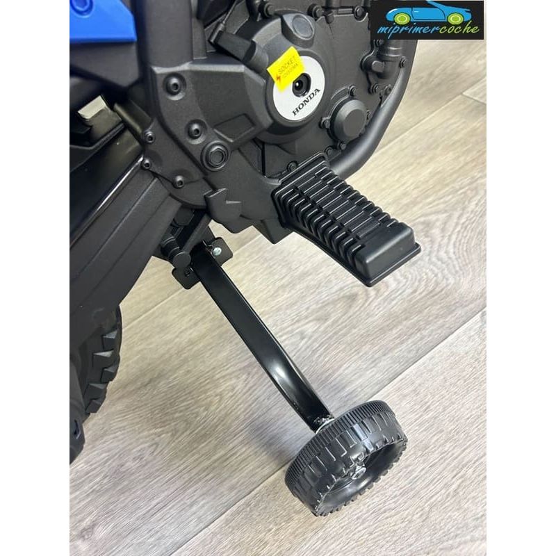Esta moto eléctrica para niños es una replica de la verdadera HONDA CRF .Está equipada con motor de 12v , ruedines laterales , arranque mediante botón , hace ser una moto que no pase inadvertida por los parques . El acelerador lo tiene en el manillar mediante botón e incluye 2 ruedines que ayudan a los niños a tener mayor estabilidad a la hora de usar la moto .