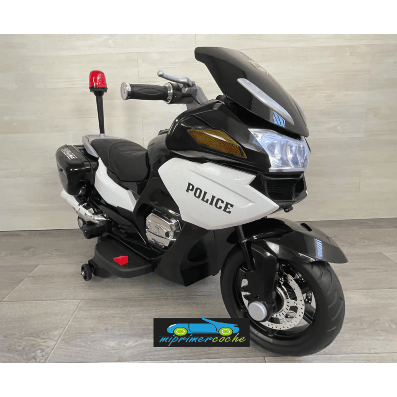 Mi Primer Coche te presenta una nueva Moto Eléctrica para niños POLICIA 24v 2 PLAZAS, con 2 motores , acelerador en el pedal, iluminación led , equipo de sonido completo . También destacamos que es una moto con ruedines de apoyo que pueden ser quitados cuando el niño o la niña gana en confianza .