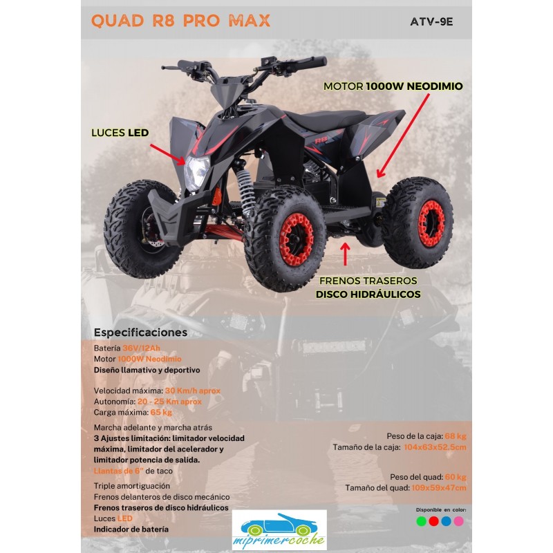 Quad infantil eléctrico ECO R8 PRO MAX 36V 1000W con motor de Neodimio , frenos de discos, ruedas neumáticas, limitador de velocidad