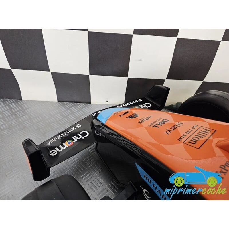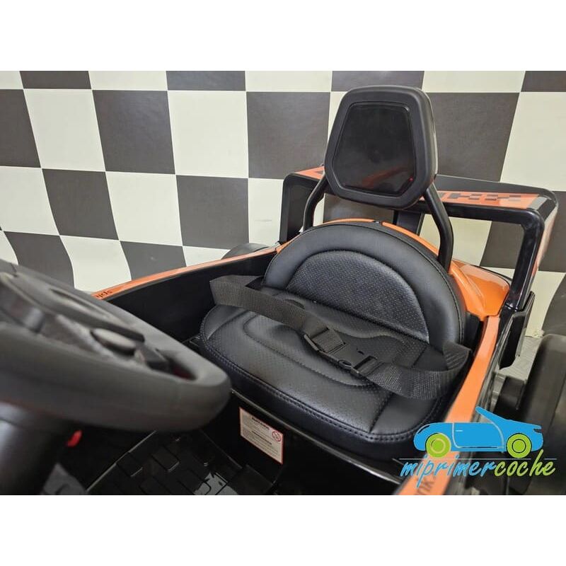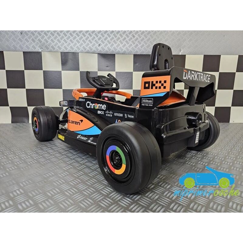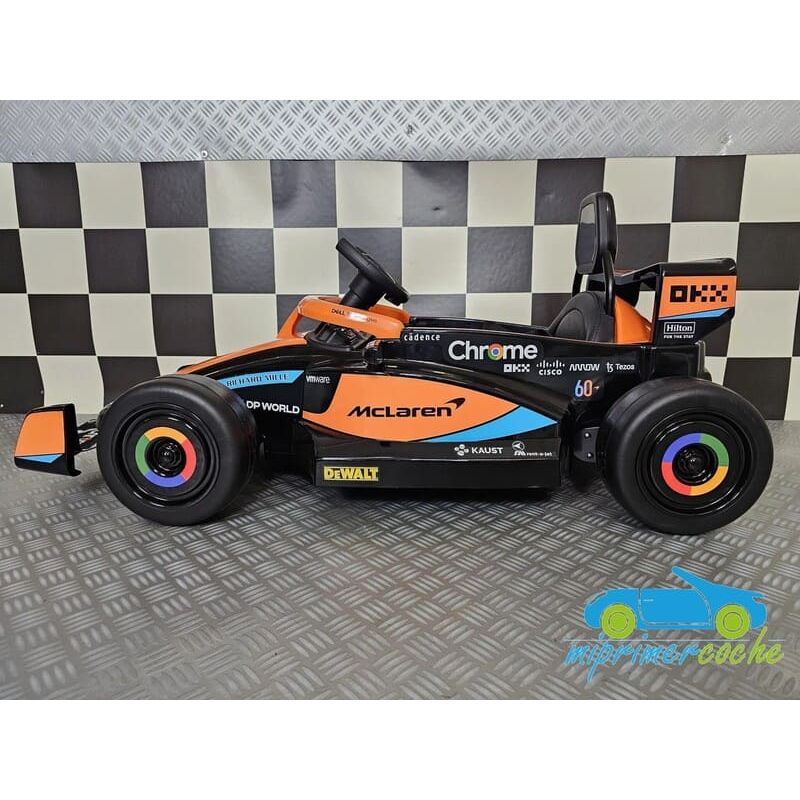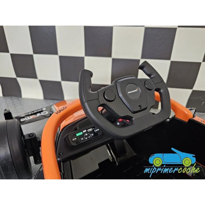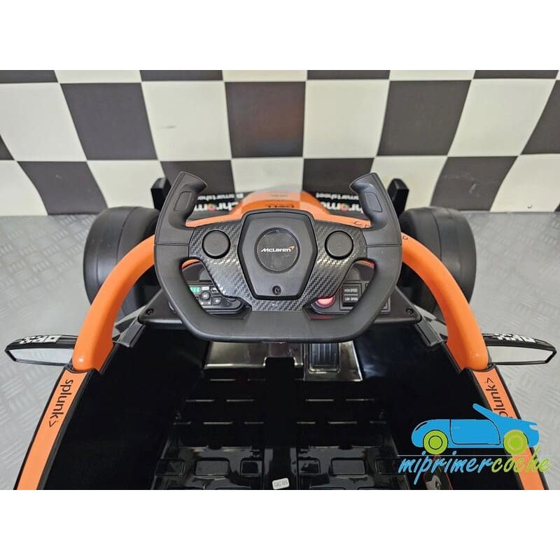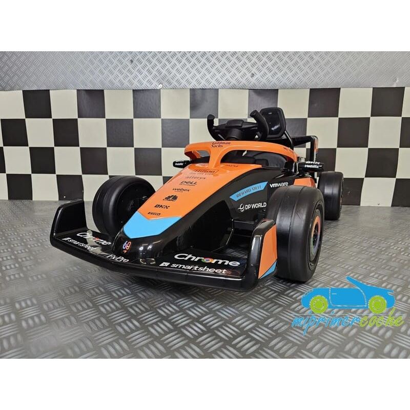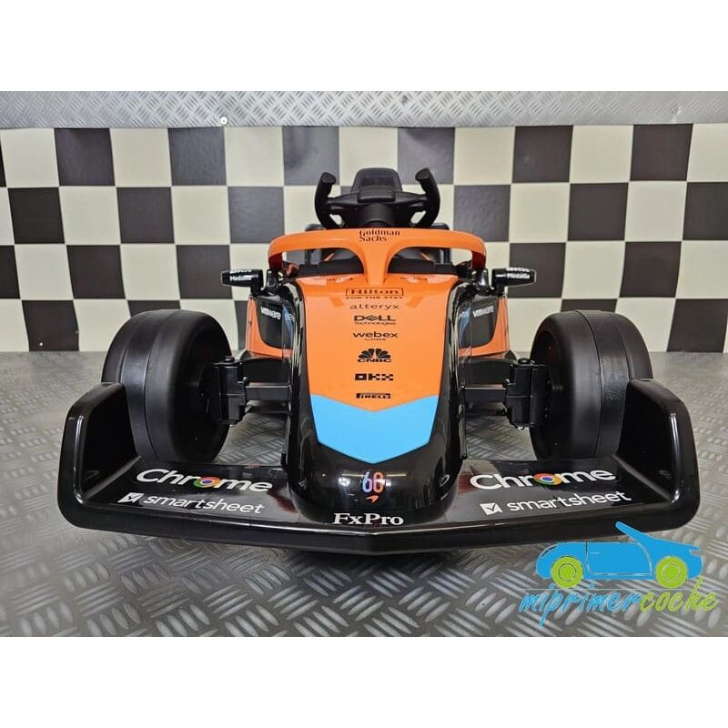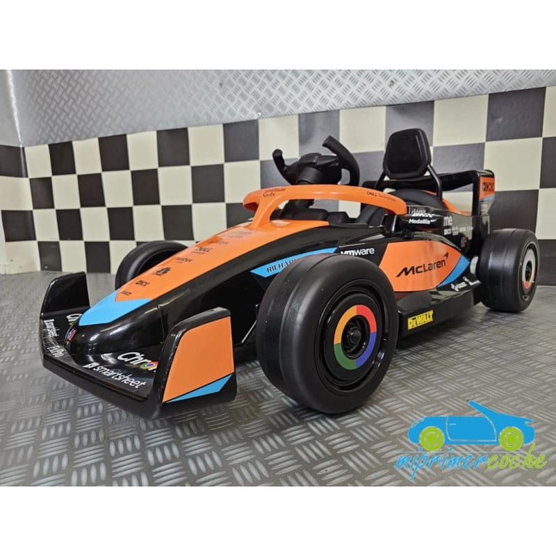 El coche eléctrico infantil McLaren de Fórmula 1 es el sueño supremo de los jóvenes fanáticos de las carreras. Con su llamativo esquema de color naranja y azul y su diseño, basado en los autos de carreras reales de McLaren, este auto para niños ofrece una auténtica experiencia de carreras.