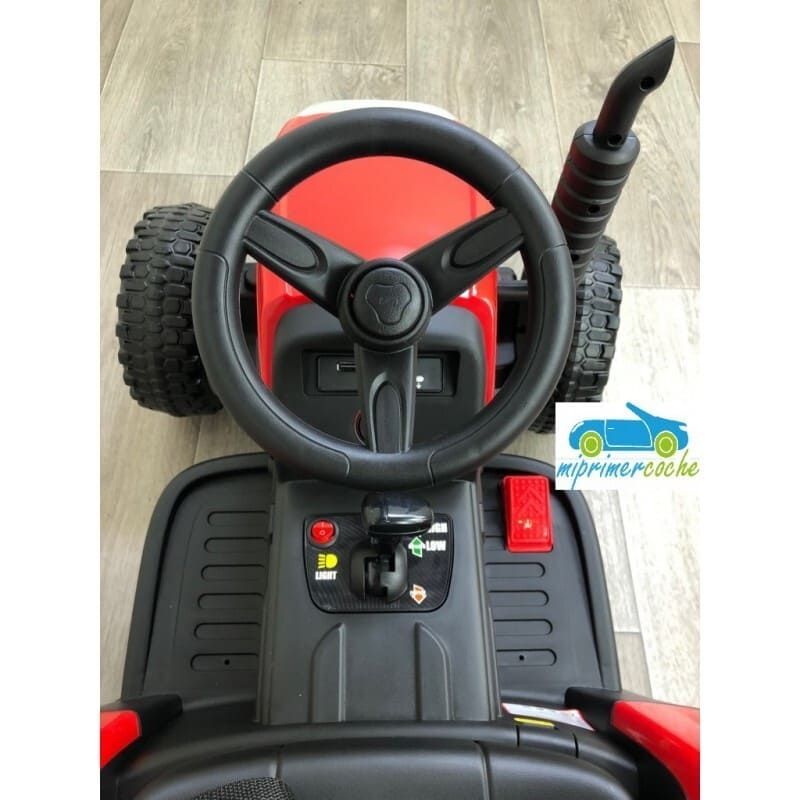 Este tractor eléctrico infantil viene totalmente equipado , con mando parental 2.4G , ruedas de plástico, asiento en plástico e incluye su propio remolque para transportar la carga .