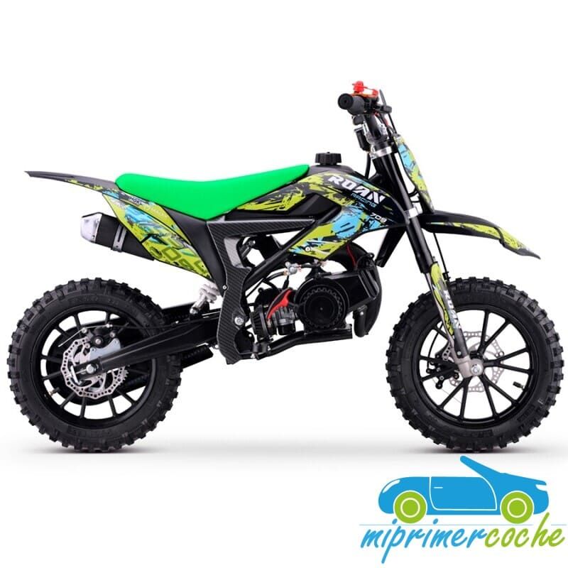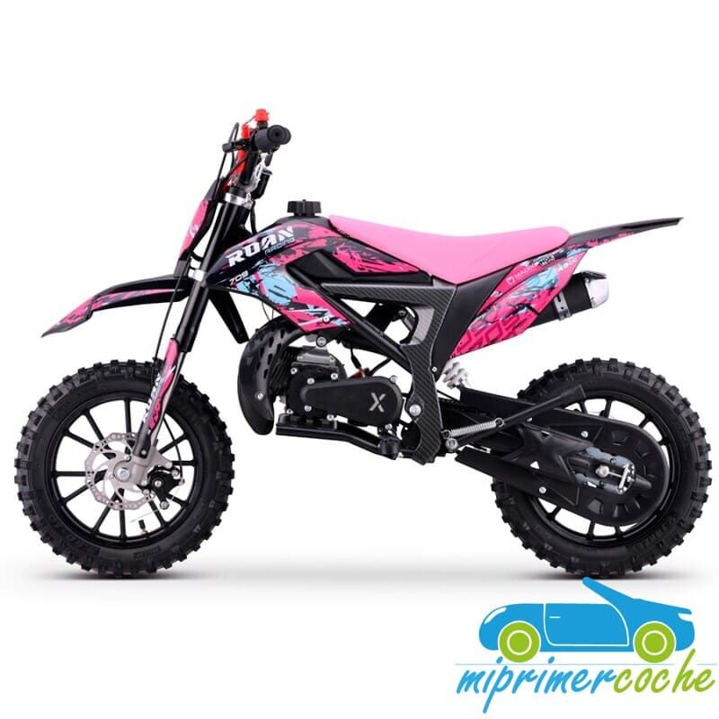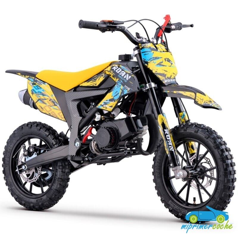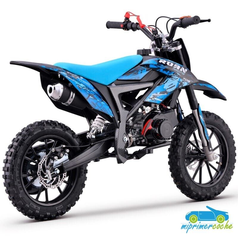 Mini moto off-road para niños con motor de 49cc, ruedas de 10”, frenos de disco, limitador de velocidad y sistema hombre al agua. Alcanza hasta 45 km/h. Altura al sillín: 60 cm. Arranque fácil por tirador..