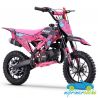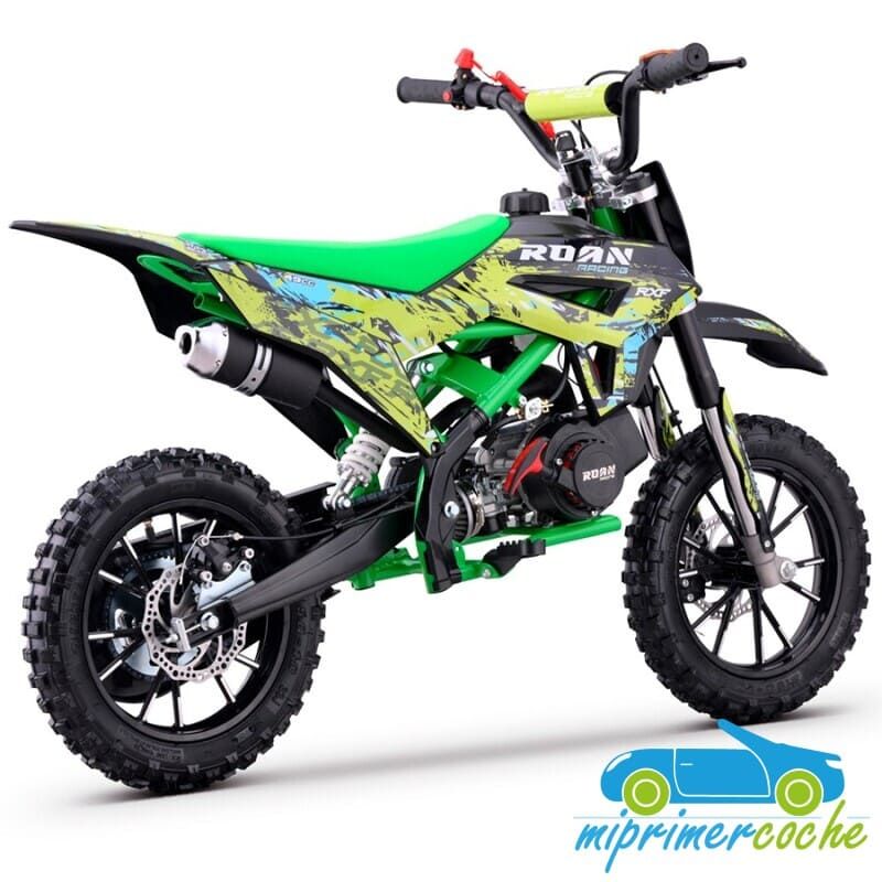 Mini moto off-road para niños con motor de 49cc, ruedas de 10”, frenos de disco, limitador de velocidad y sistema hombre al agua. Alcanza hasta 45 km/h. Altura al sillín: 60 cm. Arranque fácil por tirador..