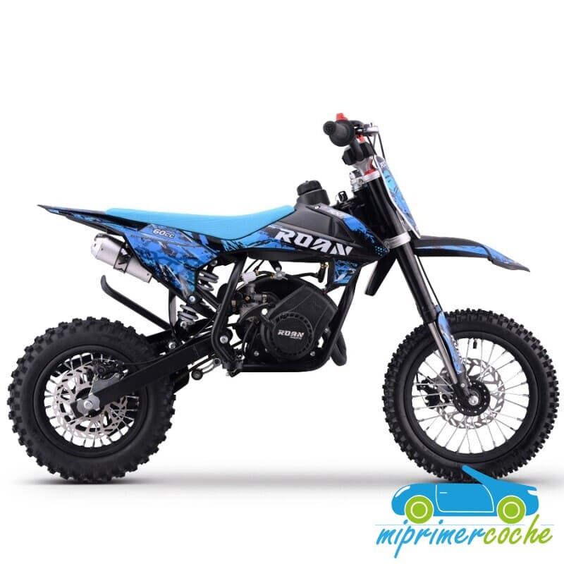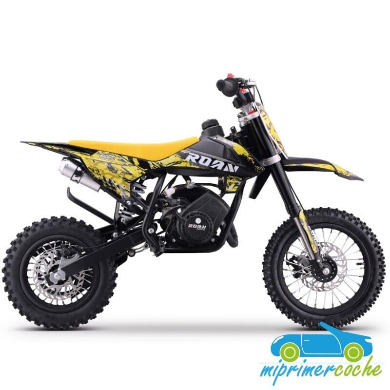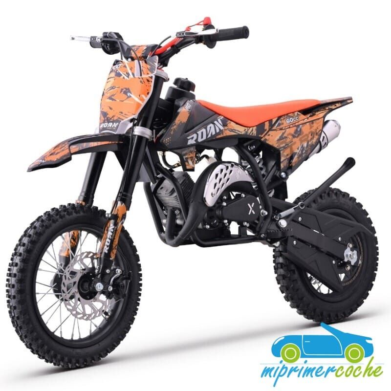 Mini moto off-road para niños con motor de 60cc, ruedas de 12” / 10'' , frenos de disco, limitador de velocidad y sistema hombre al agua. Alcanza hasta 45 km/h. Altura al sillín: 65 cm. Arranque fácil por tirador..