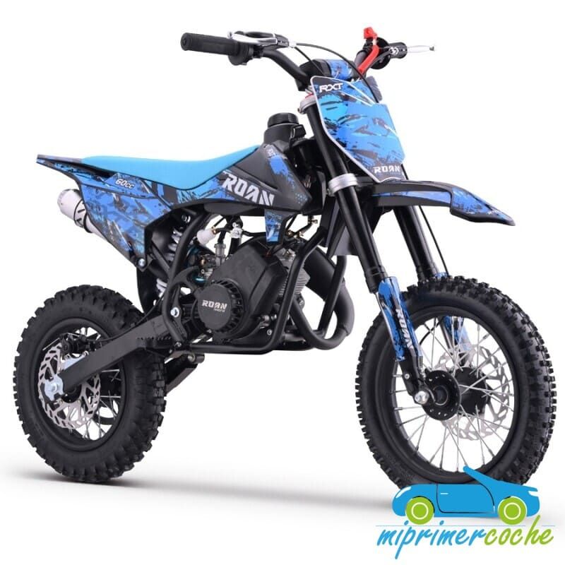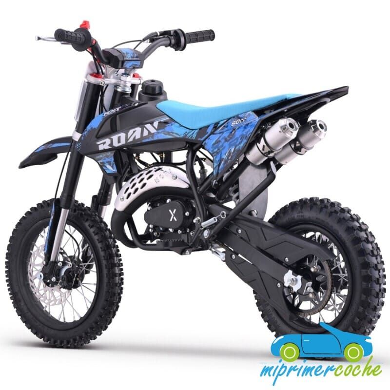 Mini moto off-road para niños con motor de 60cc, ruedas de 12” / 10'' , frenos de disco, limitador de velocidad y sistema hombre al agua. Alcanza hasta 45 km/h. Altura al sillín: 65 cm. Arranque fácil por tirador..