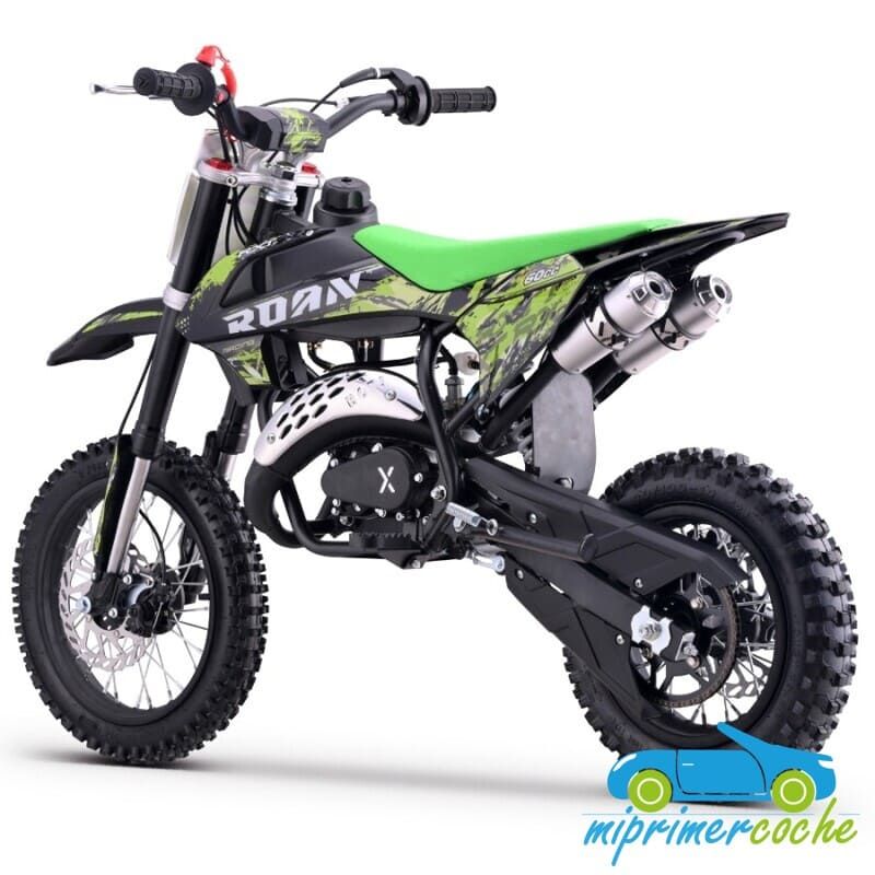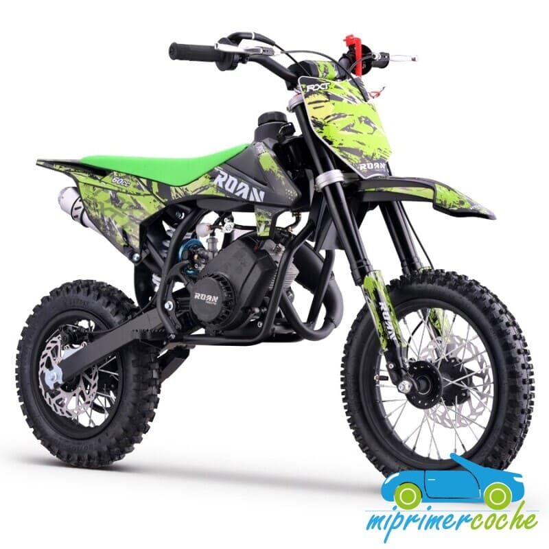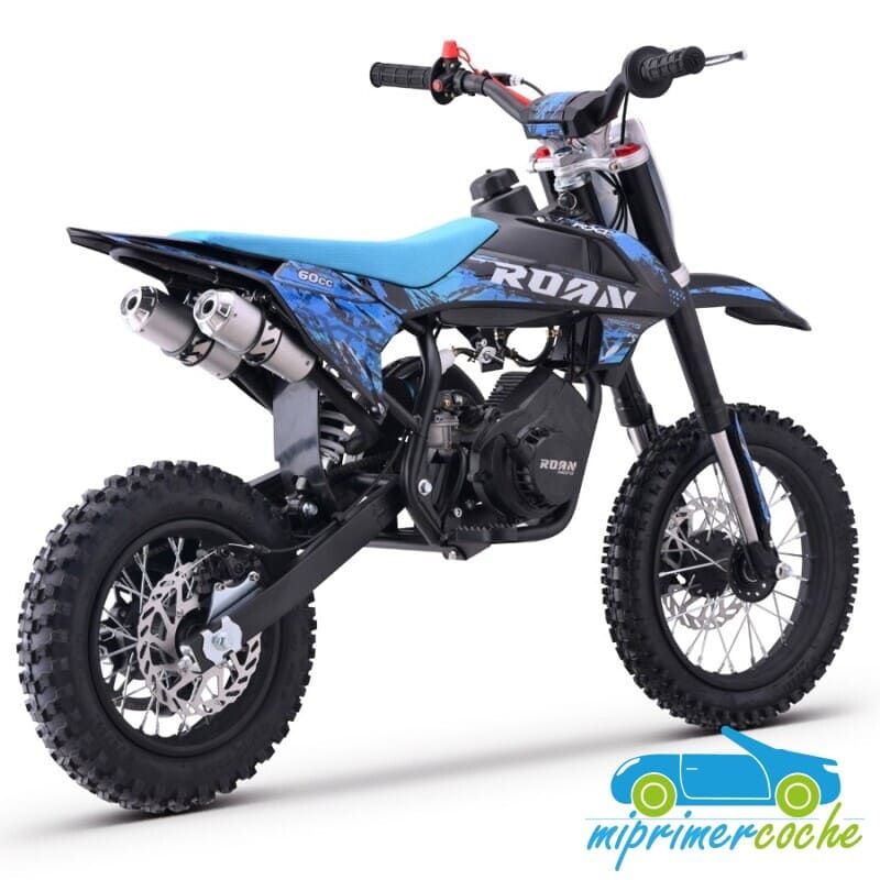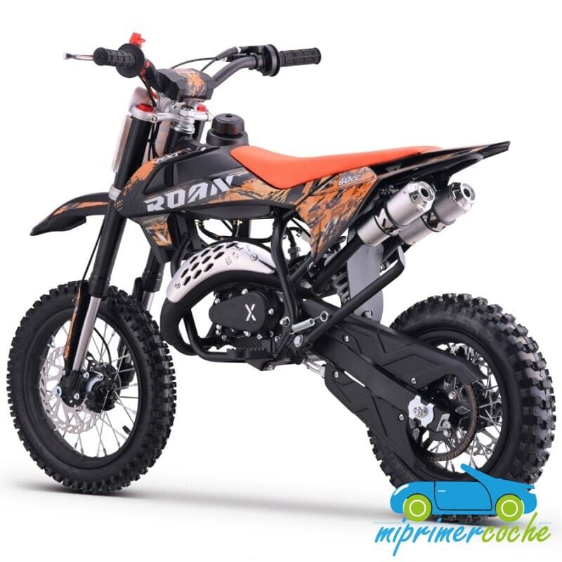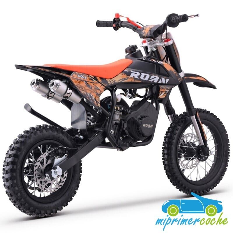 Mini moto off-road para niños con motor de 60cc, ruedas de 12” / 10'' , frenos de disco, limitador de velocidad y sistema hombre al agua. Alcanza hasta 45 km/h. Altura al sillín: 65 cm. Arranque fácil por tirador..