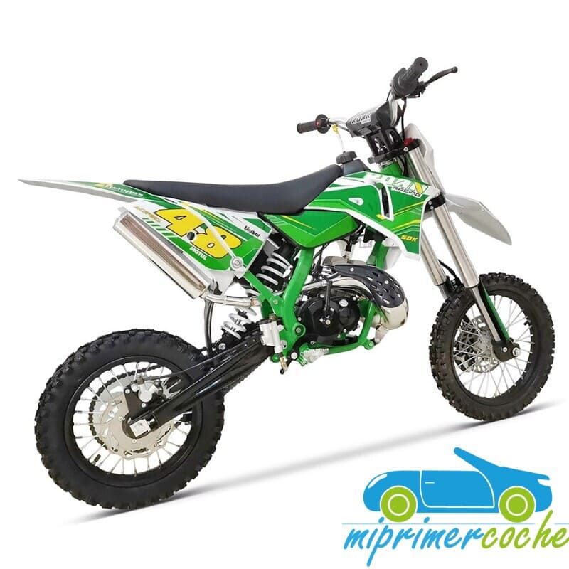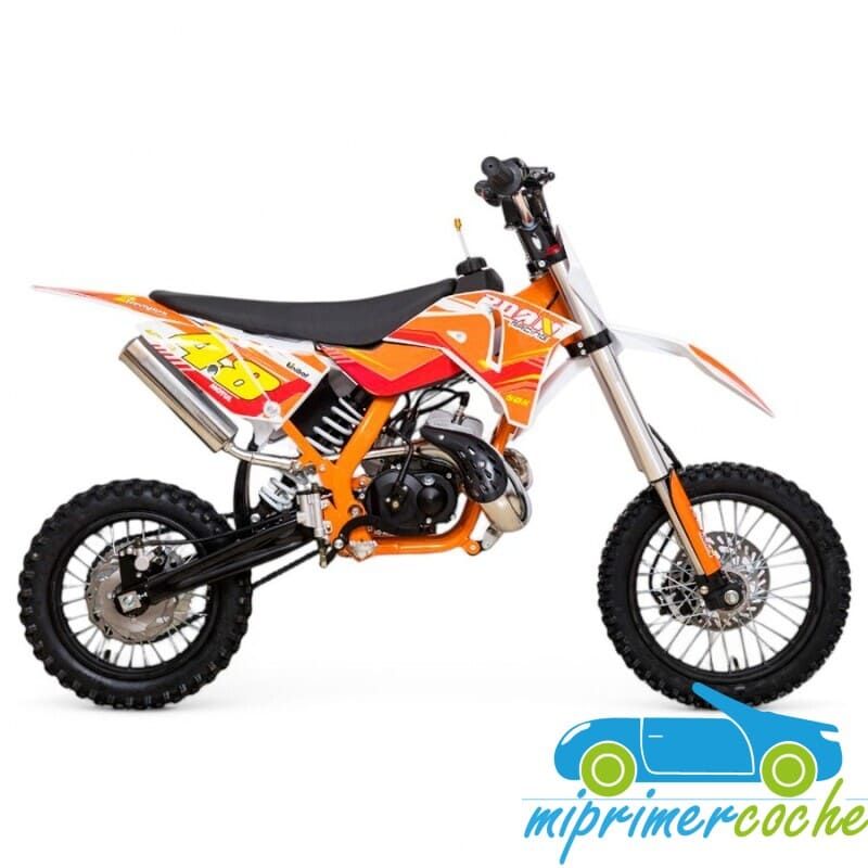 PIT BIKE de gasolina para niños 50K 50CC automático 2 tiempos, frenos de discos, suspensión, arranque con el pedal, altura del suelo al asiento 78cm, máxima carga 150 kg, ruedas de 14/12''