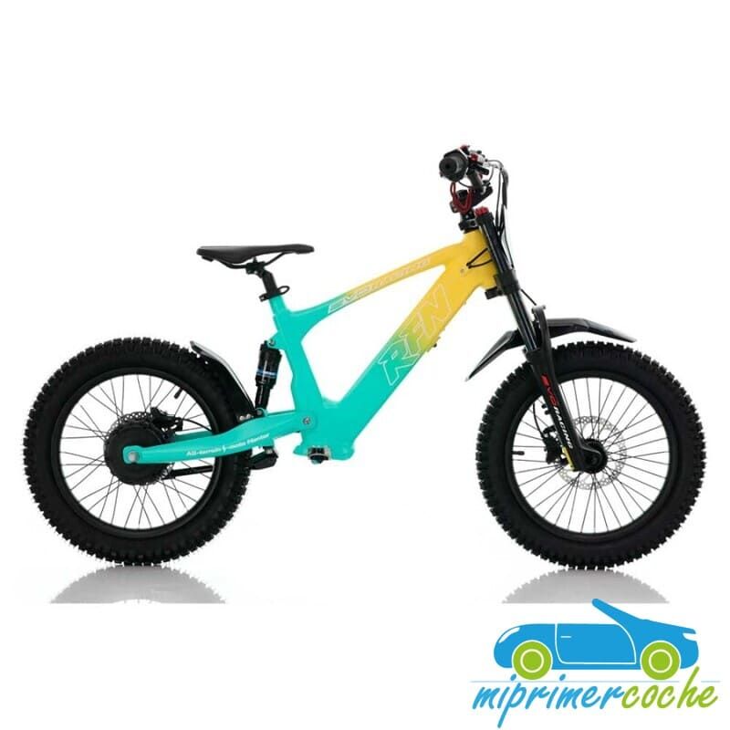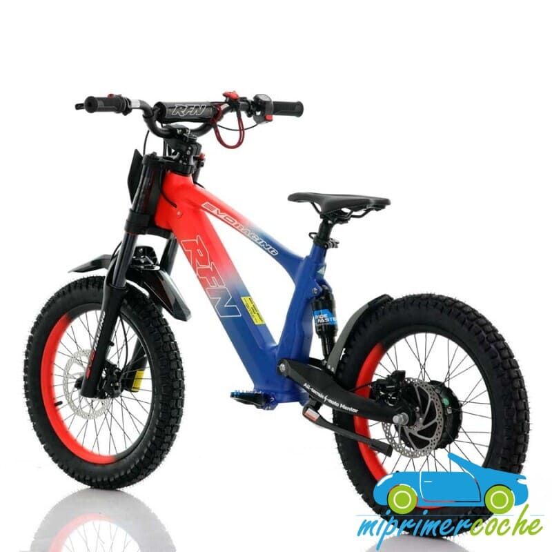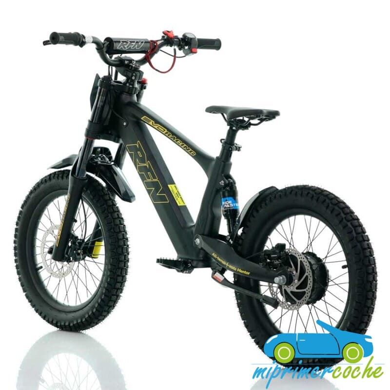 Bicicleta eléctrica para niños RFN EVO 18'' 36V500W, con velocidad máxima de 30 km/h, limitador de velocidad, batería de litio extraíble, asiento ajustable y frenos de discos. Ideal para diversión segura y controlada.