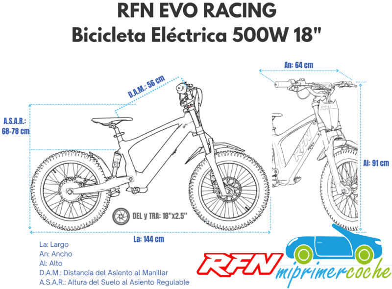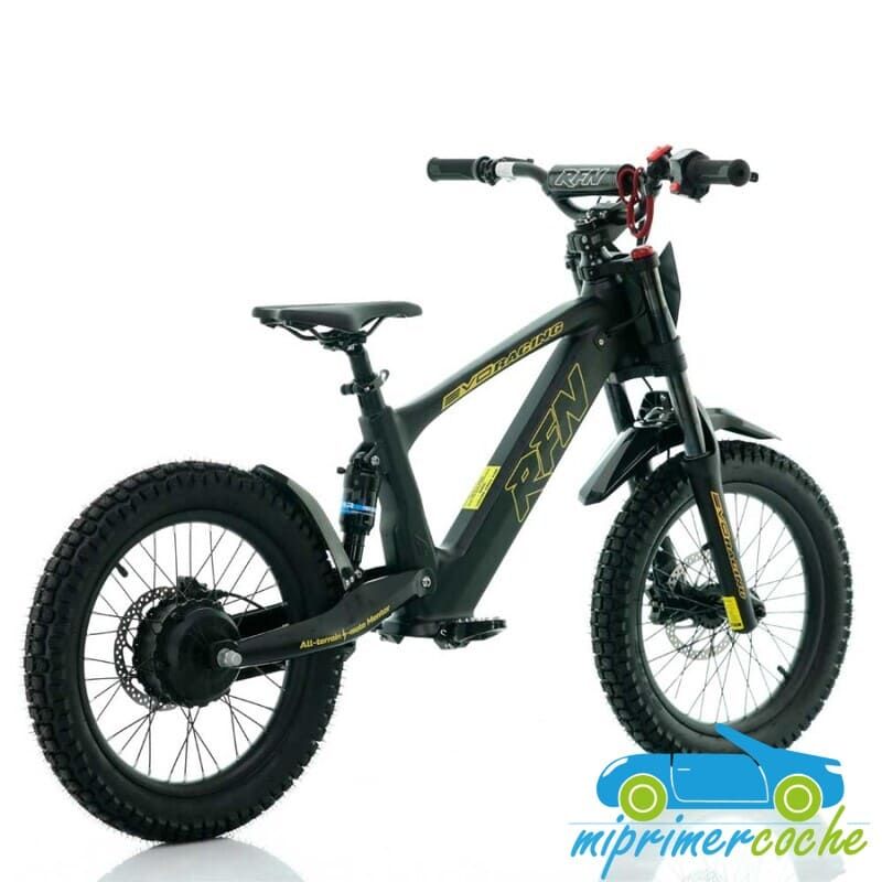 Bicicleta eléctrica para niños RFN EVO 18'' 36V500W, con velocidad máxima de 30 km/h, limitador de velocidad, batería de litio extraíble, asiento ajustable y frenos de discos. Ideal para diversión segura y controlada.