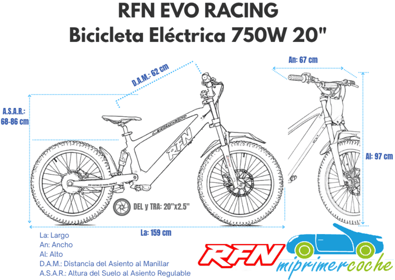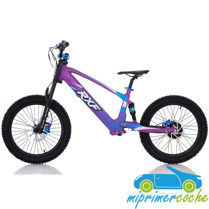 Bicicleta eléctrica para niños RXF EVO 20 pulgadas 36V 750W, con velocidad máxima de 35 km/h, limitador de velocidad, batería de litio extraíble, asiento ajustable y frenos de discos. Ideal para diversión segura y controlada.