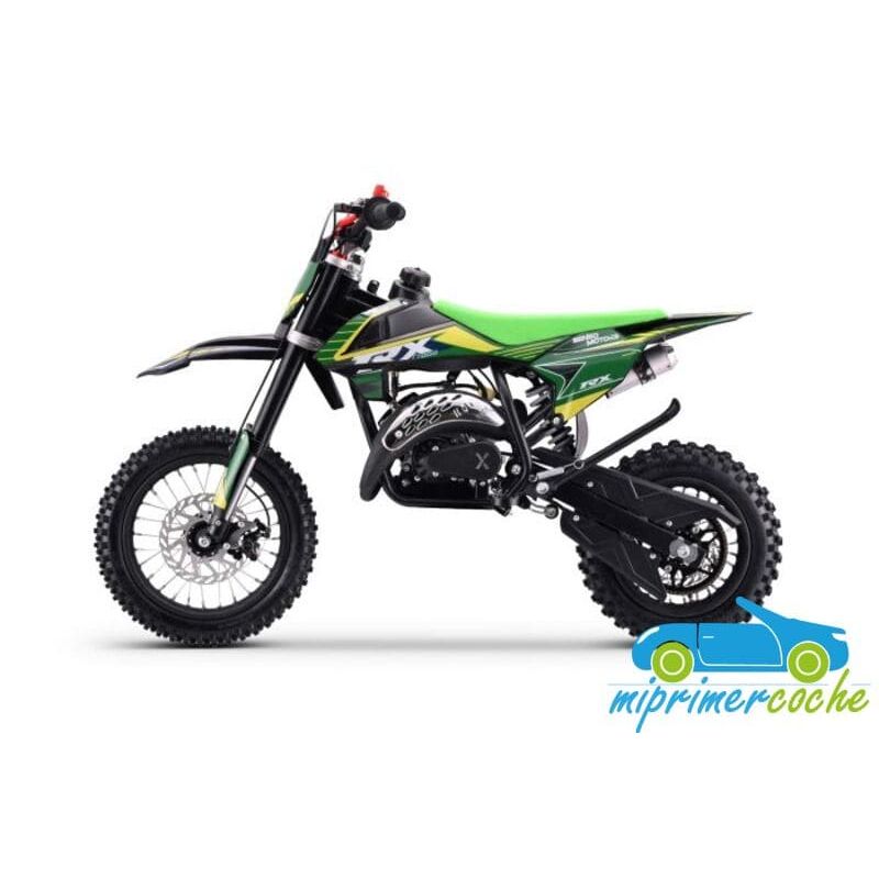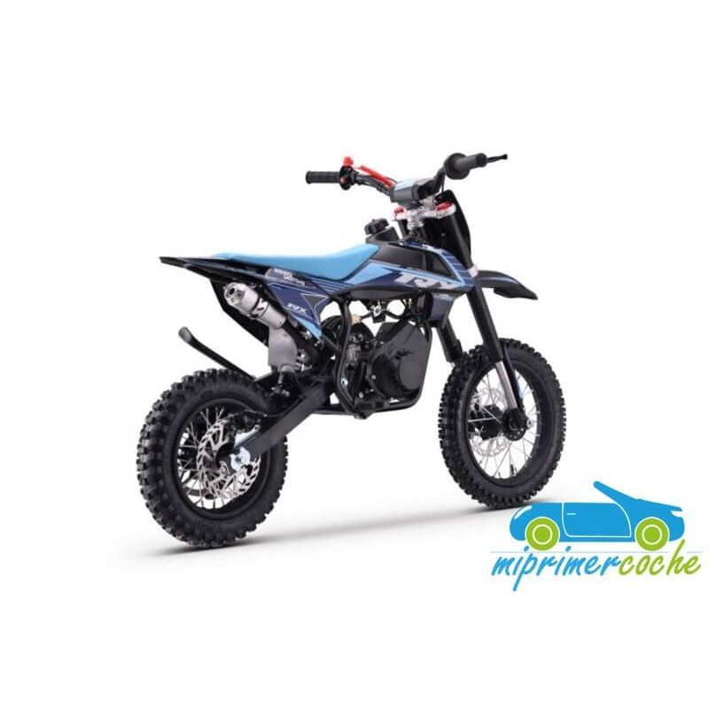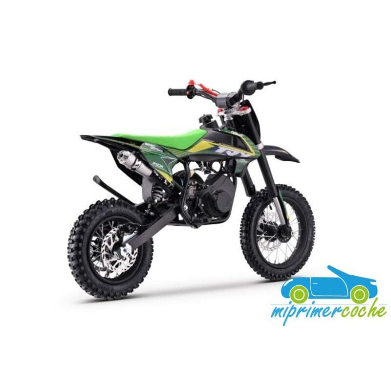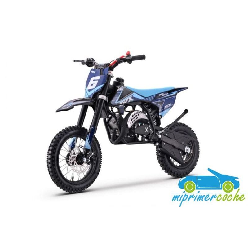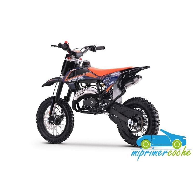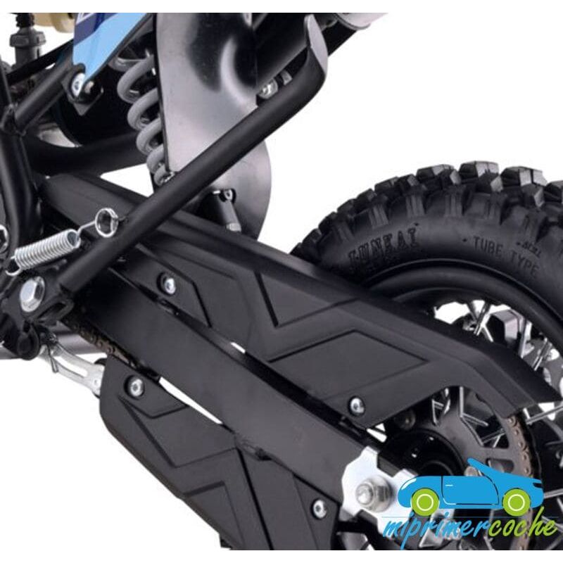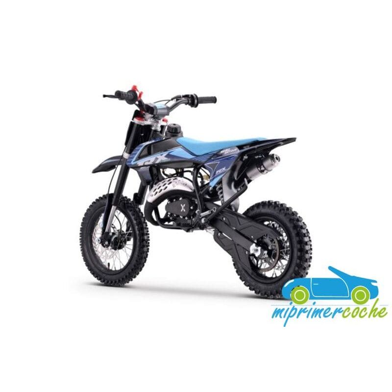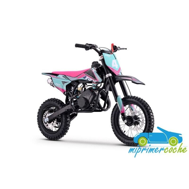 Mini moto off-road para niños con motor de 60cc, ruedas de 12” / 10'' , frenos de disco, limitador de velocidad y sistema hombre al agua. Alcanza hasta 50 km/h. Altura al sillín: 65 cm. Arranque fácil por tirador..