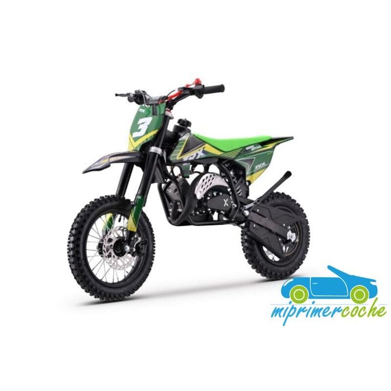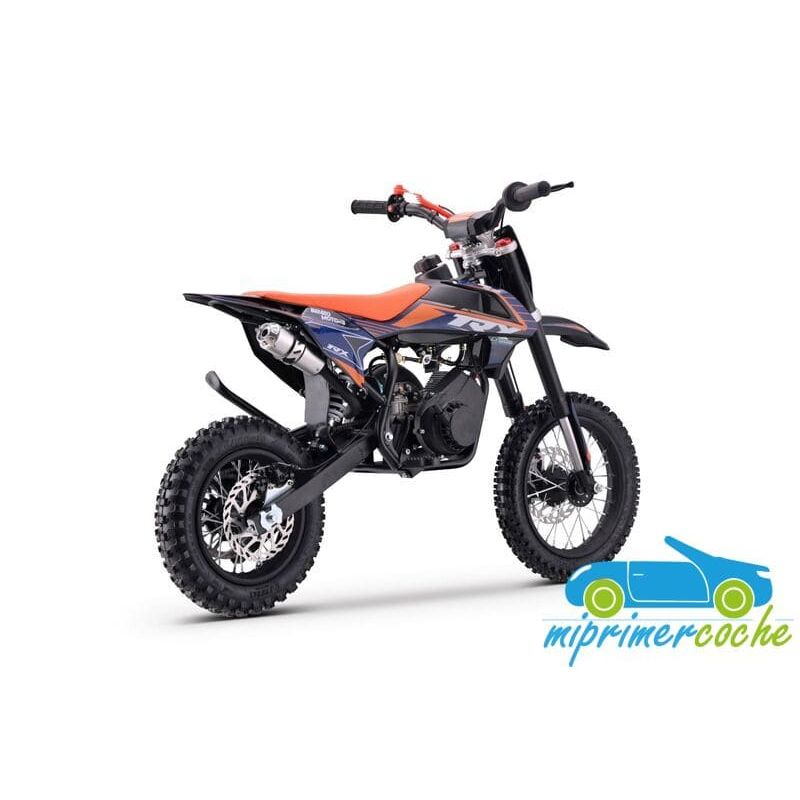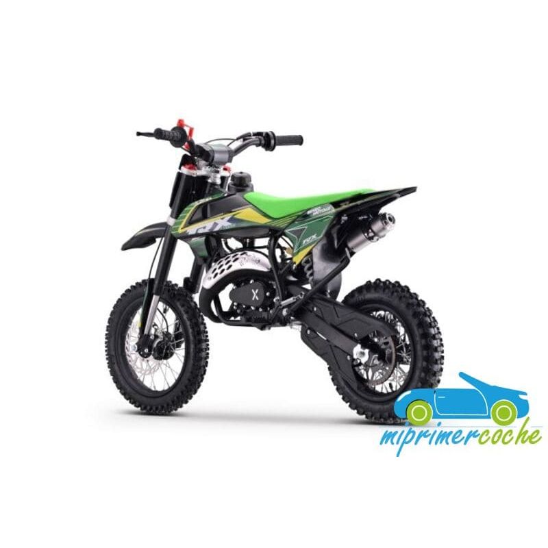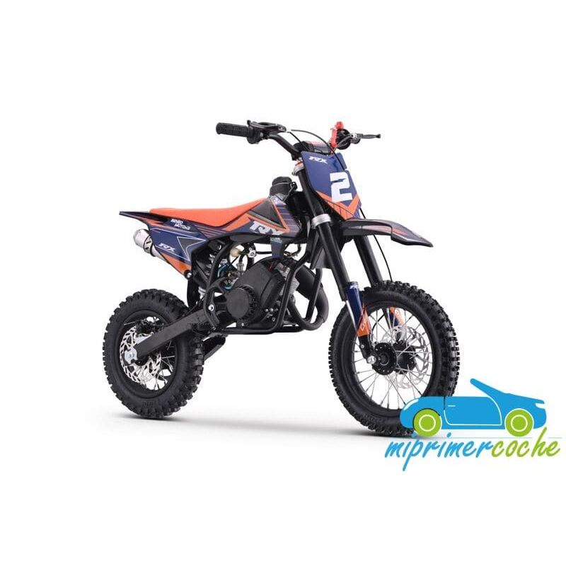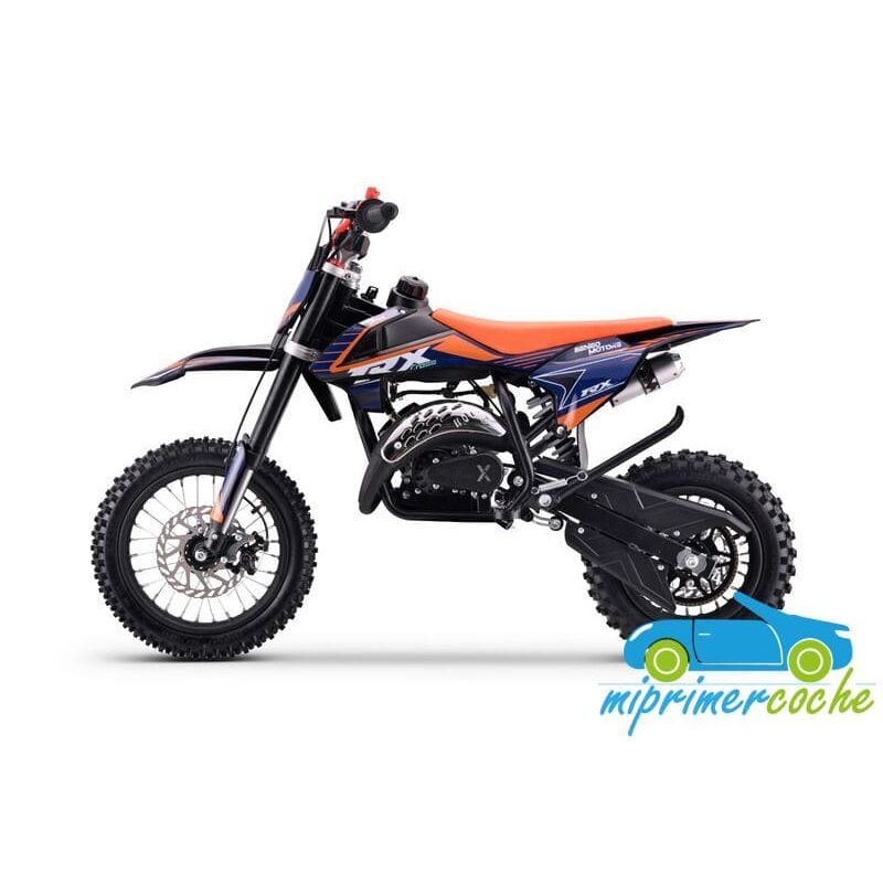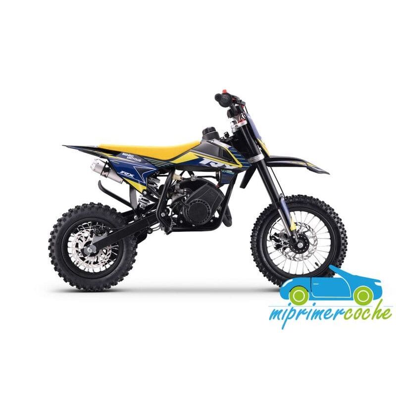 Mini moto off-road para niños con motor de 60cc, ruedas de 12” / 10'' , frenos de disco, limitador de velocidad y sistema hombre al agua. Alcanza hasta 50 km/h. Altura al sillín: 65 cm. Arranque fácil por tirador..