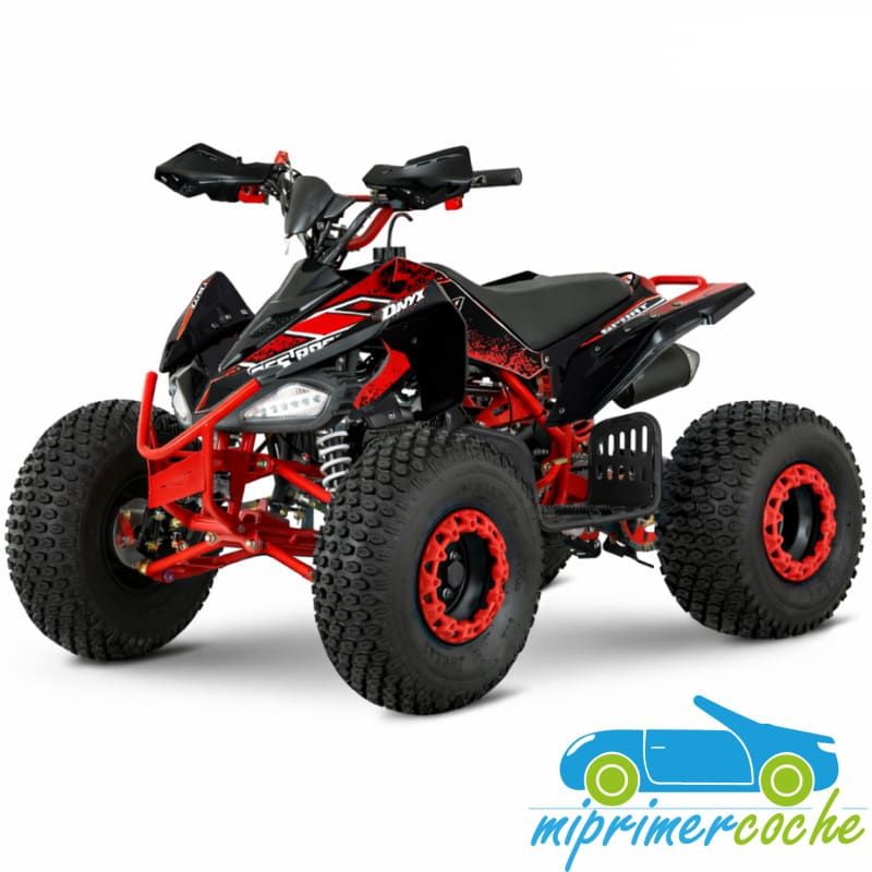 Quad Onyx de gasolina 125CC con motor 4 tiempos con ruedas de tacos, frenos hidráulicos, sistema de detención, arranque automático, potente, reforzado y llamativo.
