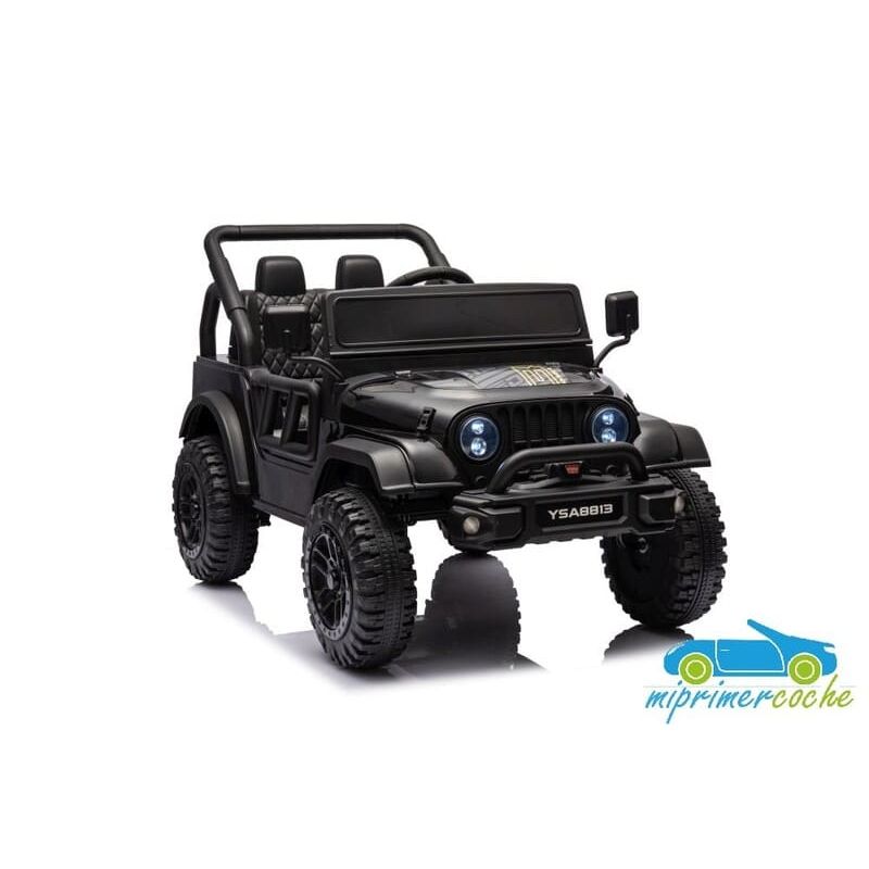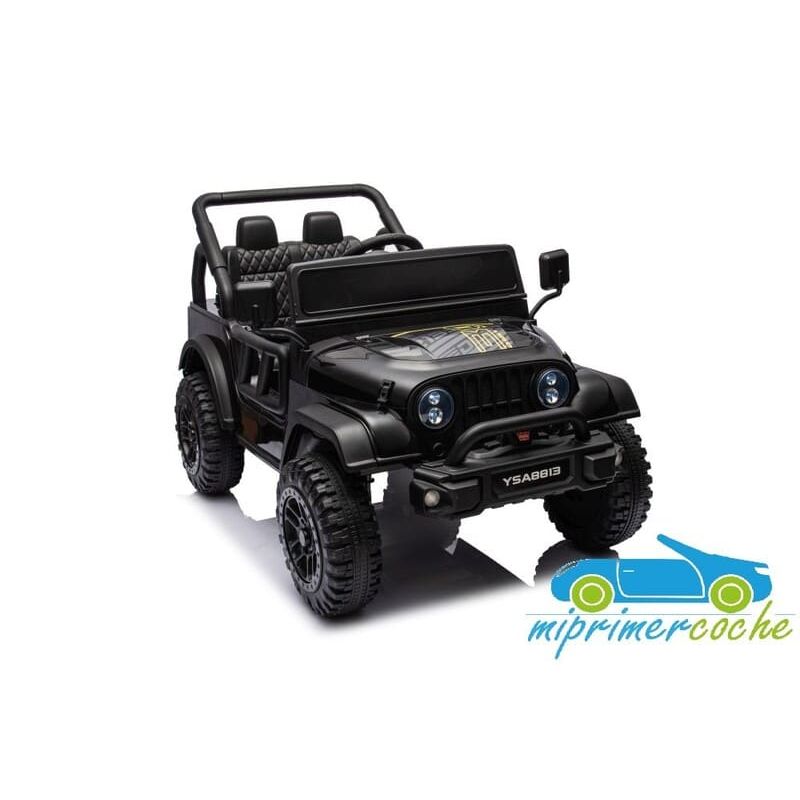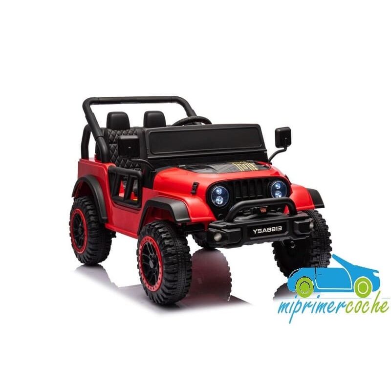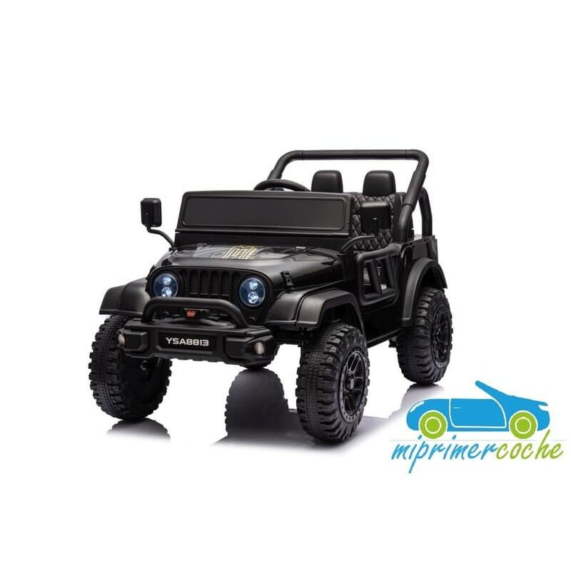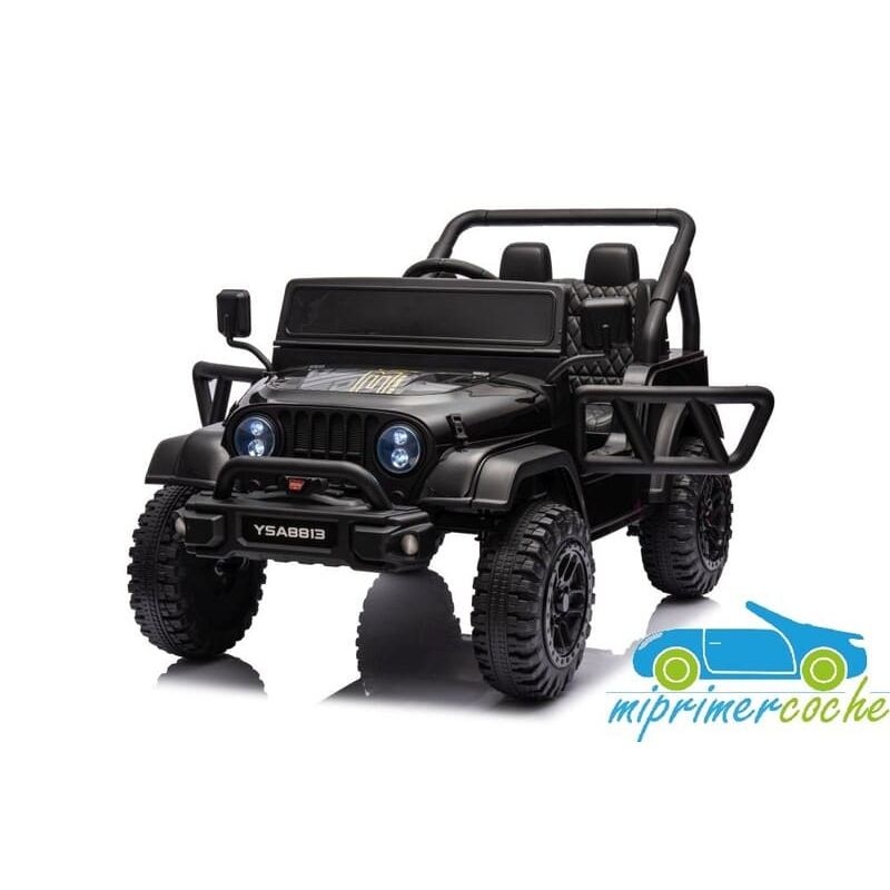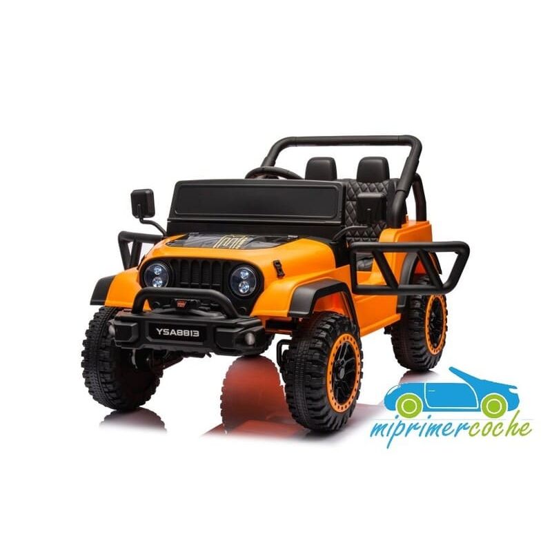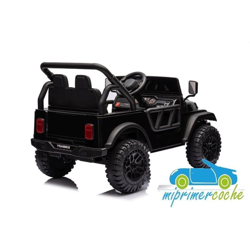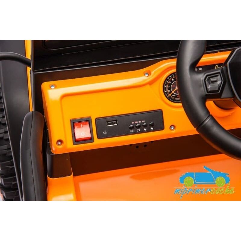 Un todoterreno 24 Voltios de 1 plaza,2 motores, equipado con ruedas de caucho , asiento en poli piel , luces led ,mando parental.
