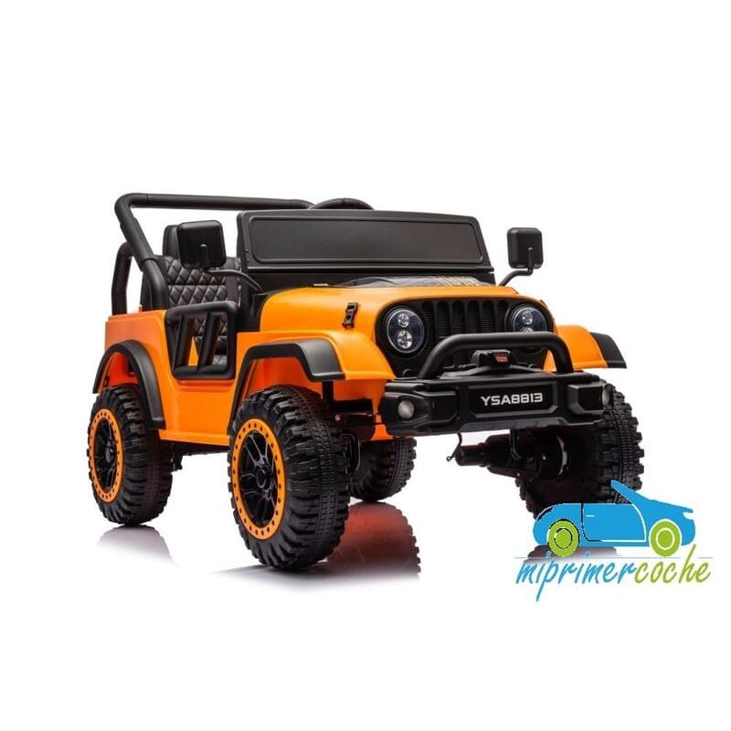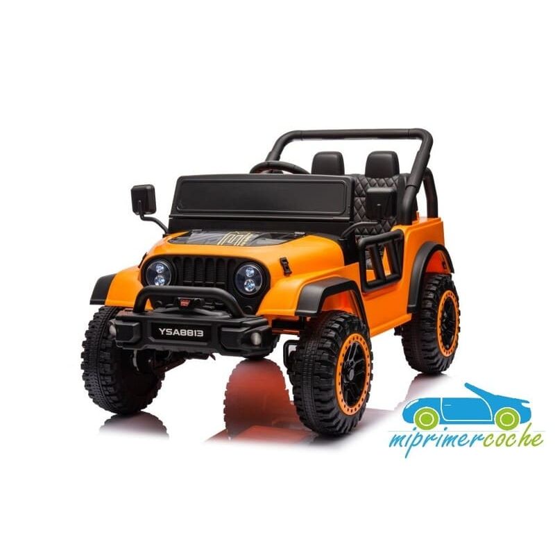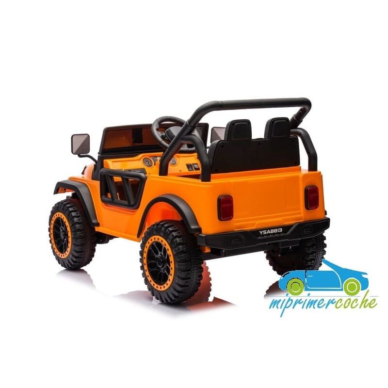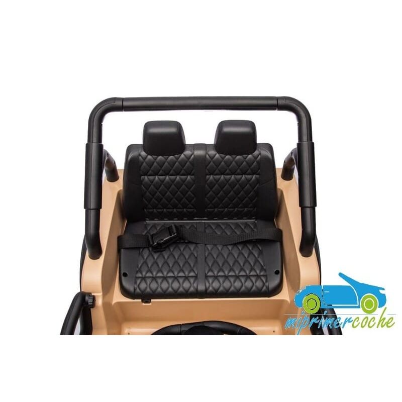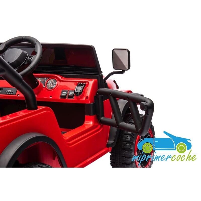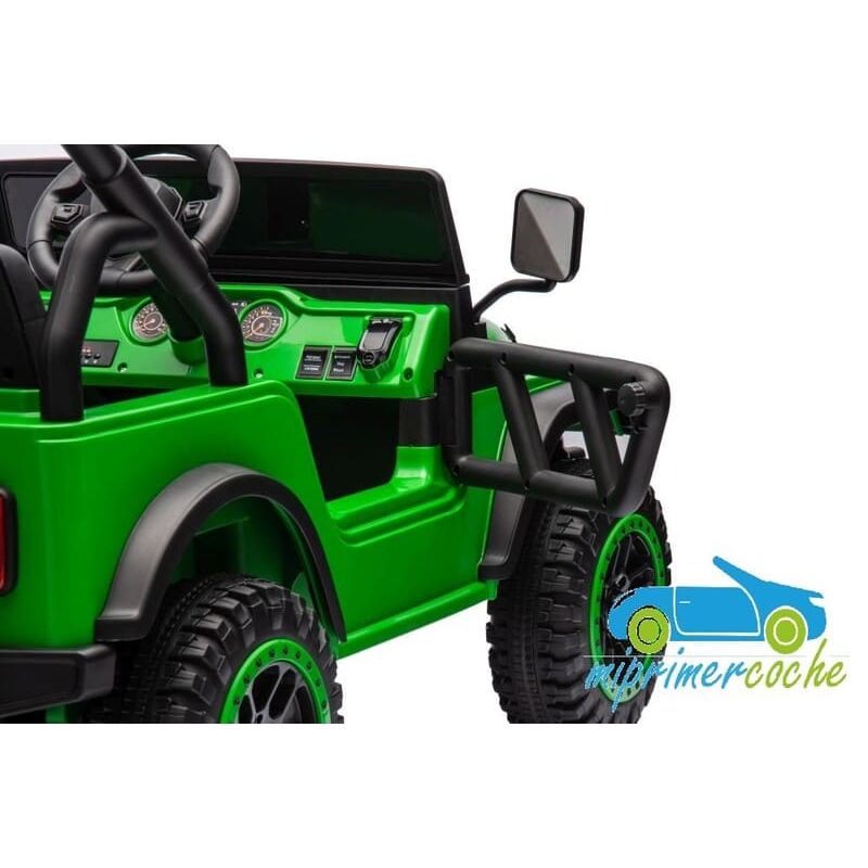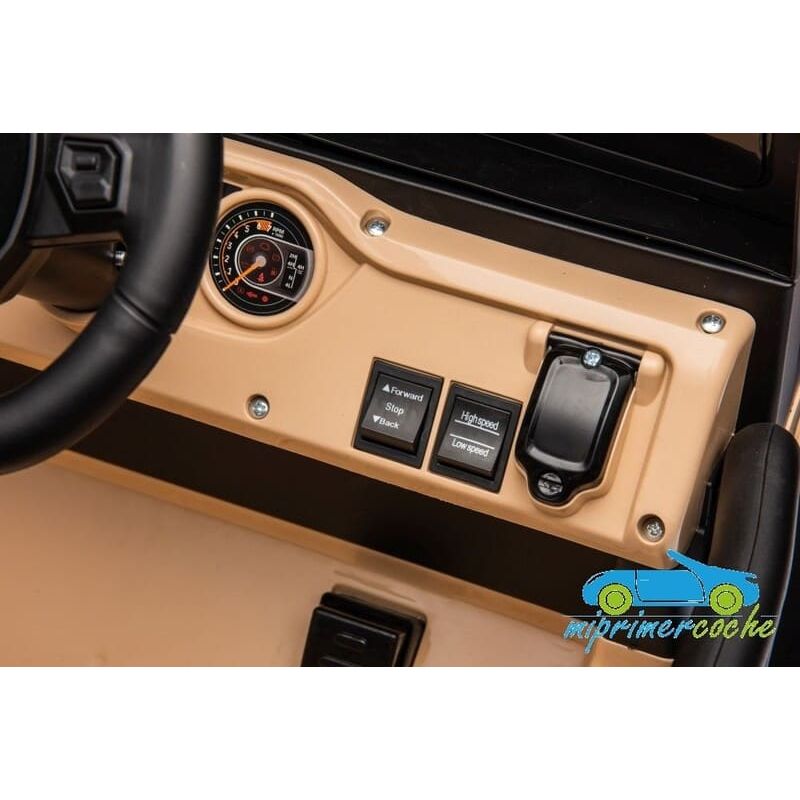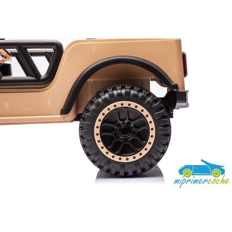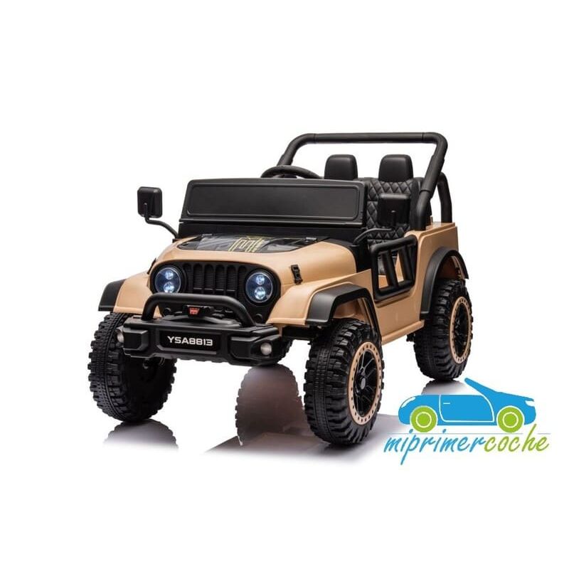 Un todoterreno 24 Voltios de 1 plaza,2 motores, equipado con ruedas de caucho , asiento en poli piel , luces led ,mando parental.