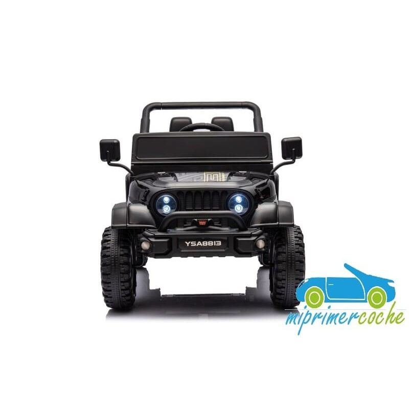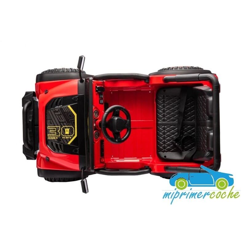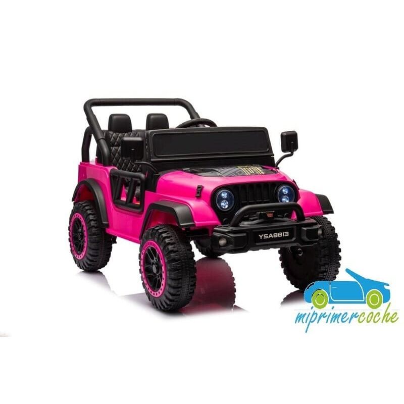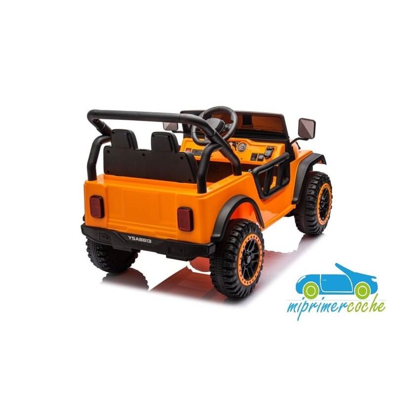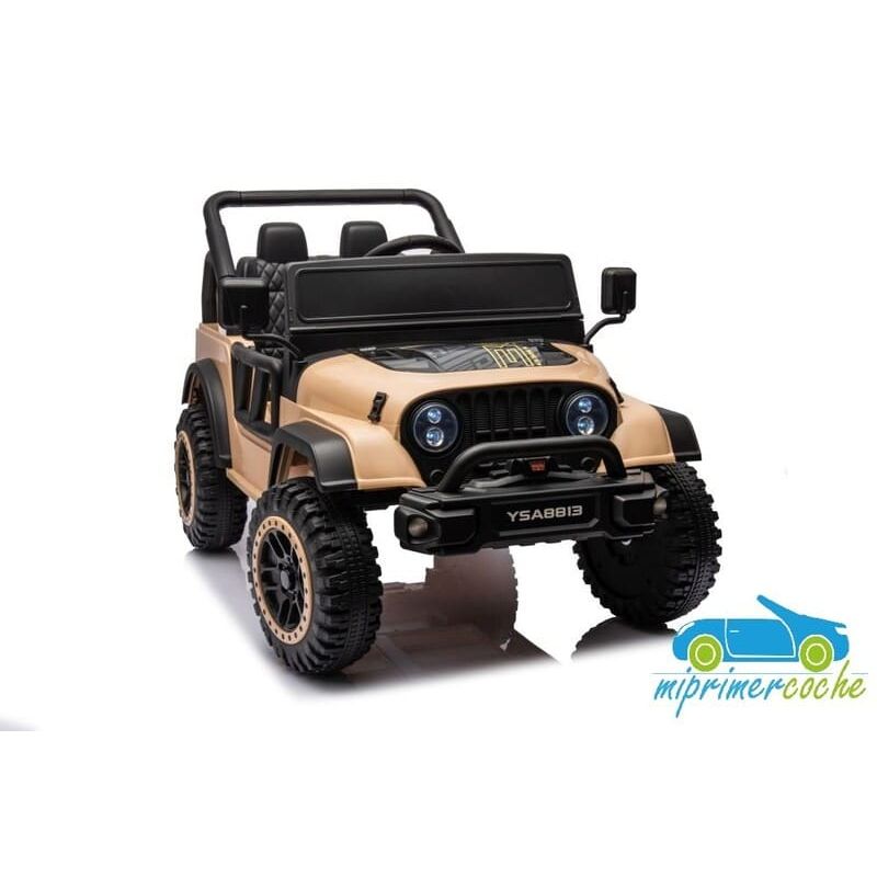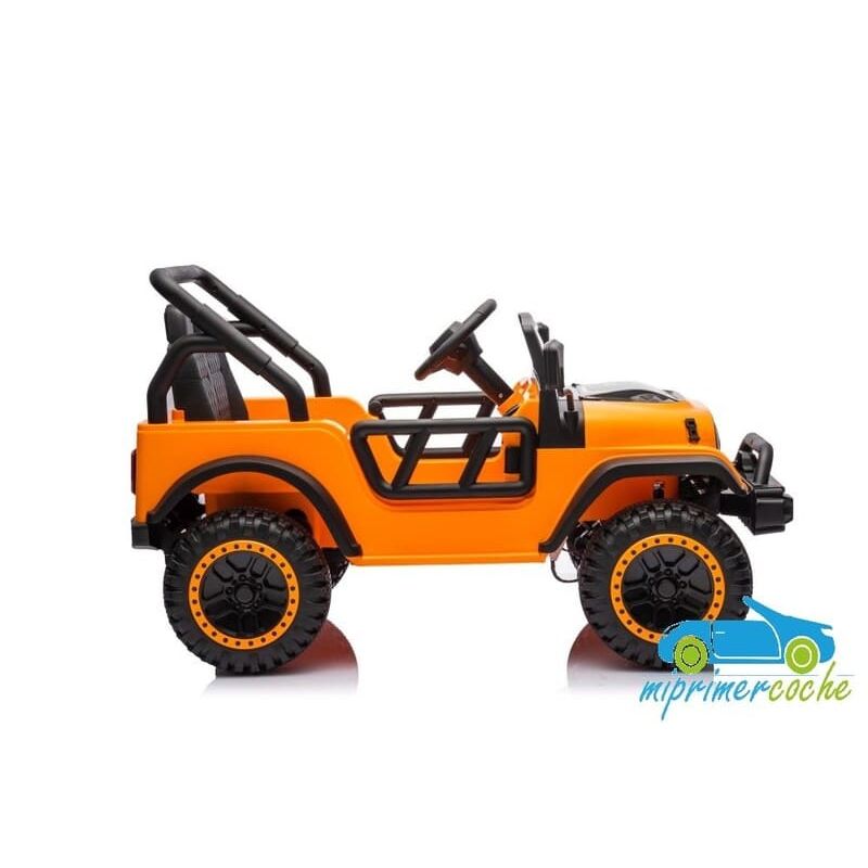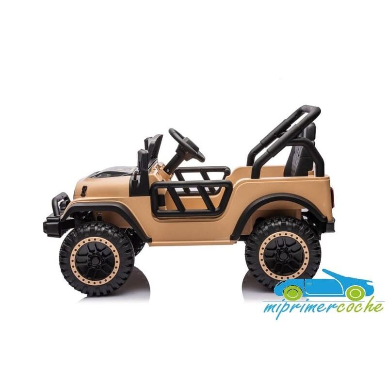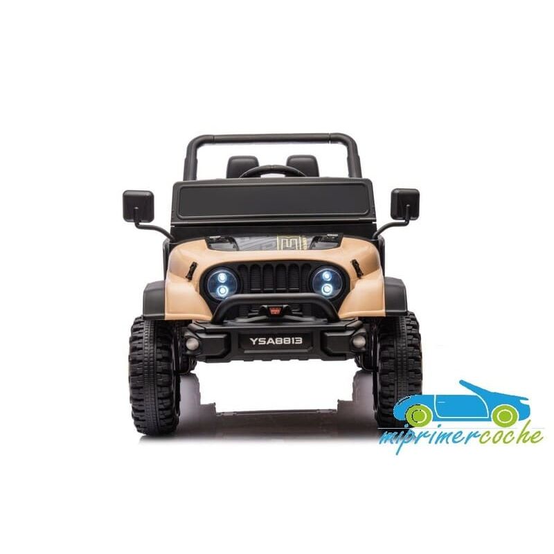 Un todoterreno 24 Voltios de 1 plaza,2 motores, equipado con ruedas de caucho , asiento en poli piel , luces led ,mando parental.