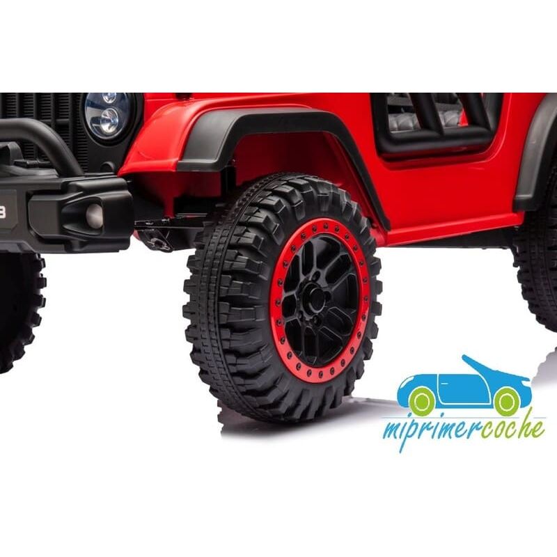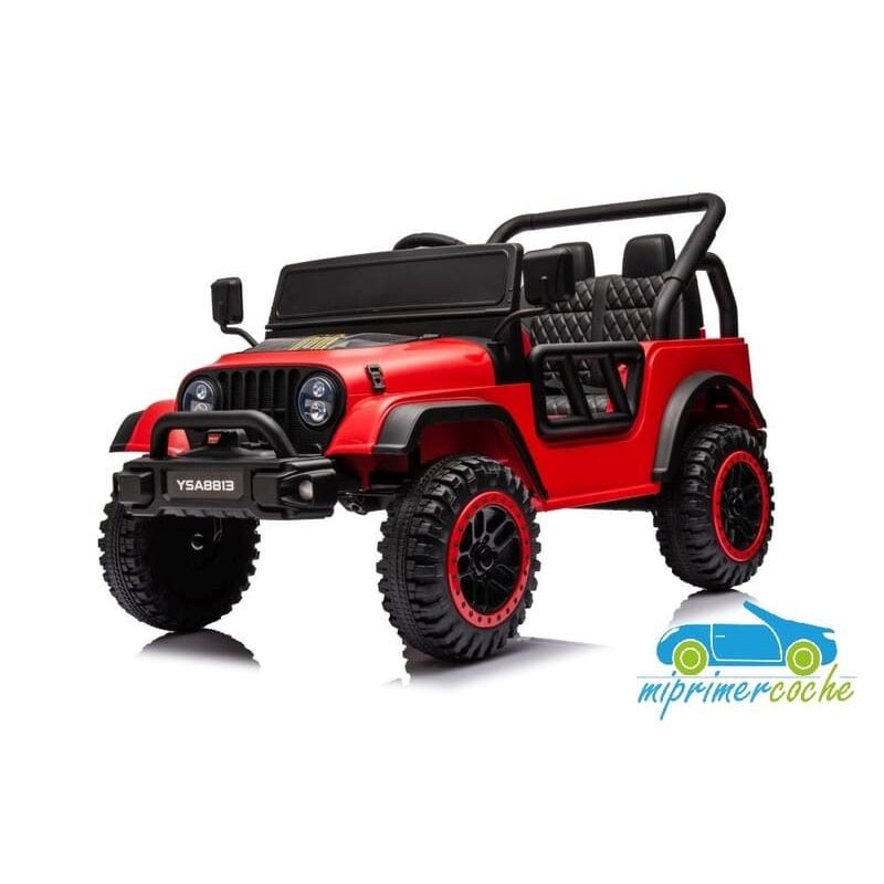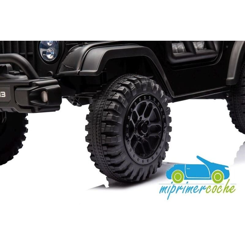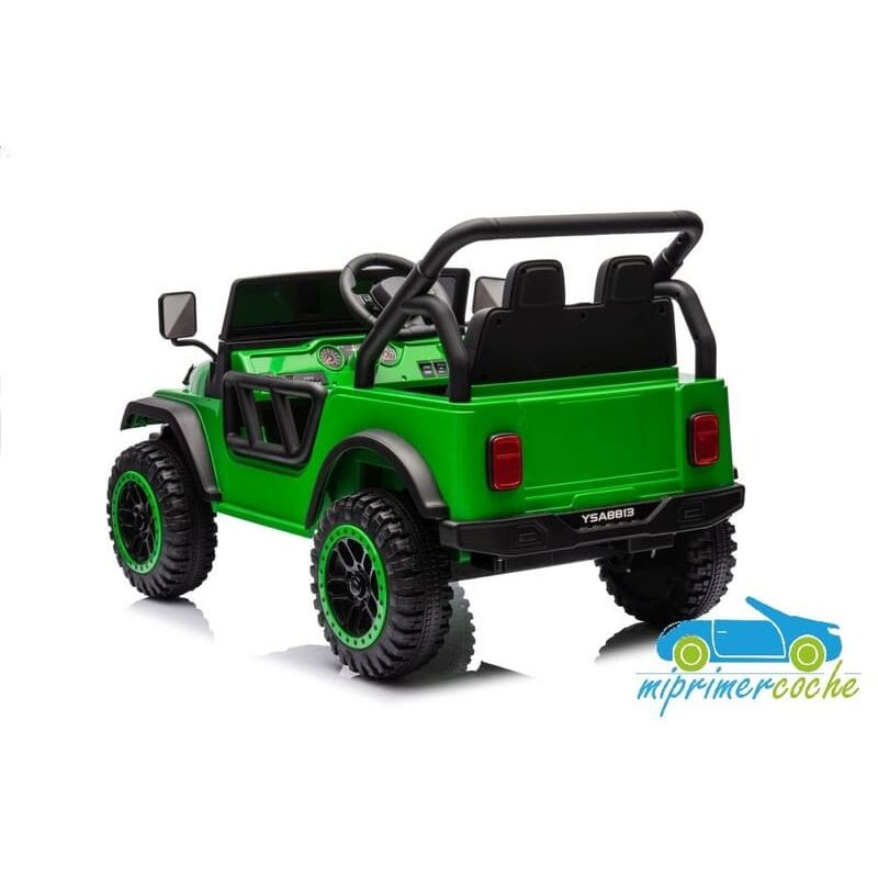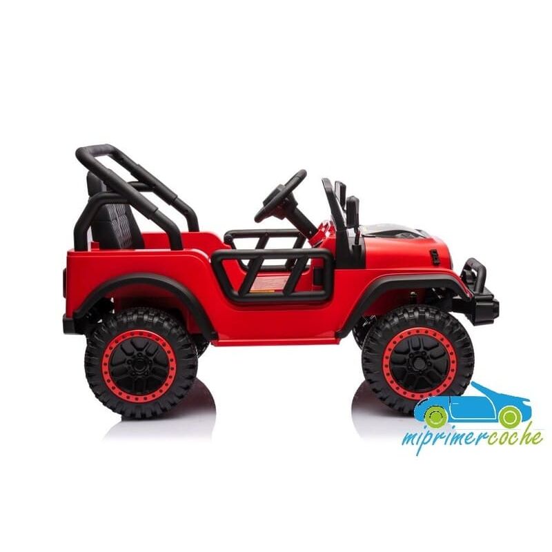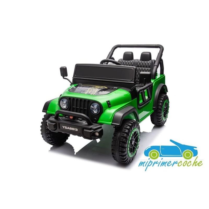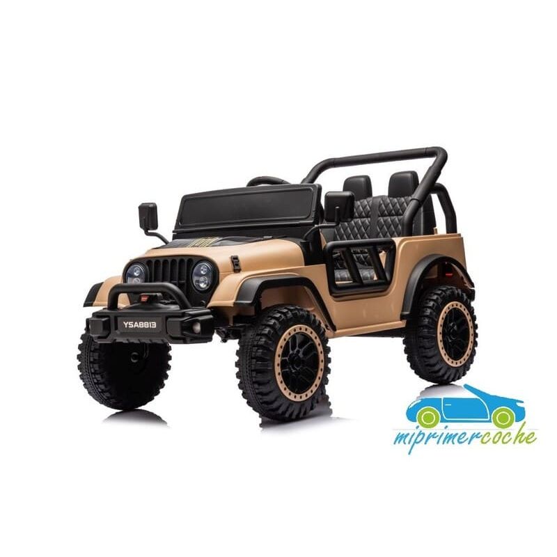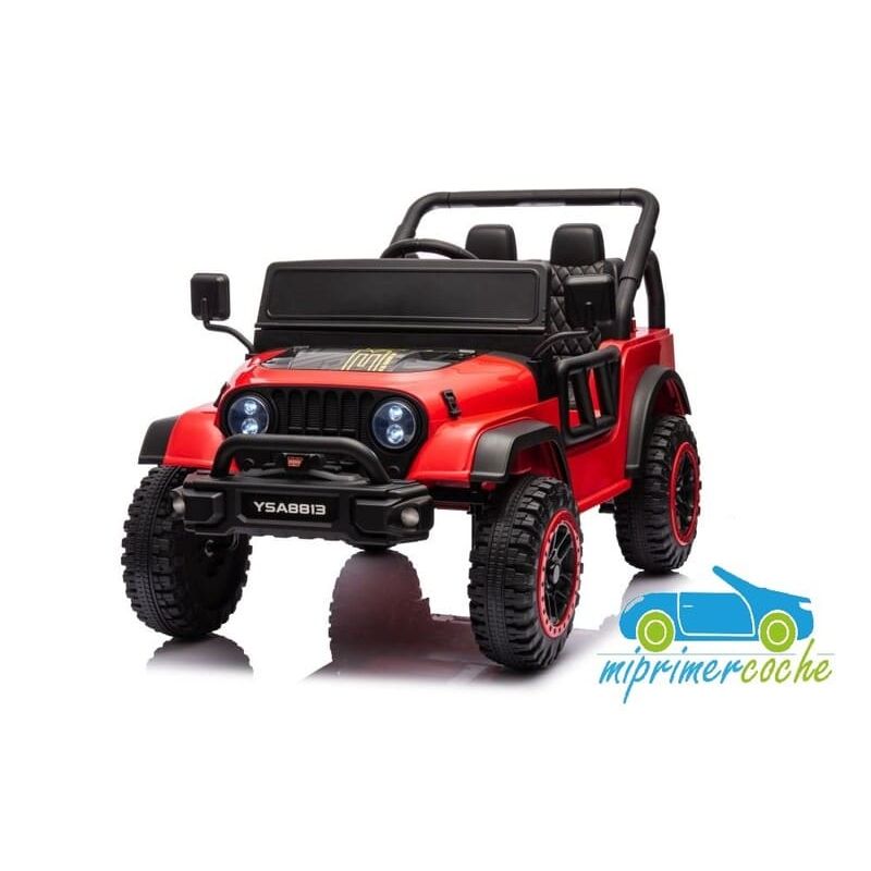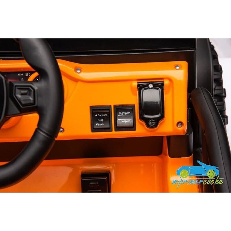 Un todoterreno 24 Voltios de 1 plaza,2 motores, equipado con ruedas de caucho , asiento en poli piel , luces led ,mando parental.