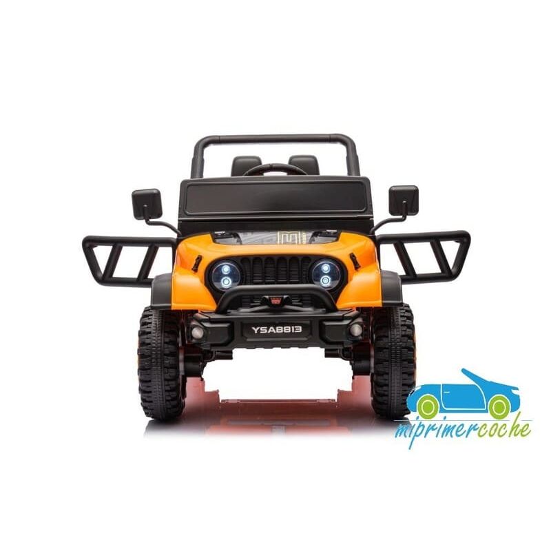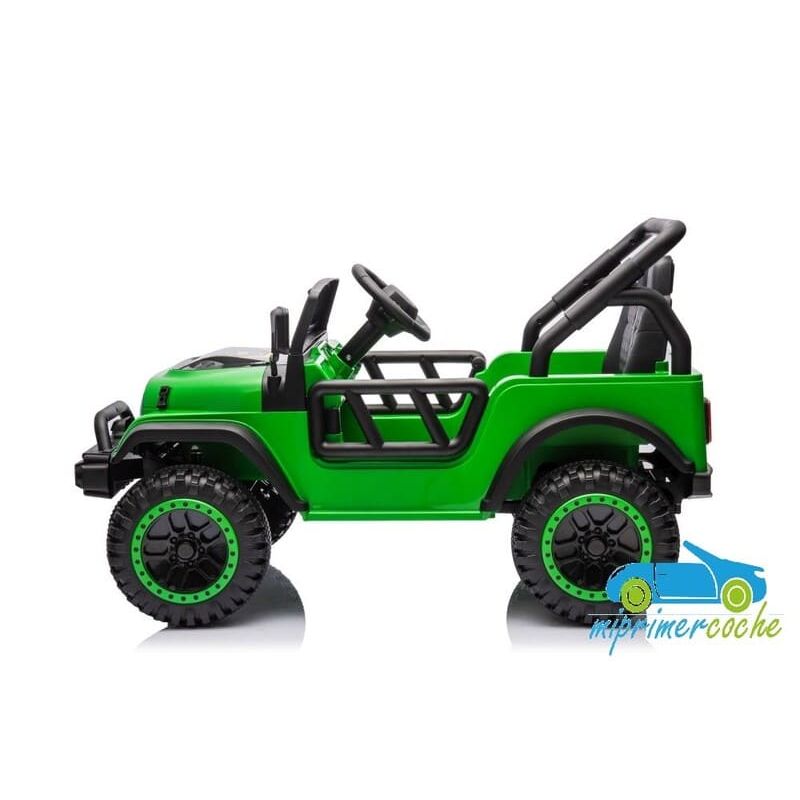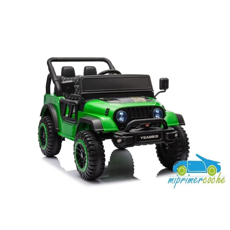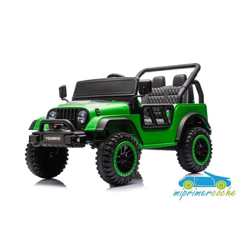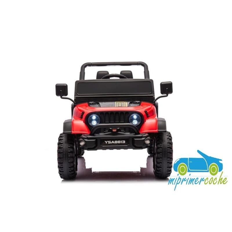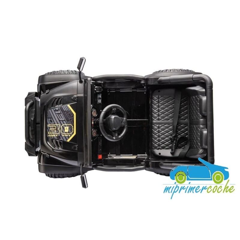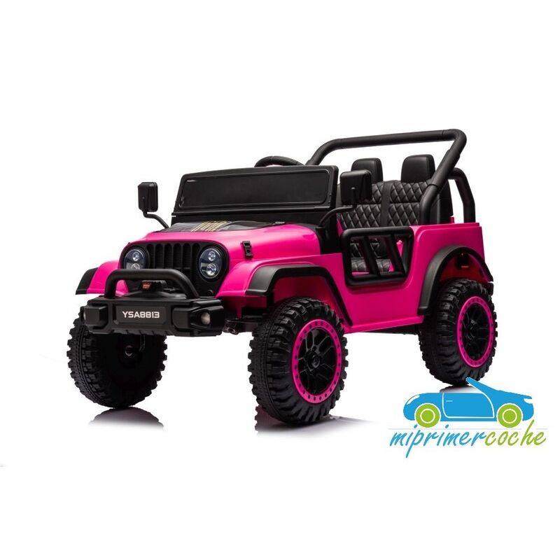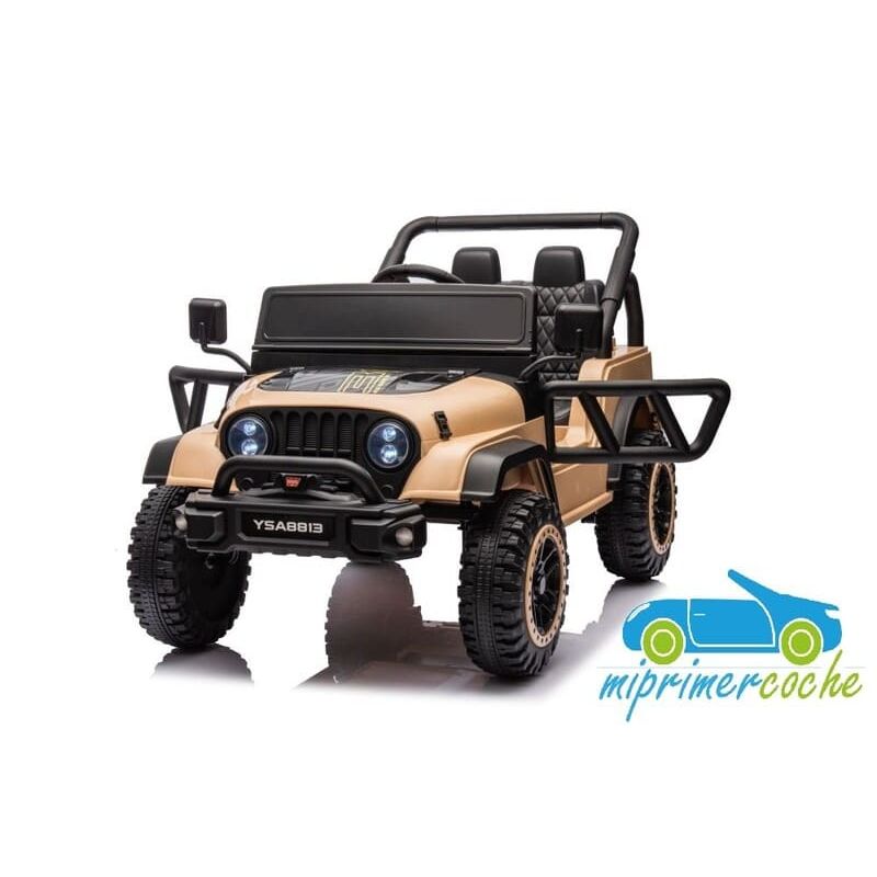 Un todoterreno 24 Voltios de 1 plaza,2 motores, equipado con ruedas de caucho , asiento en poli piel , luces led ,mando parental.