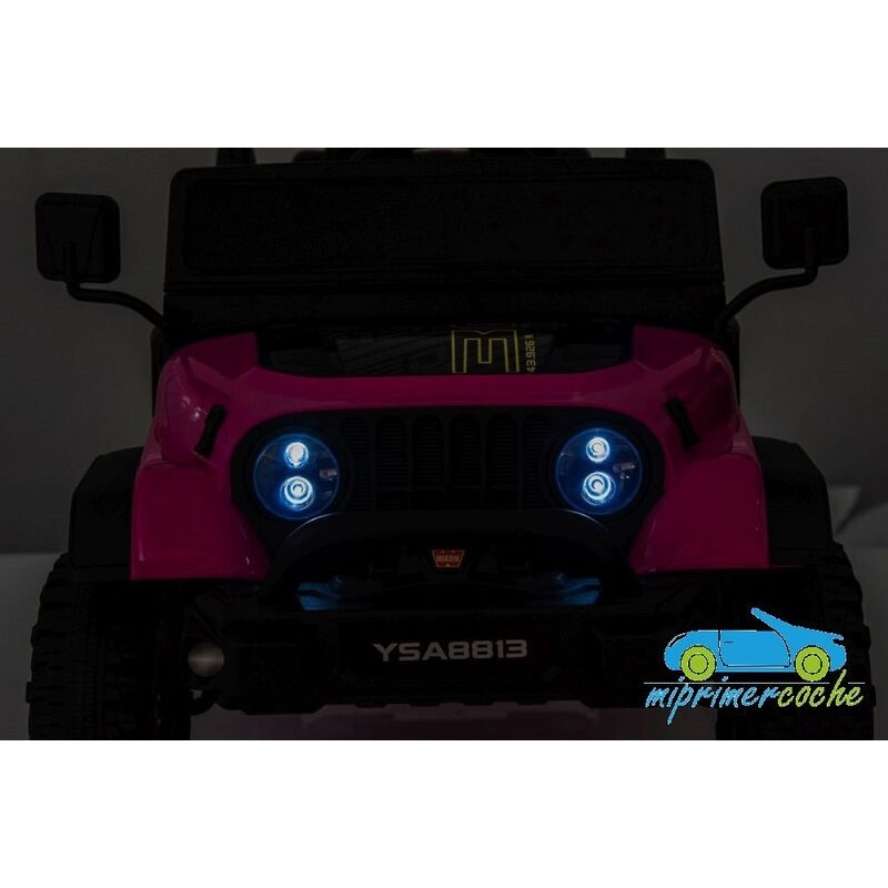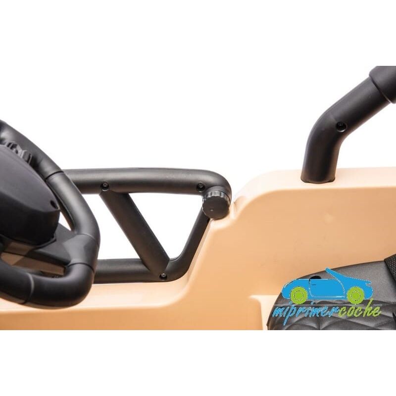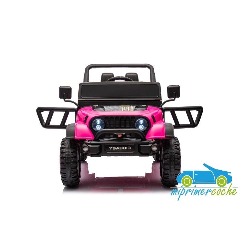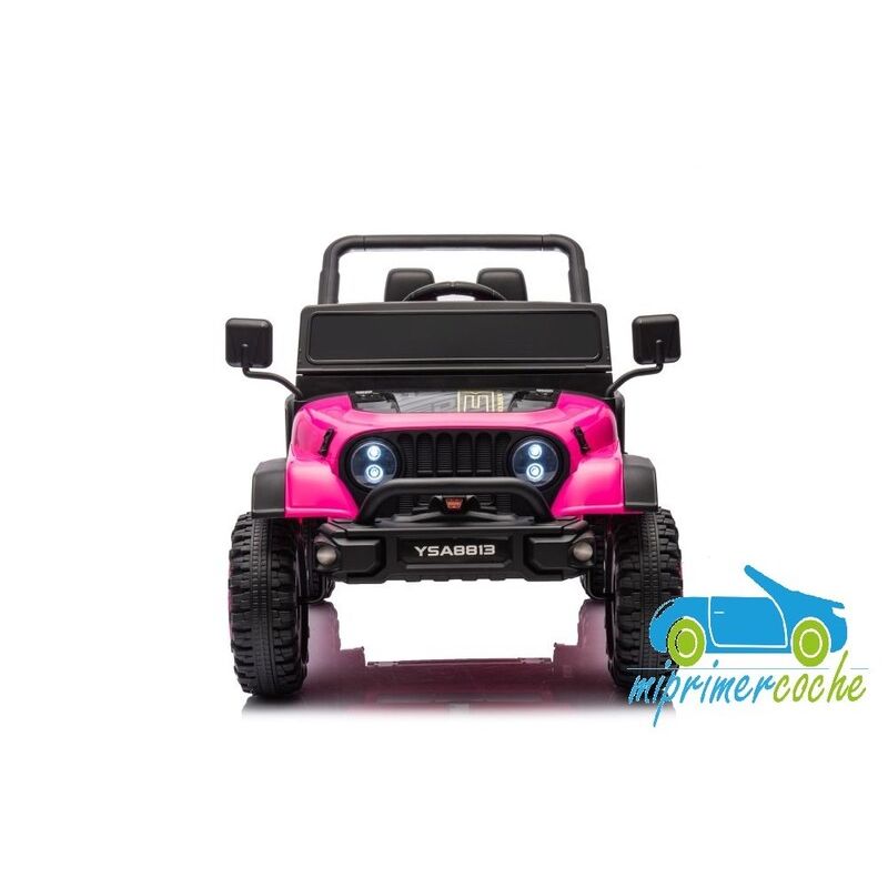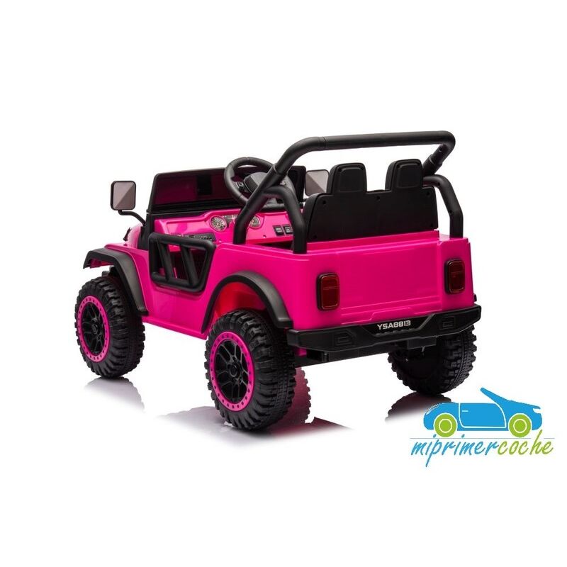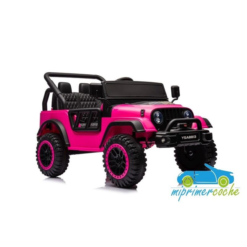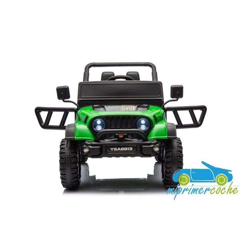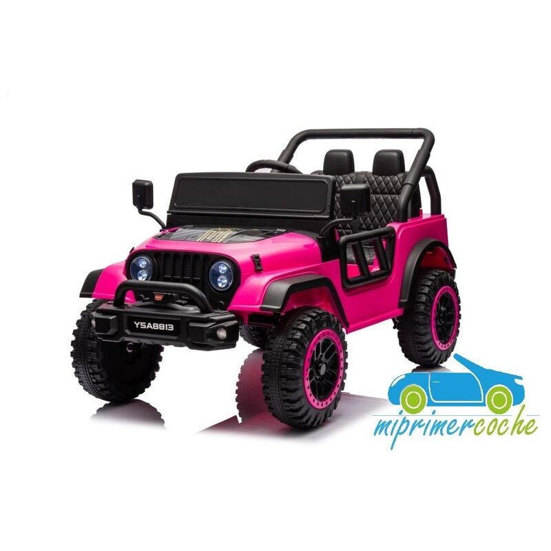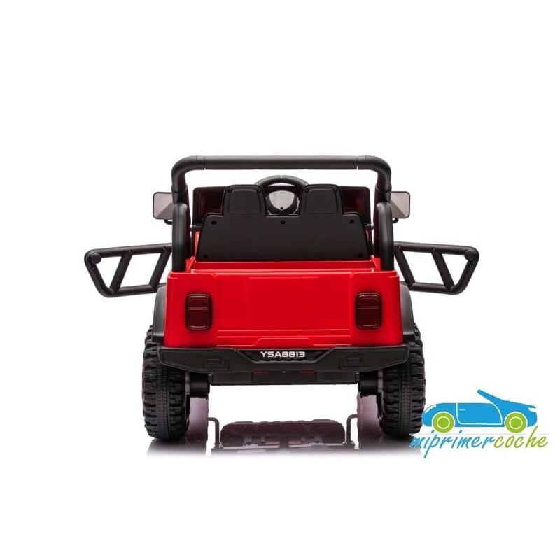 Un todoterreno 24 Voltios de 1 plaza,2 motores, equipado con ruedas de caucho , asiento en poli piel , luces led ,mando parental.