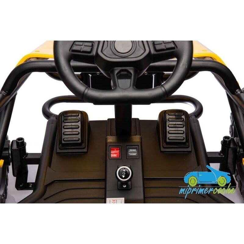 - el niño puede conducir el coche utilizando los controles que están en el interior del coche , con el pedal acelerador hacia adelante / atrás y girar con el volante . Cuando el niño levanta el pie del acelerador , aparece el freno eléctrico con función de parar el coche .