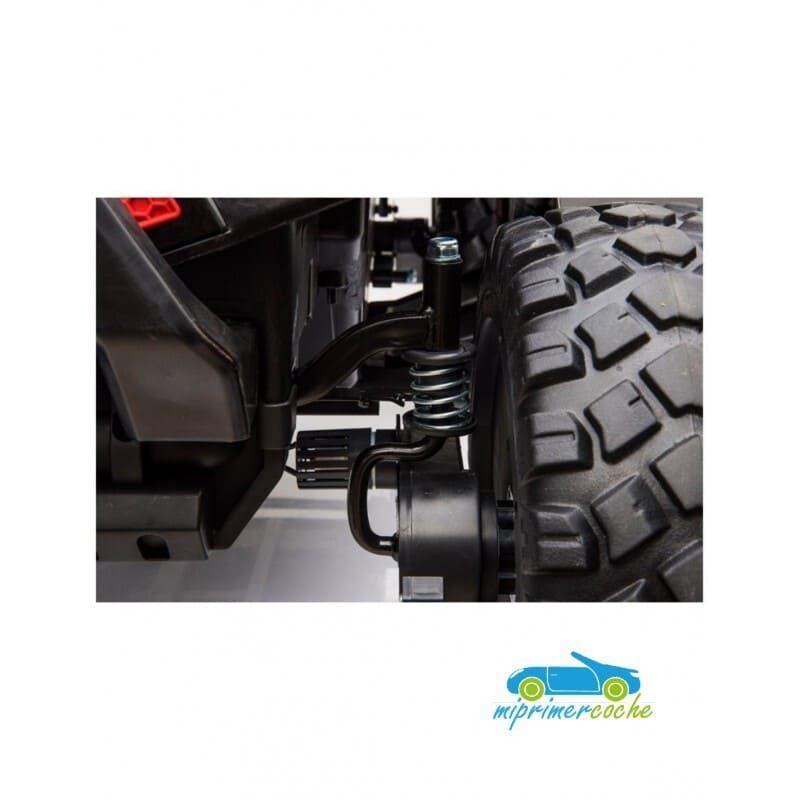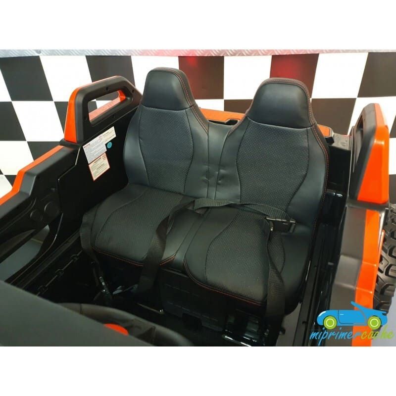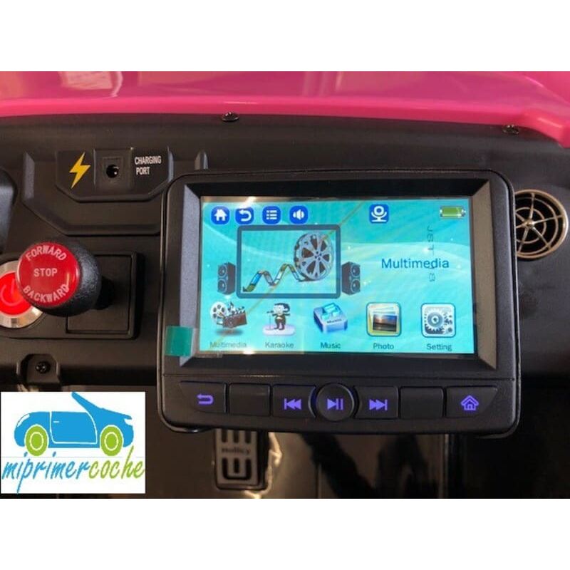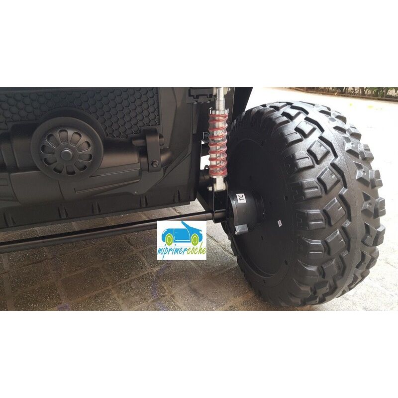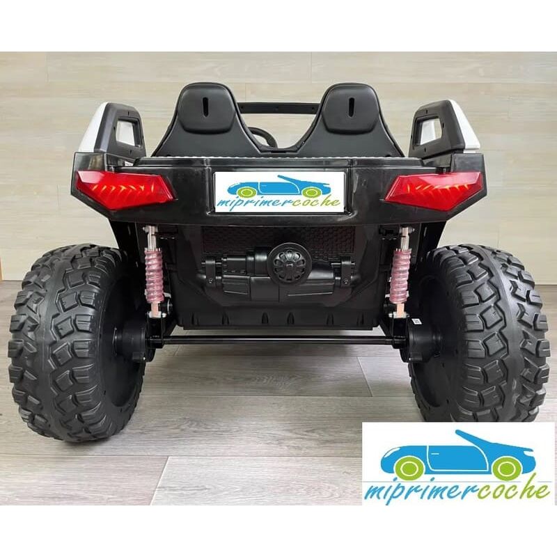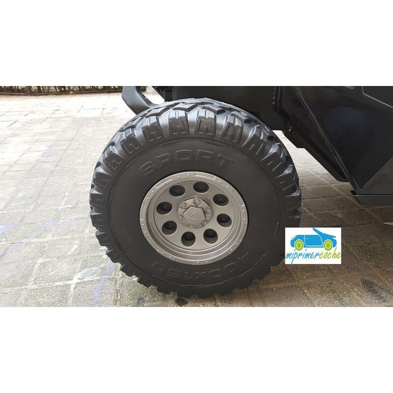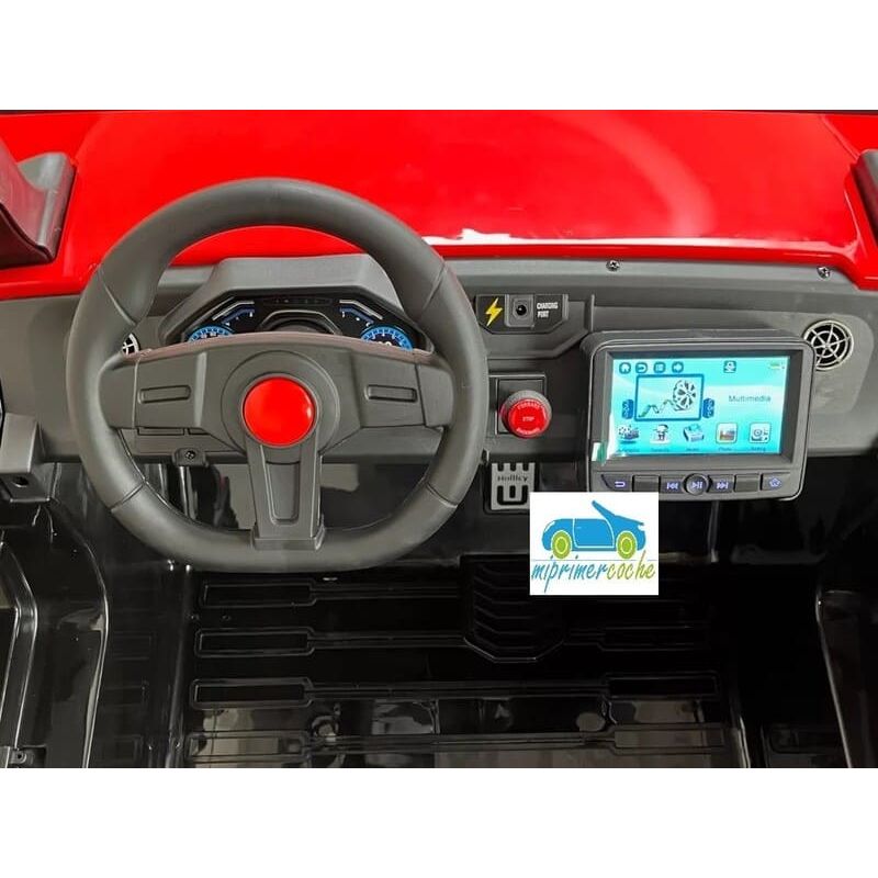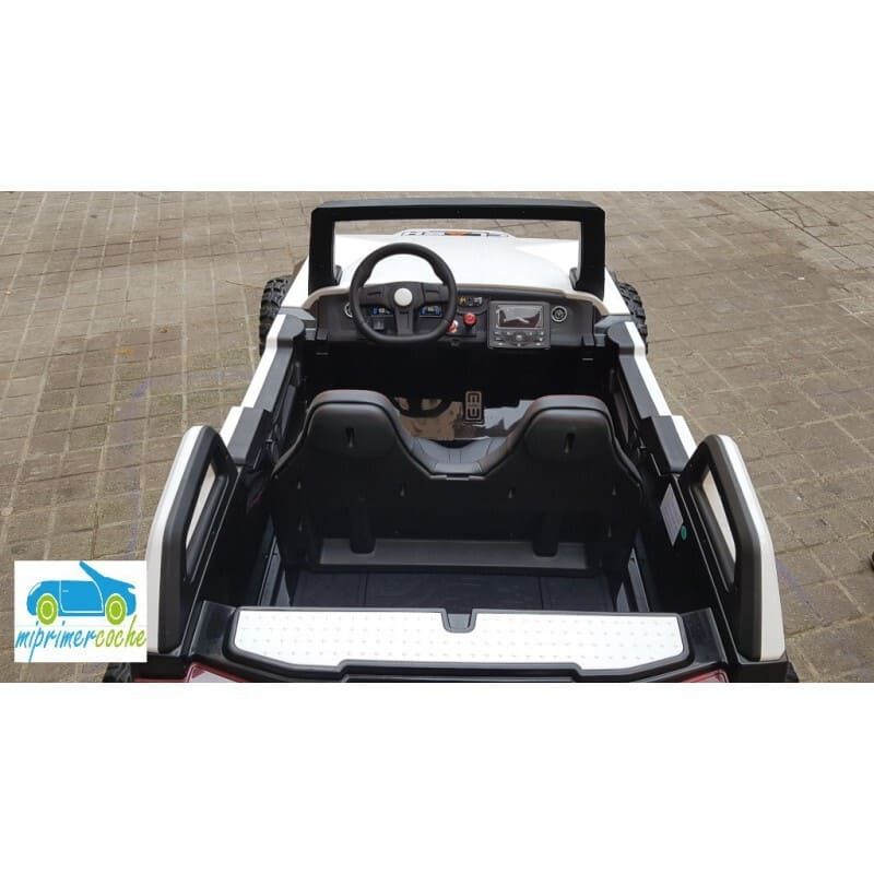 Un todoterreno que puede con todo , con 4 motores 24v , ruedas de caucho lo que le permite ir por todos los terrenos y capaz de soportar hasta 100 kilos .Equipado también con asiento muy espacioso acolchado en polipiel y con soportes extraíbles bajo el asiento , puede transportar hasta 4 niños a la vez . También este modelo dispone de pantalla MP4 y ventiladores que simulan el aire acondicionado .