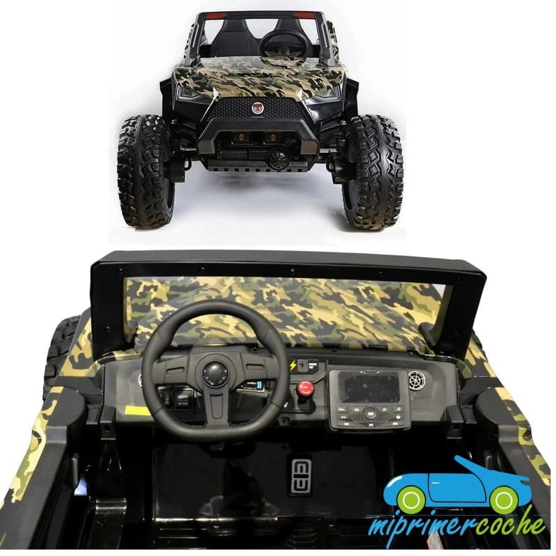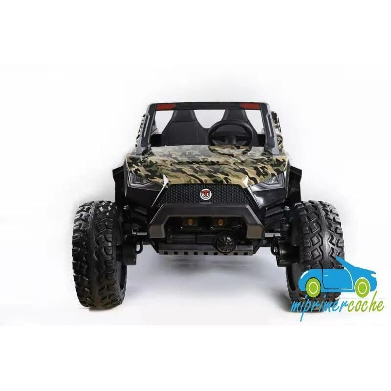 Un todoterreno que puede con todo , con 4 motores 24v , ruedas de caucho lo que le permite ir por todos los terrenos y capaz de soportar hasta 100 kilos .Equipado también con asiento muy espacioso acolchado en polipiel y con soportes extraíbles bajo el asiento , puede transportar hasta 4 niños a la vez . También este modelo dispone de pantalla MP4 y ventiladores que simulan el aire acondicionado .