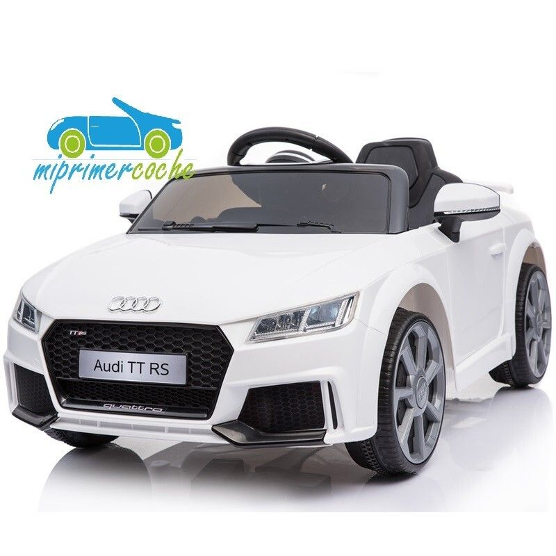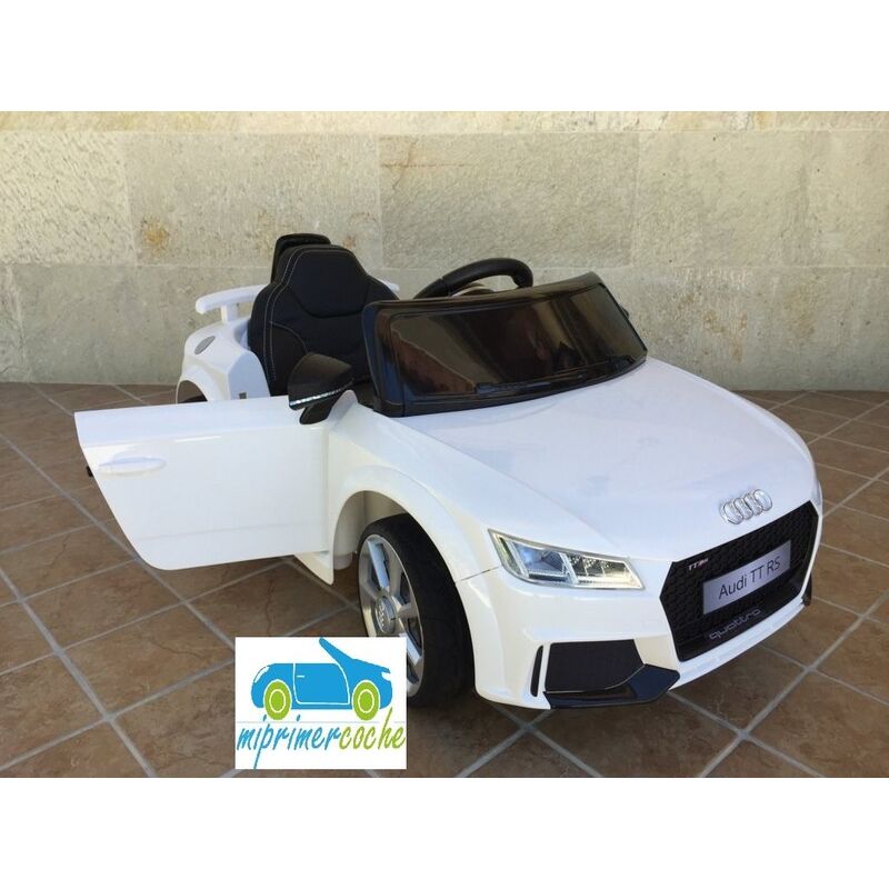 Coche eléctrico para niños AUDI TT RS BLANCO 12V con mando parental 2.4G , ruedas de caucho, equipo de música , puertas que se abren , 2 motores .
