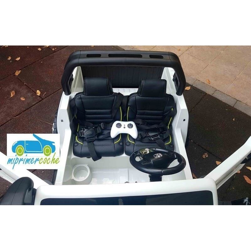 Un todoterreno que puede con todo, con 4 motores 12v 45w, ruedas de caucho, lo que le permite ir por todos los terrenos y capaz de soportar hasta 50 kilos. Equipado también con 2 asientos acolchados en polipiel y con ruedas de caucho, puede transportar hasta 2 niños a la vez .