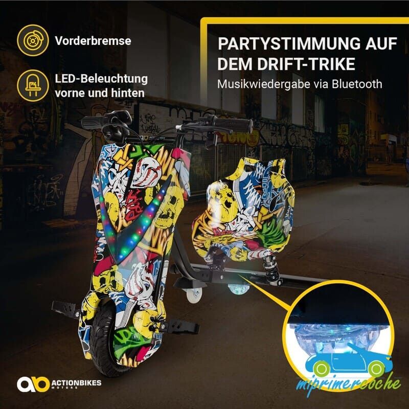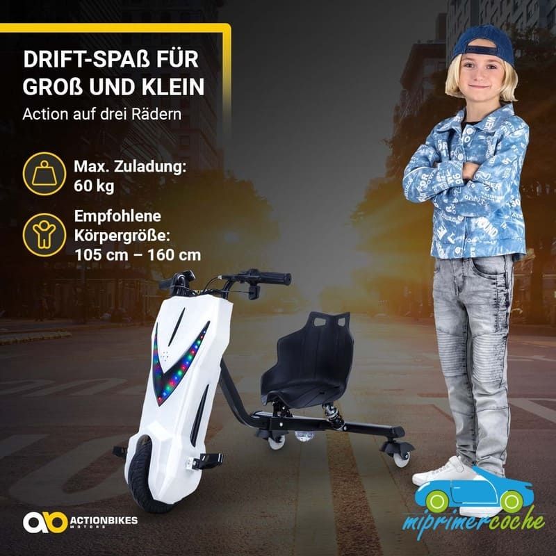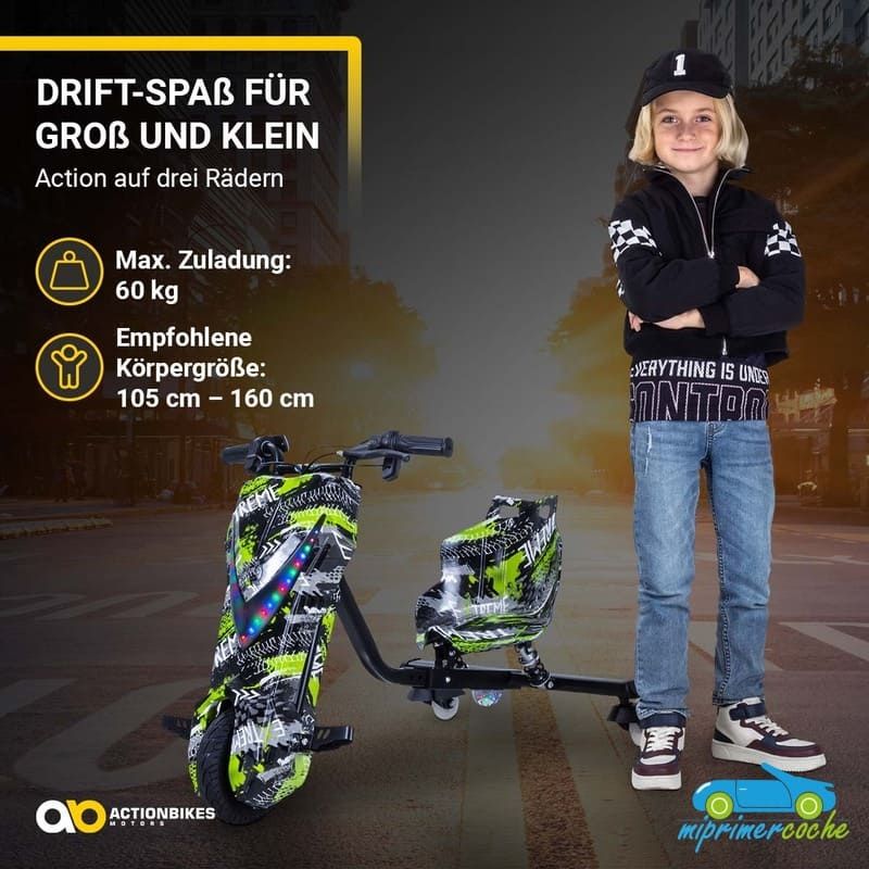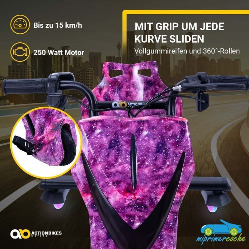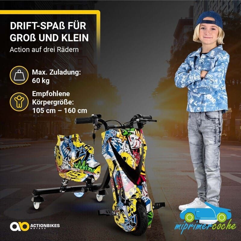 Los niños están llenos de aventura y espíritu de descubrimiento: ¡el triciclo eléctrico de deriva de ofrece el material perfecto para ello! Se garantizan horas de diversión y trucos impresionantes. Las ruedas especiales de 360° del triciclo permiten derrapar rápidamente . Con el motor de 250 vatios, el drift scooter alcanza una velocidad de hasta 15 km/h. Pero no te preocupes, siempre puedes controlar la seguridad de tus hijos : con el interruptor del acelerador puedes determinar la velocidad del triciclo eléctrico para niños. El triciclo de deriva también tiene una bocina y un freno delantero. Nada se interpone en el camino de una diversión segura : con ruedas LED intermitentes, un frente brillante, música animada y un diseño llamativo, el patinete eléctrico Drift hace que los corazones de los niños latan más rápido