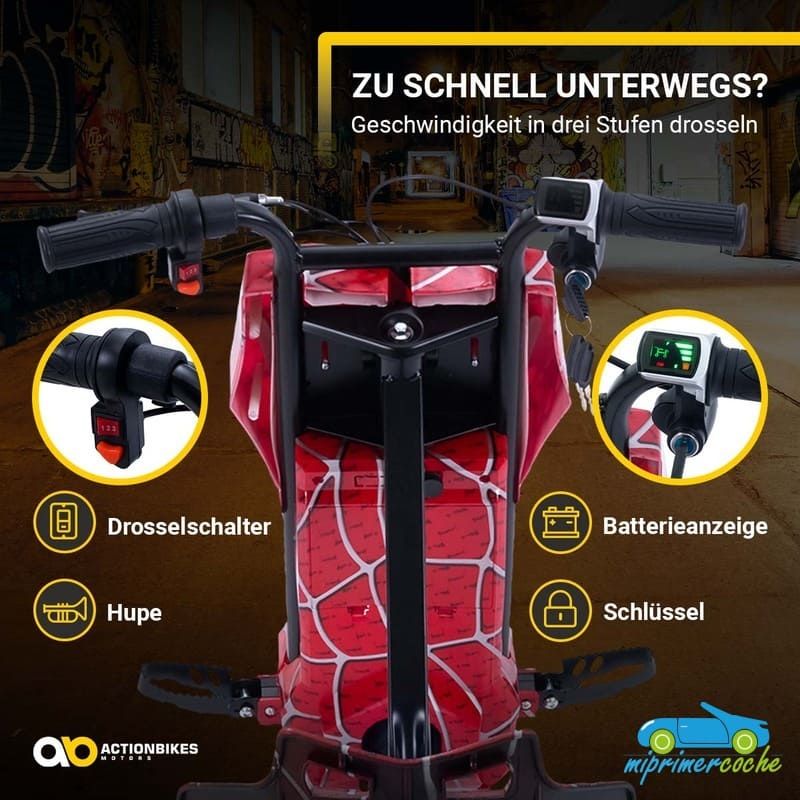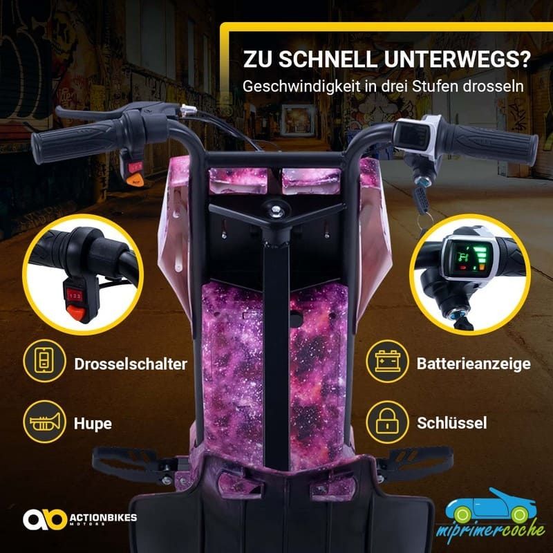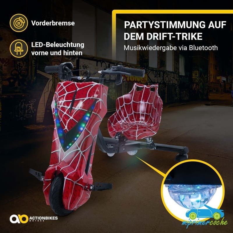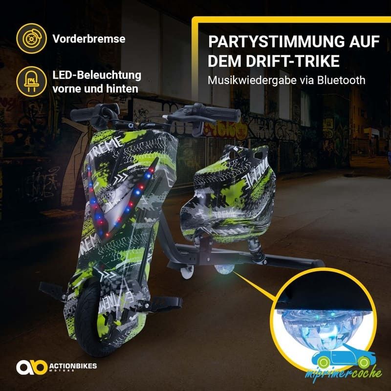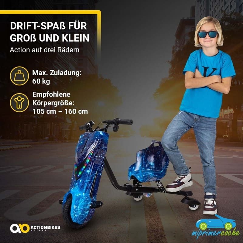 Los niños están llenos de aventura y espíritu de descubrimiento: ¡el triciclo eléctrico de deriva de ofrece el material perfecto para ello! Se garantizan horas de diversión y trucos impresionantes. Las ruedas especiales de 360° del triciclo permiten derrapar rápidamente . Con el motor de 250 vatios, el drift scooter alcanza una velocidad de hasta 15 km/h. Pero no te preocupes, siempre puedes controlar la seguridad de tus hijos : con el interruptor del acelerador puedes determinar la velocidad del triciclo eléctrico para niños. El triciclo de deriva también tiene una bocina y un freno delantero. Nada se interpone en el camino de una diversión segura : con ruedas LED intermitentes, un frente brillante, música animada y un diseño llamativo, el patinete eléctrico Drift hace que los corazones de los niños latan más rápido